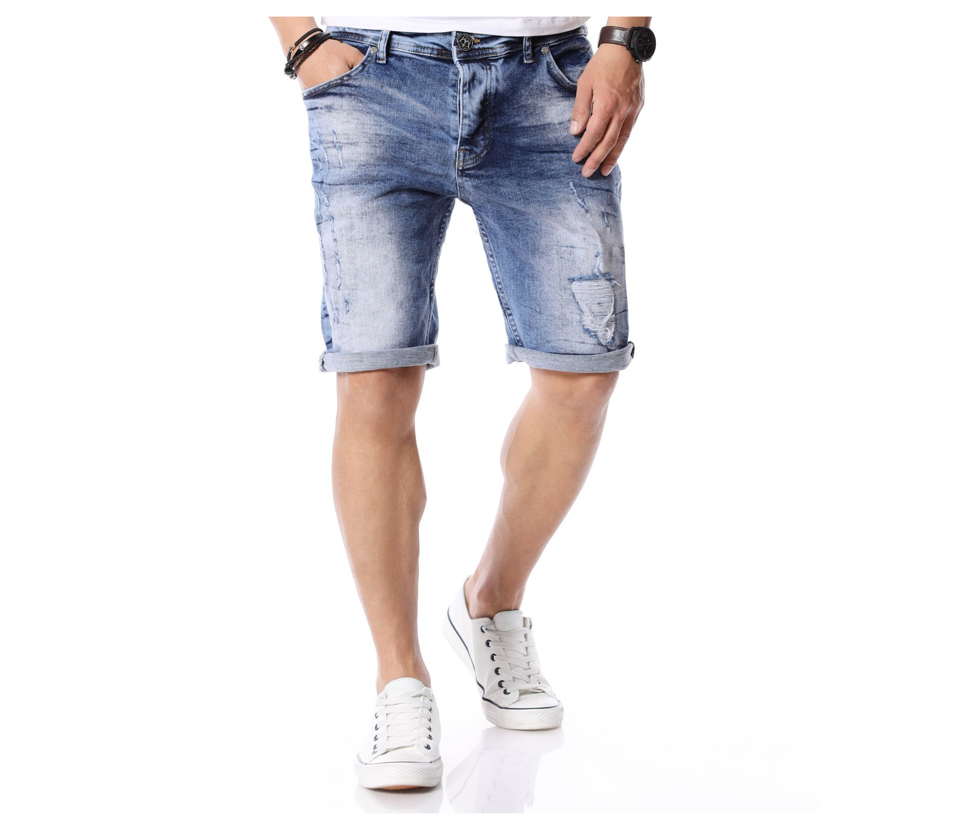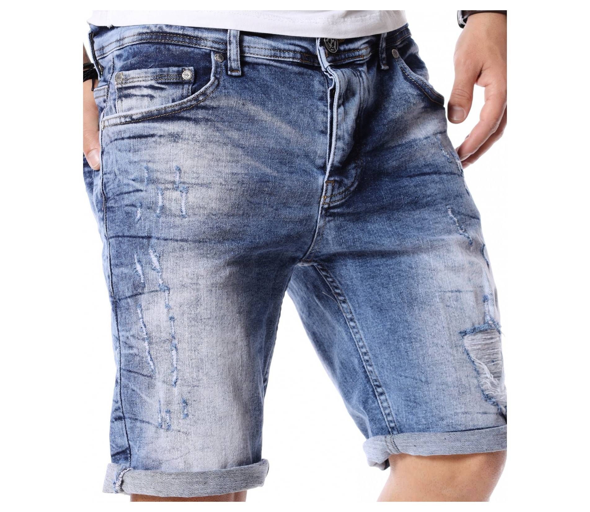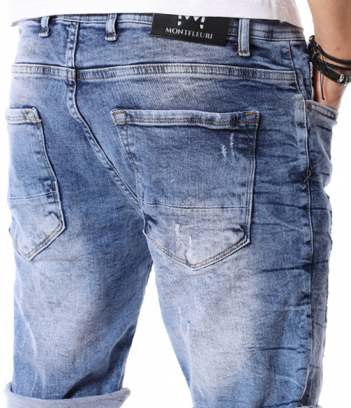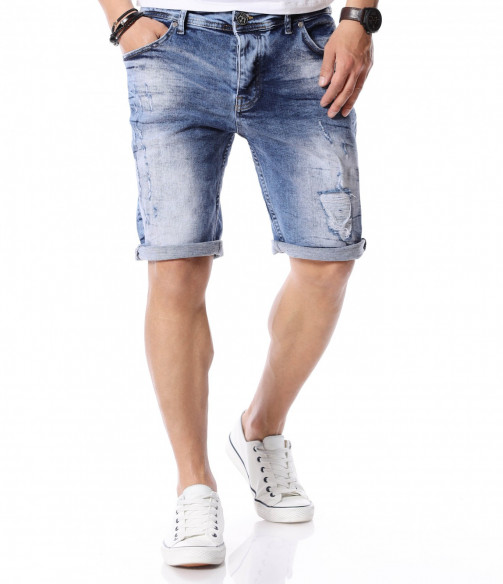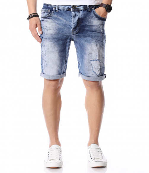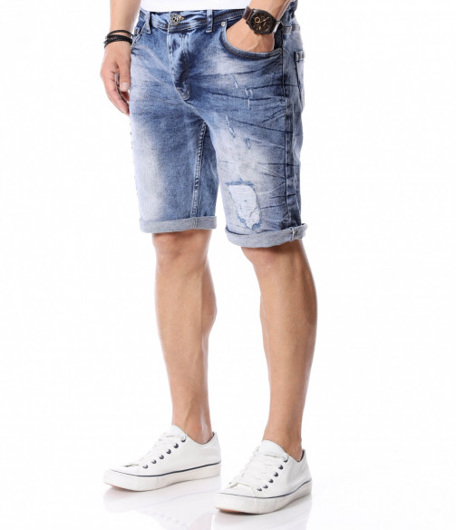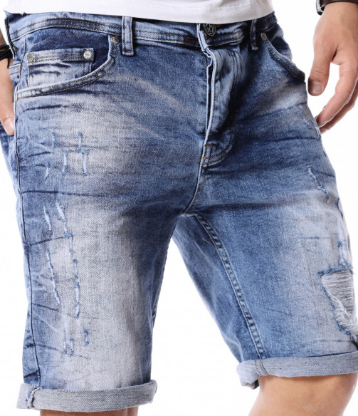 За да се придържаме към новите модни тенденции, този сезон сме ви подбрали актуален и най-предпочитан модел къси дънки. Те са задължителни за всеки мъжки гардероб и намират голямо приложение в ежедневието. Подготвили сме ви - изразителни, къси мъжки дънки в синята гама с преливащи се от тъмни към светли нюанси и накъсани фабрично, на места елементи. Кройката е вталена, следваща линиите на тялото, и същевременно даваща достатъчно свобода на движение, багодарение на меката си памучна материя. В предната и в задната част са разположени стандартни джобове, а закопчаването се състои в метален цип и копче на талията. Напълно подходящи за изграждане на свежа лятна визия и може да ги съчетаете с тениска и подходящи кецове.