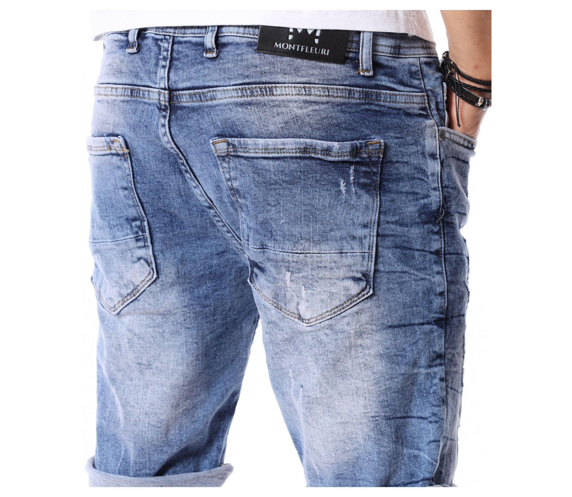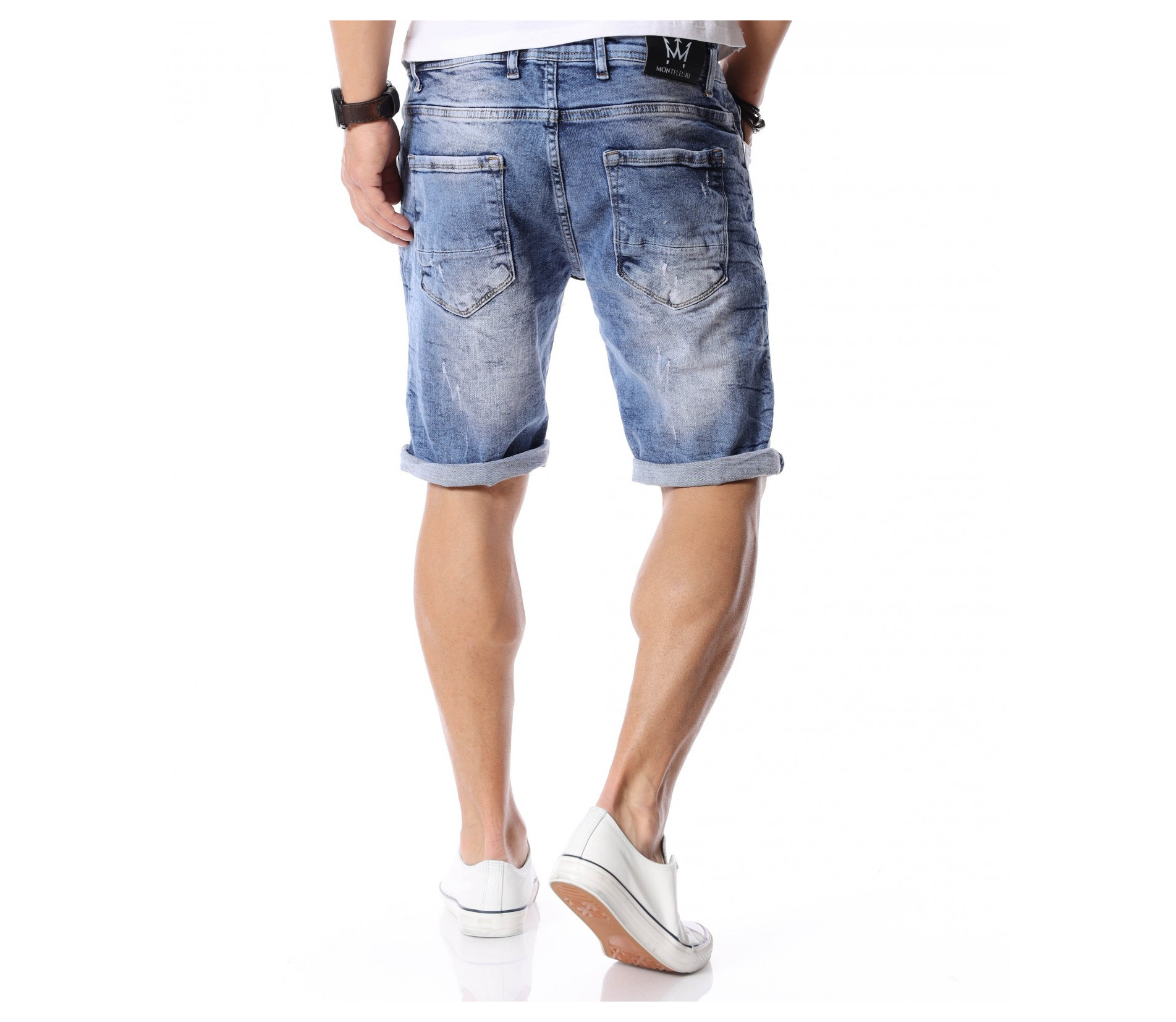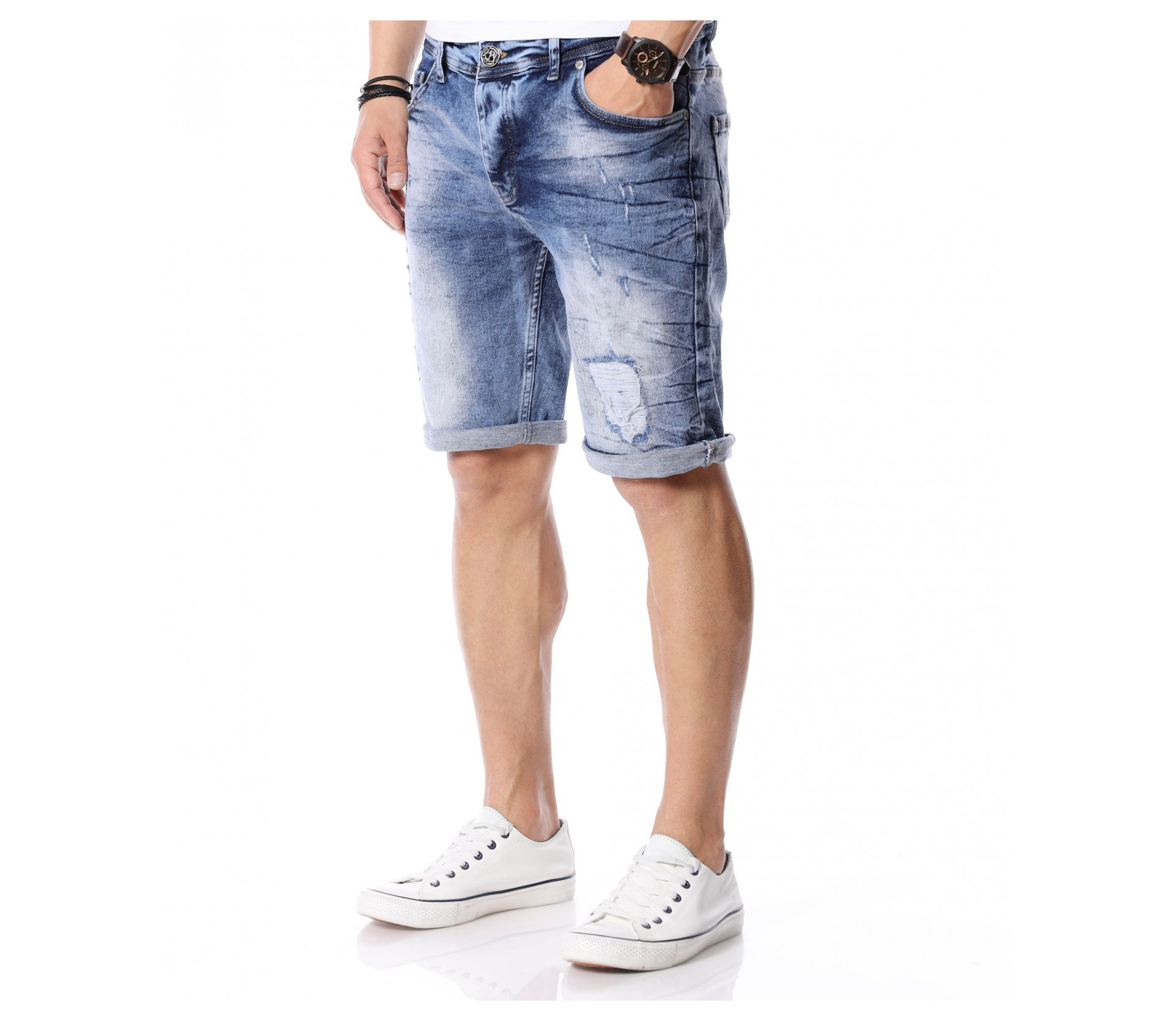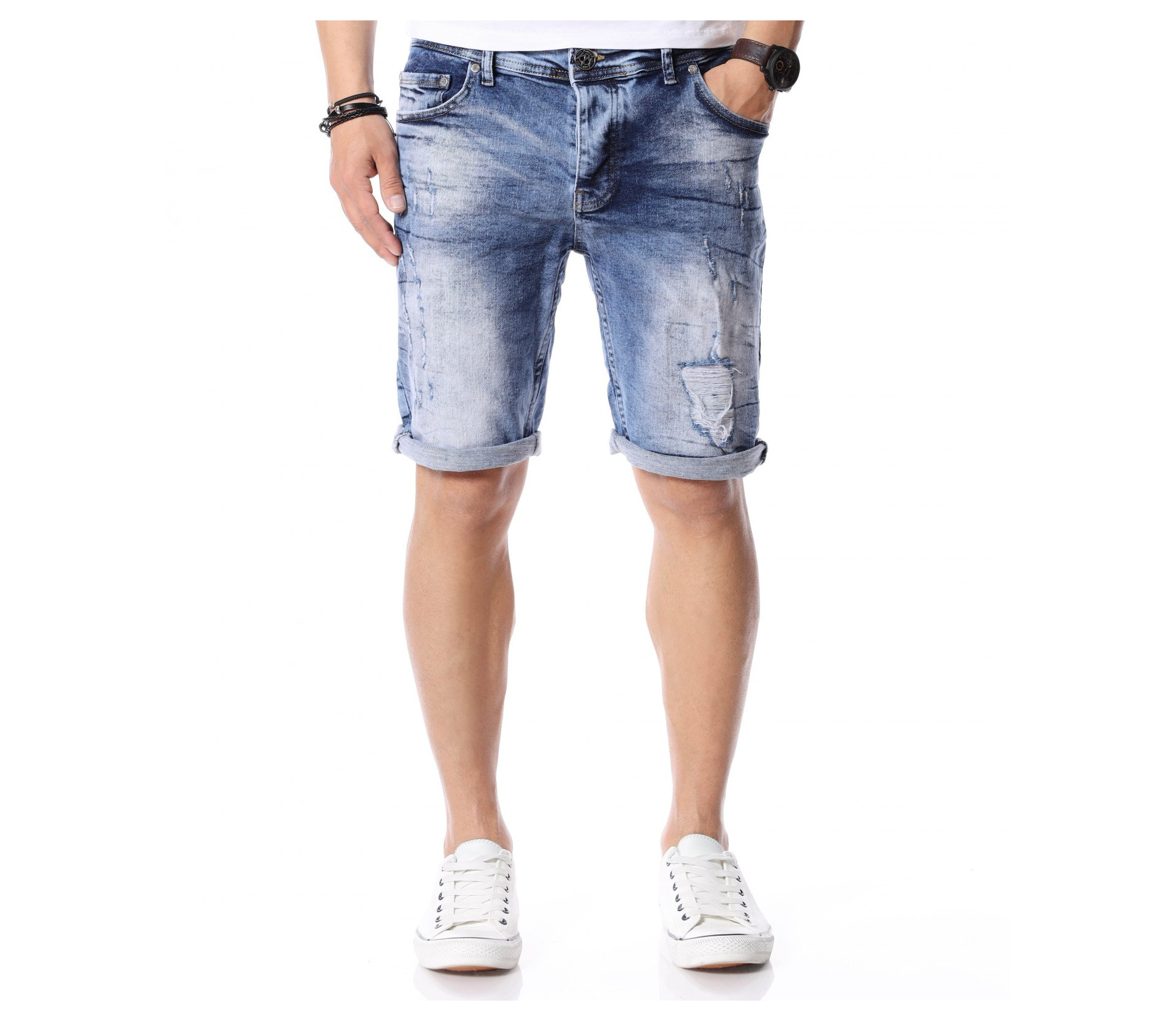 За да се придържаме към новите модни тенденции, този сезон сме ви подбрали актуален и най-предпочитан модел къси дънки. Те са задължителни за всеки мъжки гардероб и намират голямо приложение в ежедневието. Подготвили сме ви - изразителни, къси мъжки дънки в синята гама с преливащи се от тъмни към светли нюанси и накъсани фабрично, на места елементи. Кройката е вталена, следваща линиите на тялото, и същевременно даваща достатъчно свобода на движение, багодарение на меката си памучна материя. В предната и в задната част са разположени стандартни джобове, а закопчаването се състои в метален цип и копче на талията. Напълно подходящи за изграждане на свежа лятна визия и може да ги съчетаете с тениска и подходящи кецове.