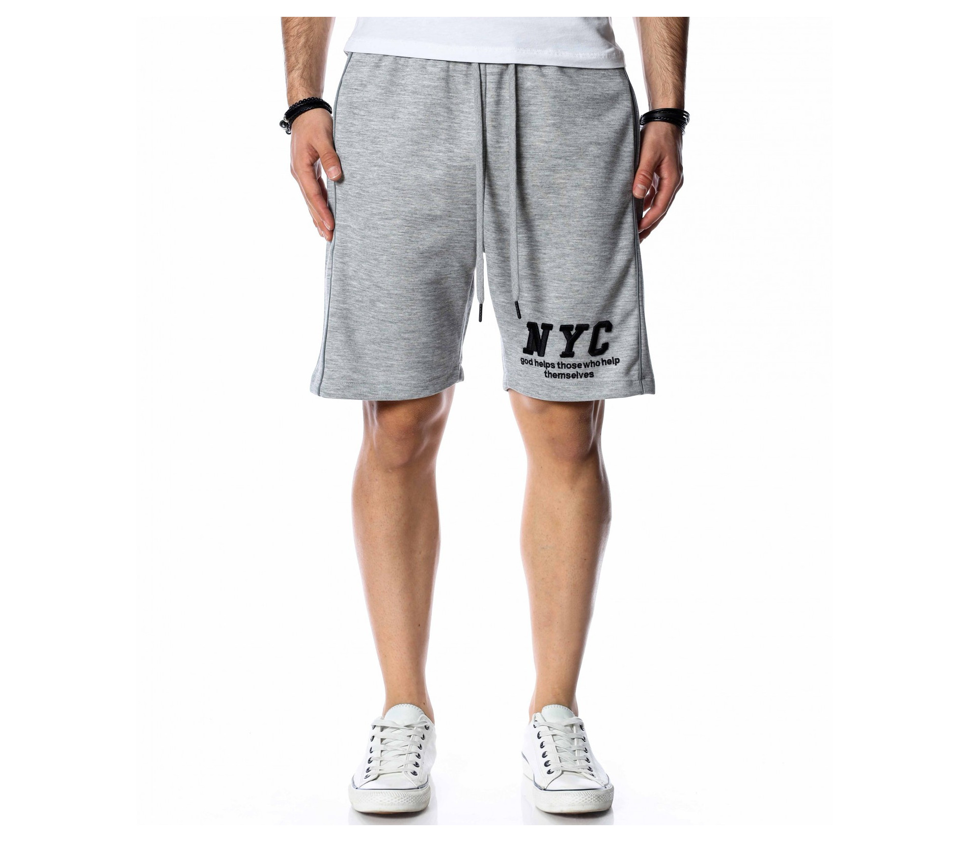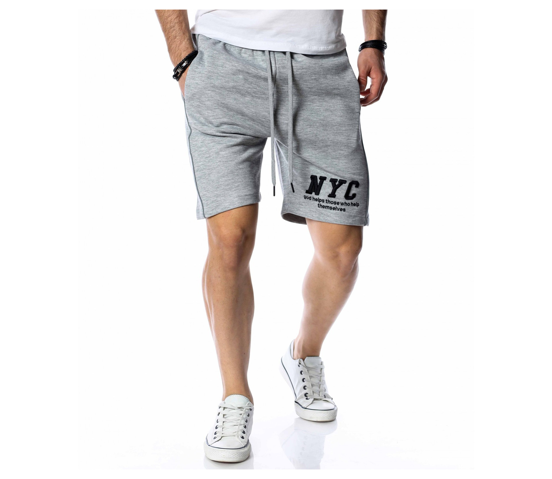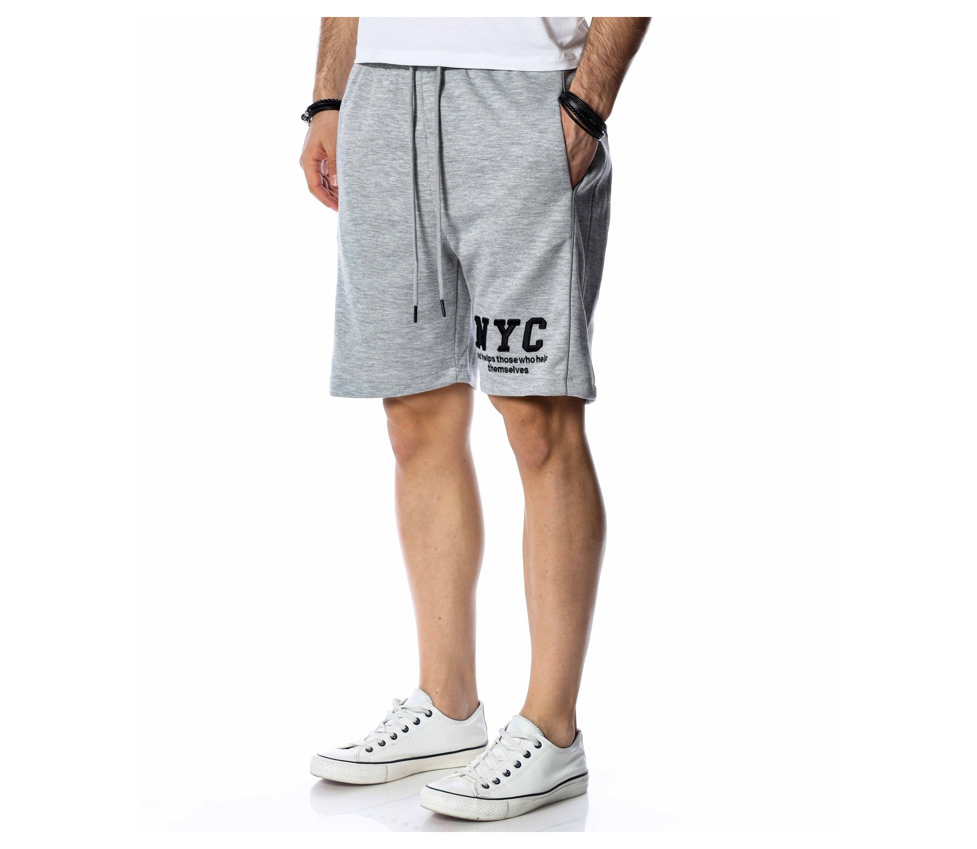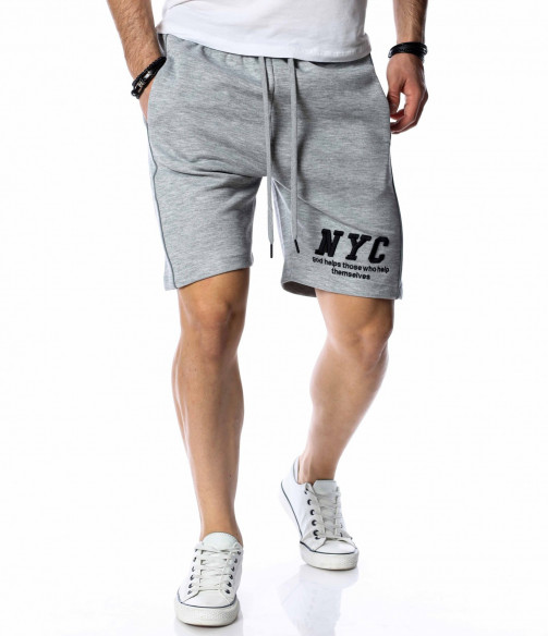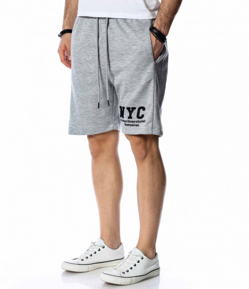 ОПИСАНИЕ НА ПРОДУКТА: Мъжки памучни къси панталони в наситено сив или черен цвят. Изключително удобен модел, подходящ за ежедневието. Ако си почитател на спортната визия този модел е точно за теб. Кройката на късите панталони е свободна, с леко паднало дъно. Крачолите са широки, осигурявайки комфорт и непринудена свобода при движение. Дължината е до коляното. Върху предната страна са поставени два джоба, тип \"италиански\", както и декорация с големи букви NYC на единият крачол. В областта на кръста има широк ластик с връзки за допълнително стягане. Заложи на удобството с модел от атрактивна спортна линия. Комбинирай с тениска в цветен нюанс и кецове за завършване на твоята визия.