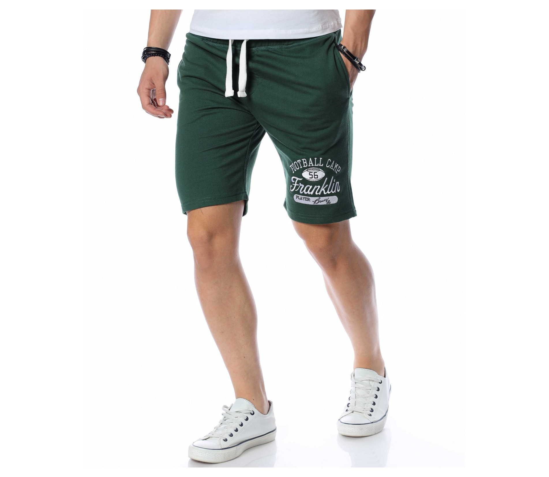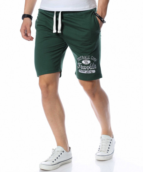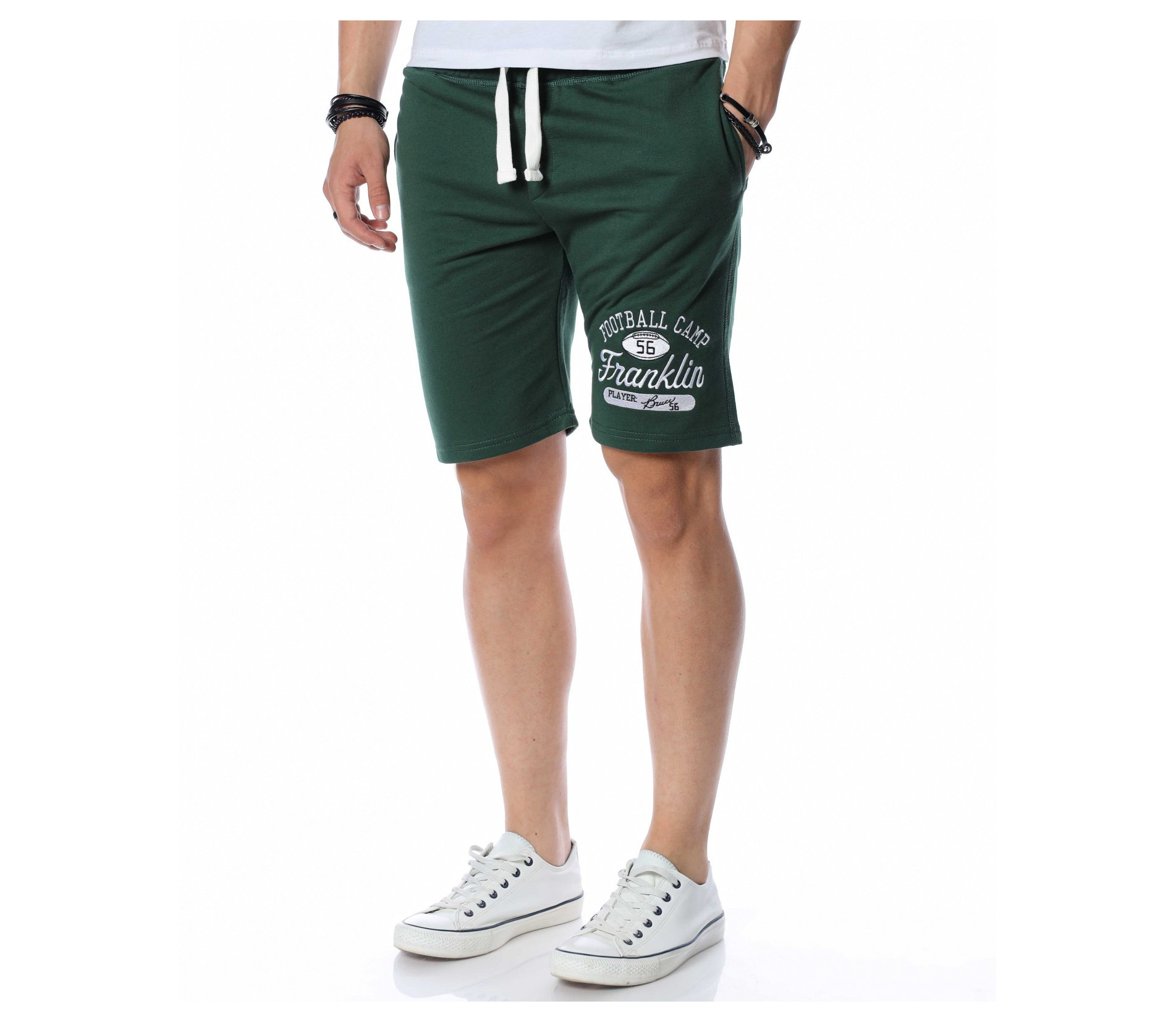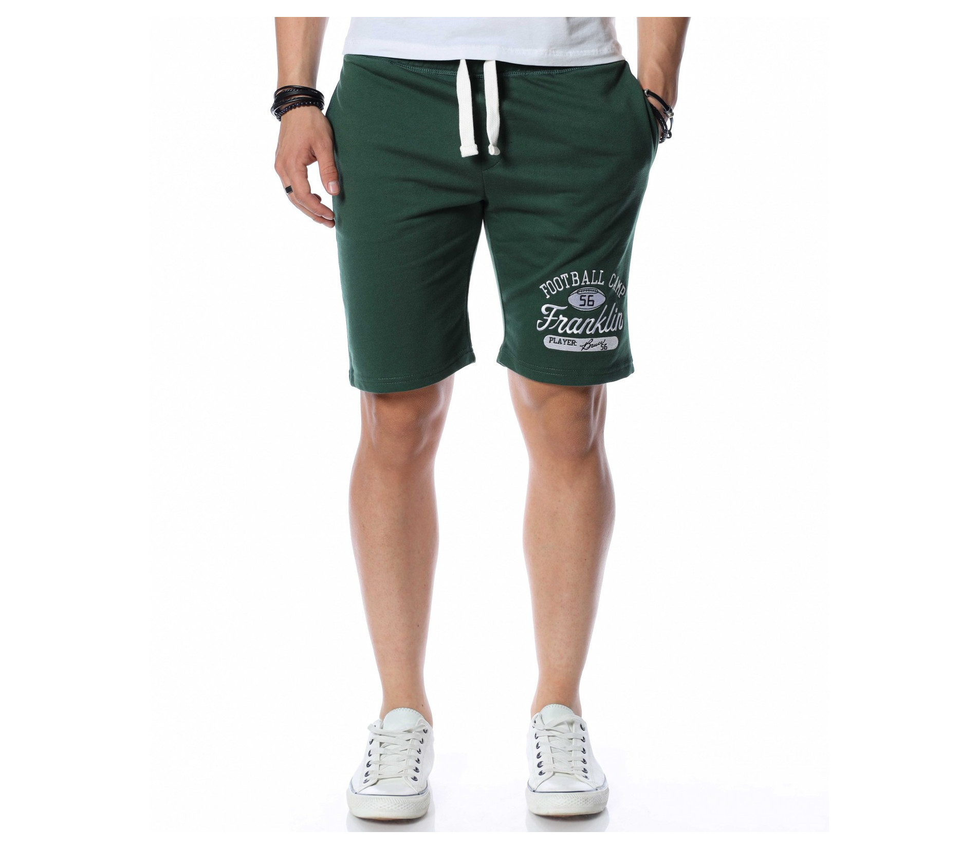 ОПИСАНИЕ НА ПРОДУКТА: Модерни, семпли и удобни - с тези думи съвсем смело можем да опишем този модел мъжки къси памучни панталони, чиито десен е представен в две цветови предложение – зелен и черен. Комфорта идва от това, че късите панталонки са с ластик на кръста и връзки за допълнително стягане. Изработени са качествена, памучна и мека материя, която осигурява свобода на движенията. В предната част са поставени два джоба, тип италиански, а в задната страна джоба е един със стандартна форма. Върху единия крачол, в неговата долна част е поставена емблема и релефни надписи в различен шрифт. Кройката на модела е леко вталена. Бъди атрактивен в класически модни къси спортни панталони. Комбинирай по твой вкус за един неподражаем стайлинг.