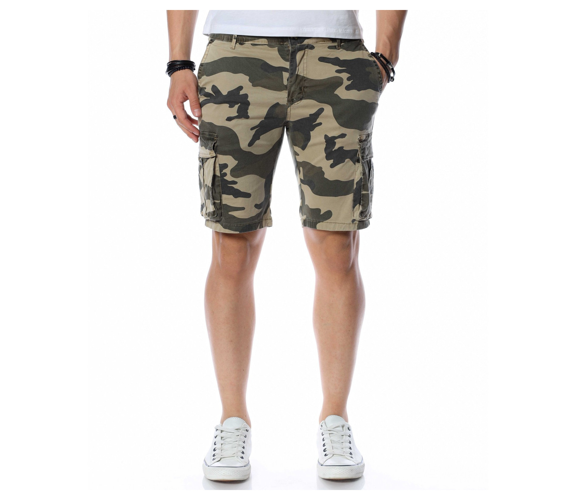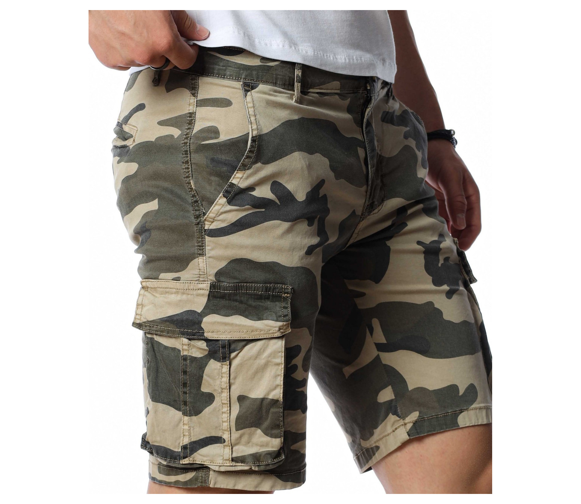 ОПИСАНИЕ НА ПРОДУКТА: Екстравагантни мъжки къси панталони от камуфлажен плат. Любимият и актуален на всички милитъри стил е силно изразен в  тези мъжки панталонки в лицето на три разновидности, всяка една от които впечатлява по еднакво атрактивен начин. Ако си фен на по-различните модели, то този е точно за теб. Кройката му е малко по-свободна, като това се изразява чрез правите крачоли, свободно падащи надолу. Дължината им е до коляното, а отстрани имат големи спортни джобове с капаци. В предната част има два джоба, тип италиански, а задните джобове отново са два с класическа форма. Основното закопчаване е с цип под кант и метално копче. Експериментирай този сезон със стила и заложи на топ десените за пролет-лято 2022 г.
