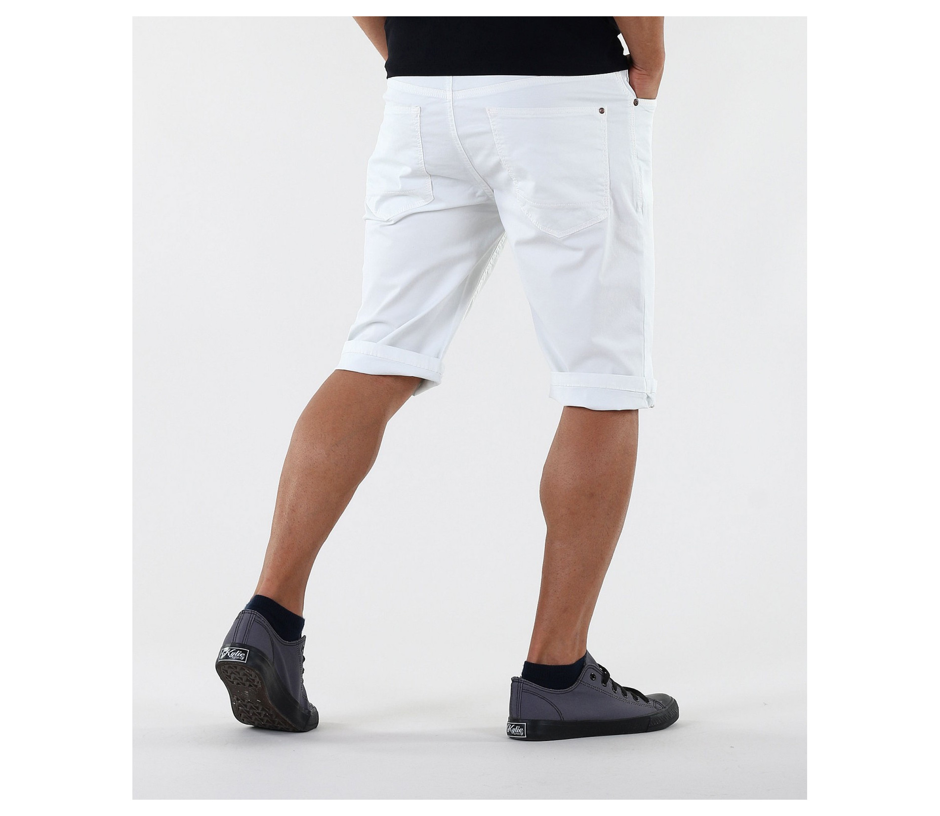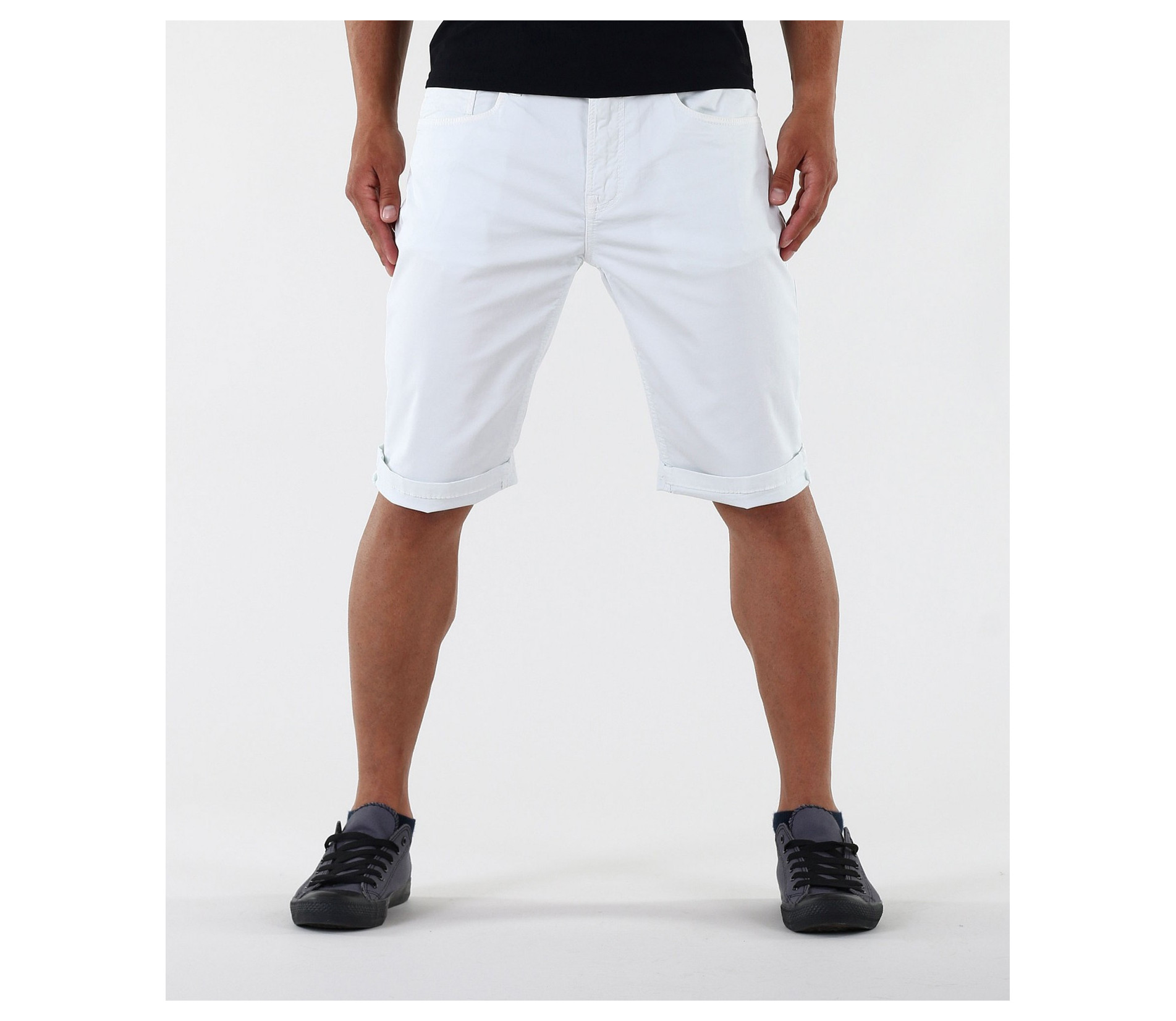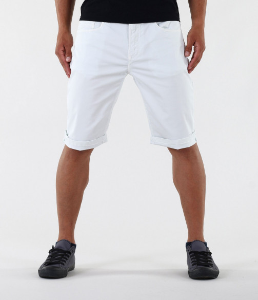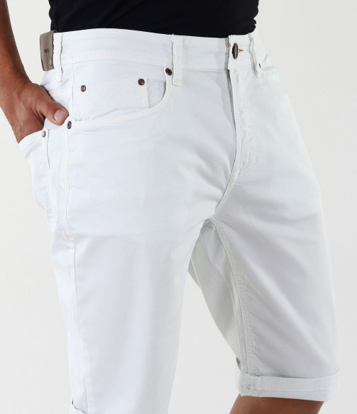 Описание на продукта: Стилен модел мъжки бели къси панталони. Дължината на панталоните покрива коляното. Моделът е напълно изчистен, като акцент падат тъмните копчета и капси. В предната и задната част са поставени по два дълбоки джоба. Панталонките са с възможност за навиване, което Ви позволява да регулирате дължината им по Ваш вкус. Кройката на този модел е леко вталена с по-голяма дълбочина. Закопчаването е с цип и копче. Напълно изчистения десен позволява да ги съчетаете с широка гама от цветове и стилове. В комбинация с цветен тишърт, стилни кецове и колан като аксесоар, Вие получавате перфектно завършена и модерна cool визия.