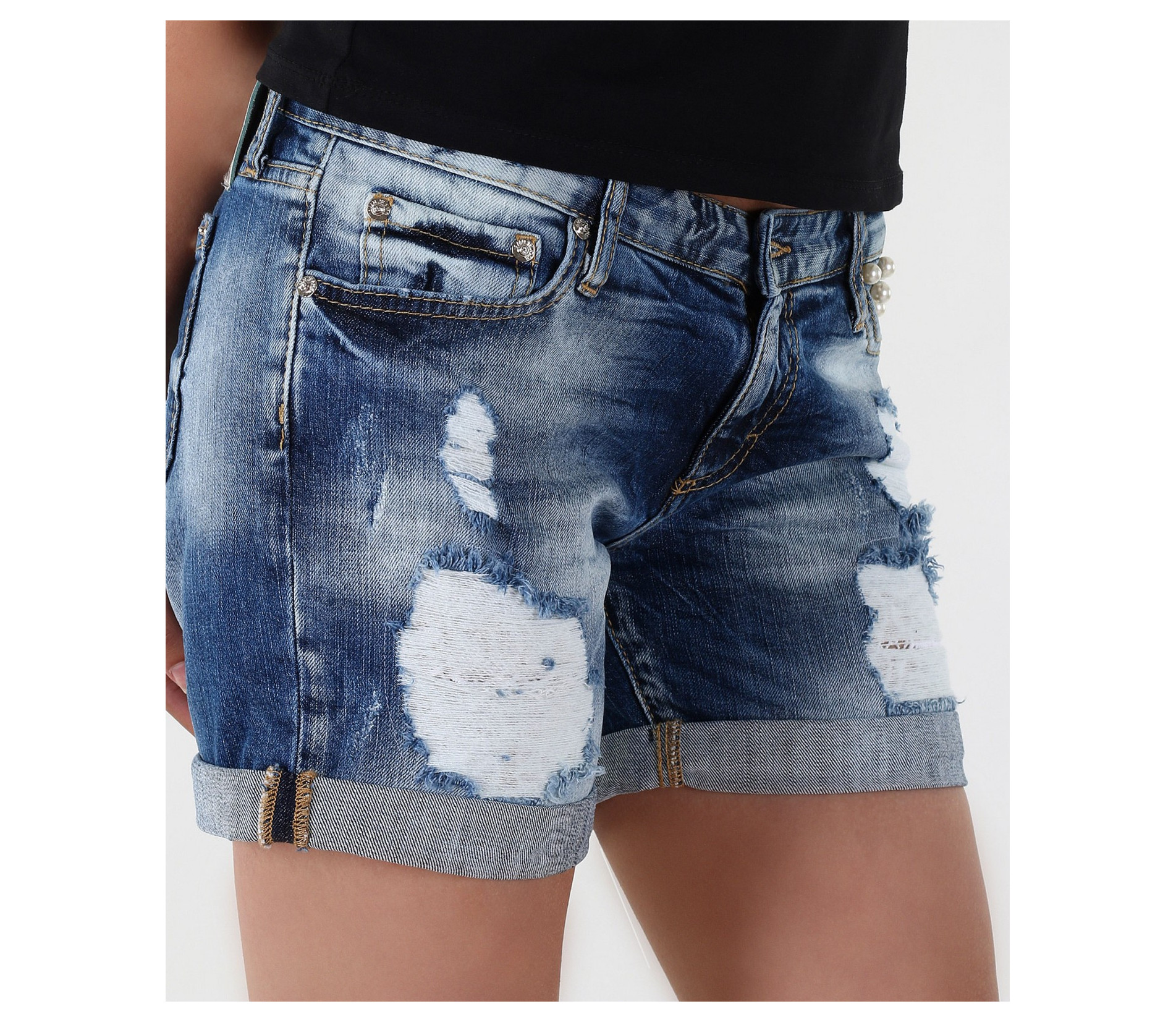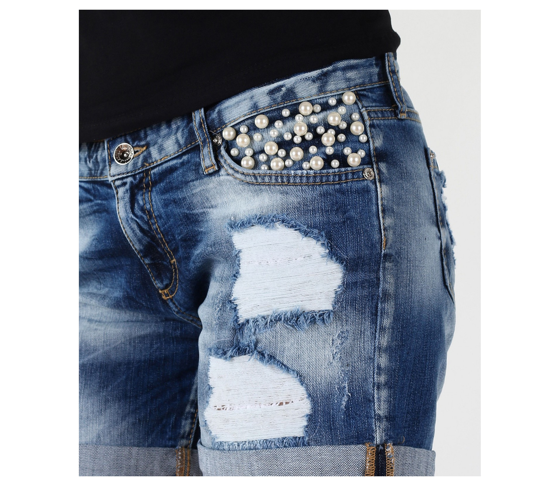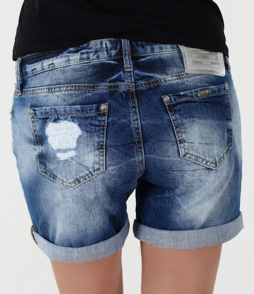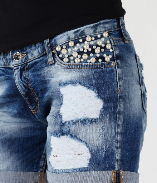 Страхотни къси дънкови панталонки подходящи за летният сезон. Моделът има големи бели перли, който са капсоловани, в областта на предният джоб. В задната част панталонките са изчистени с кръмпа на единият джоб. Състав 98% памук, 2% еластан. Гарантирано качество