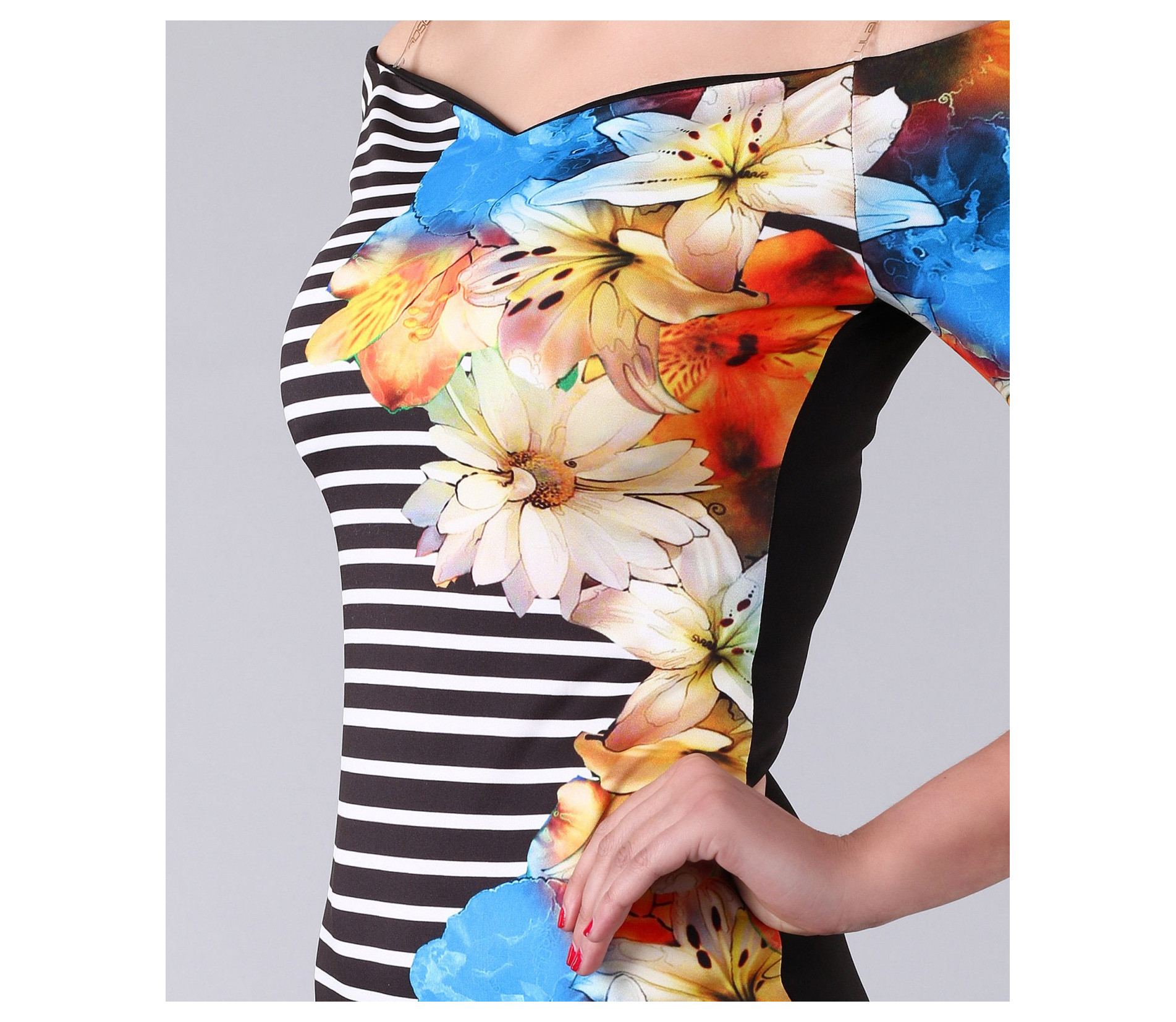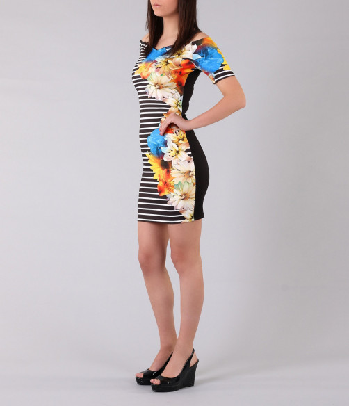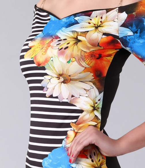Представяме Ви дамска къса рокля с паднали рамене.Гърбът и е изчистено черен.Акцентът на роклята пада в предната част. Комбинация от раета и цветя прави модела нустоим. Стилна и перфектно подчертаваща женските форми. Роклята е изработена от 95%полиестер и 5%ликра. Моделът е напълно завършен в комбинация с високи дамски обувки, платформи или ток въпрос на вкус.