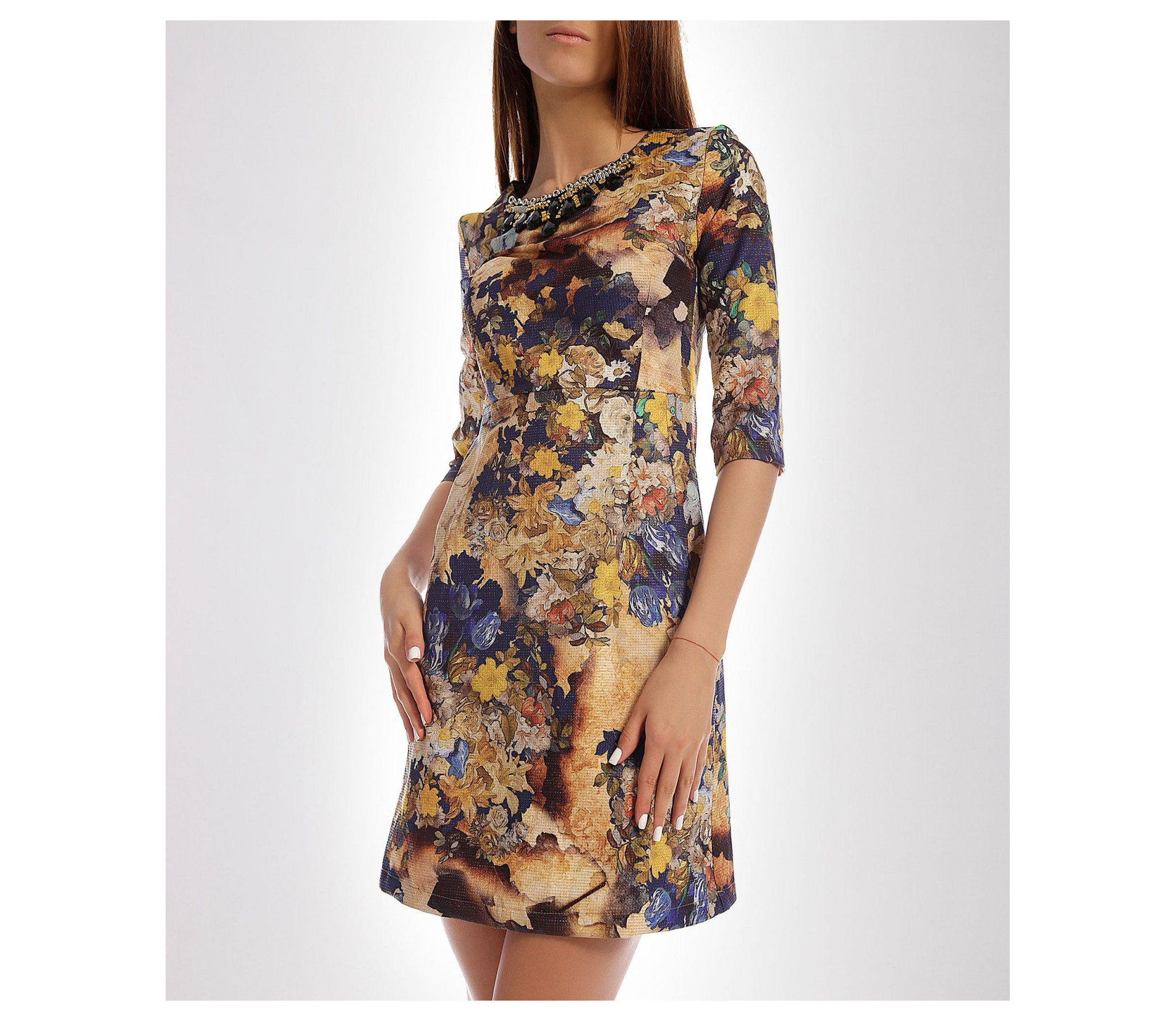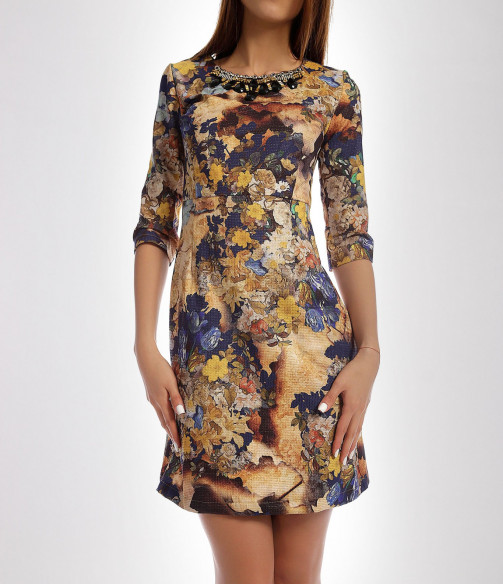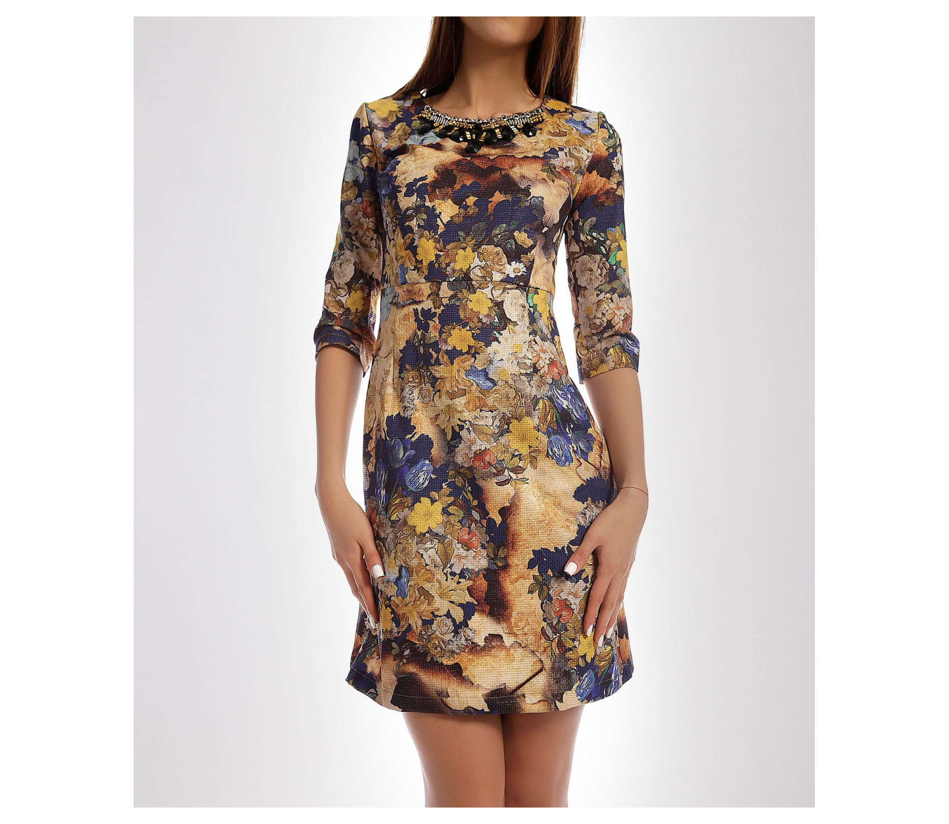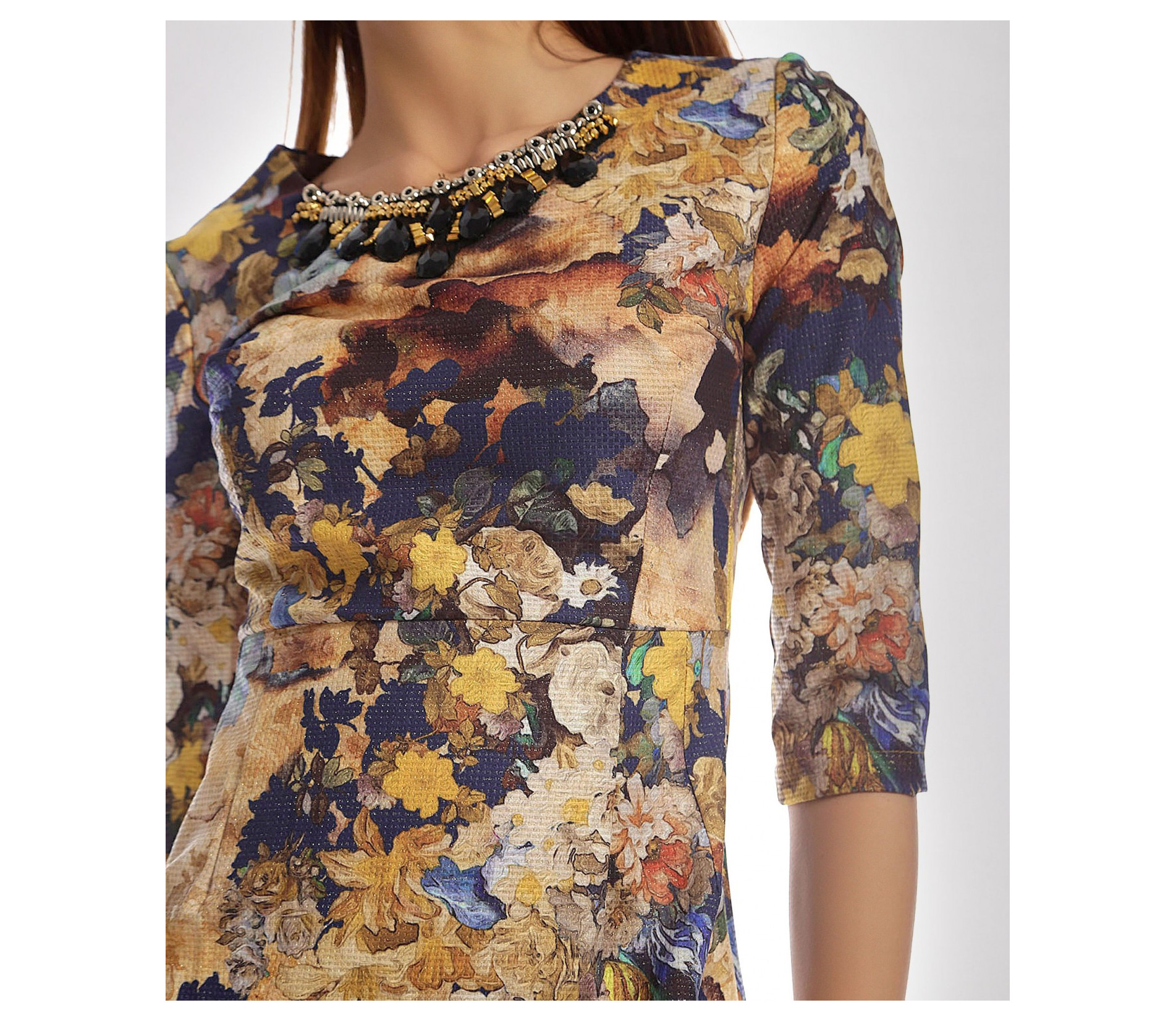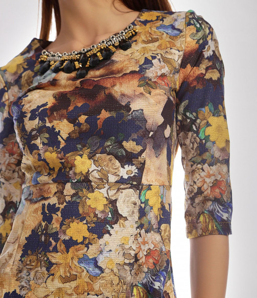 Дамска разкроена от талията рокля на цветя в есенни цветове. Върху деколтето е пришит накит с черни и камъни и златисти маниста. Колекция Есен/Зима 2014