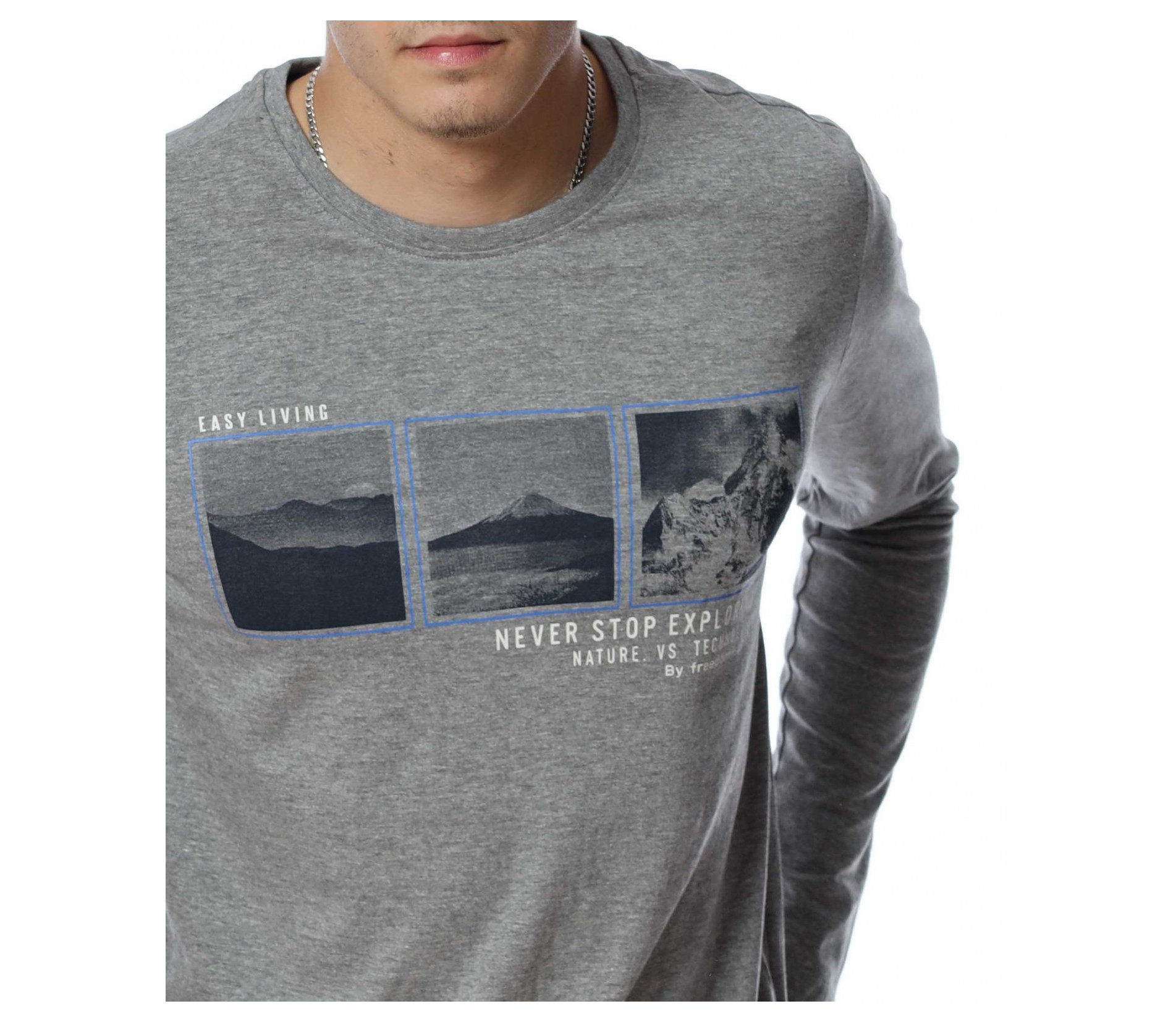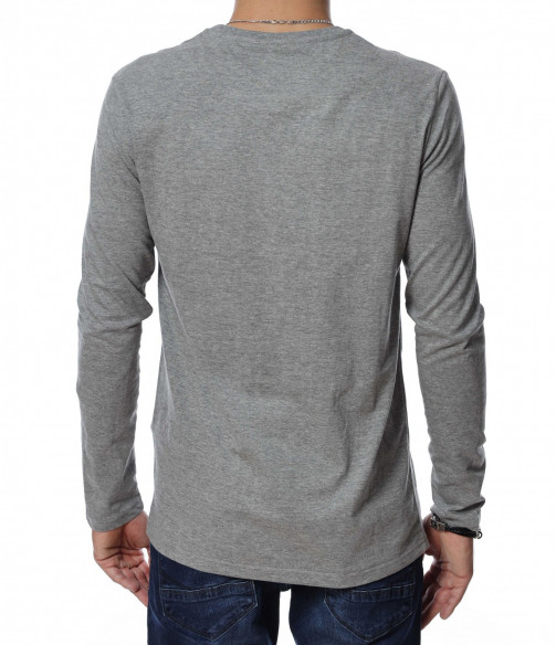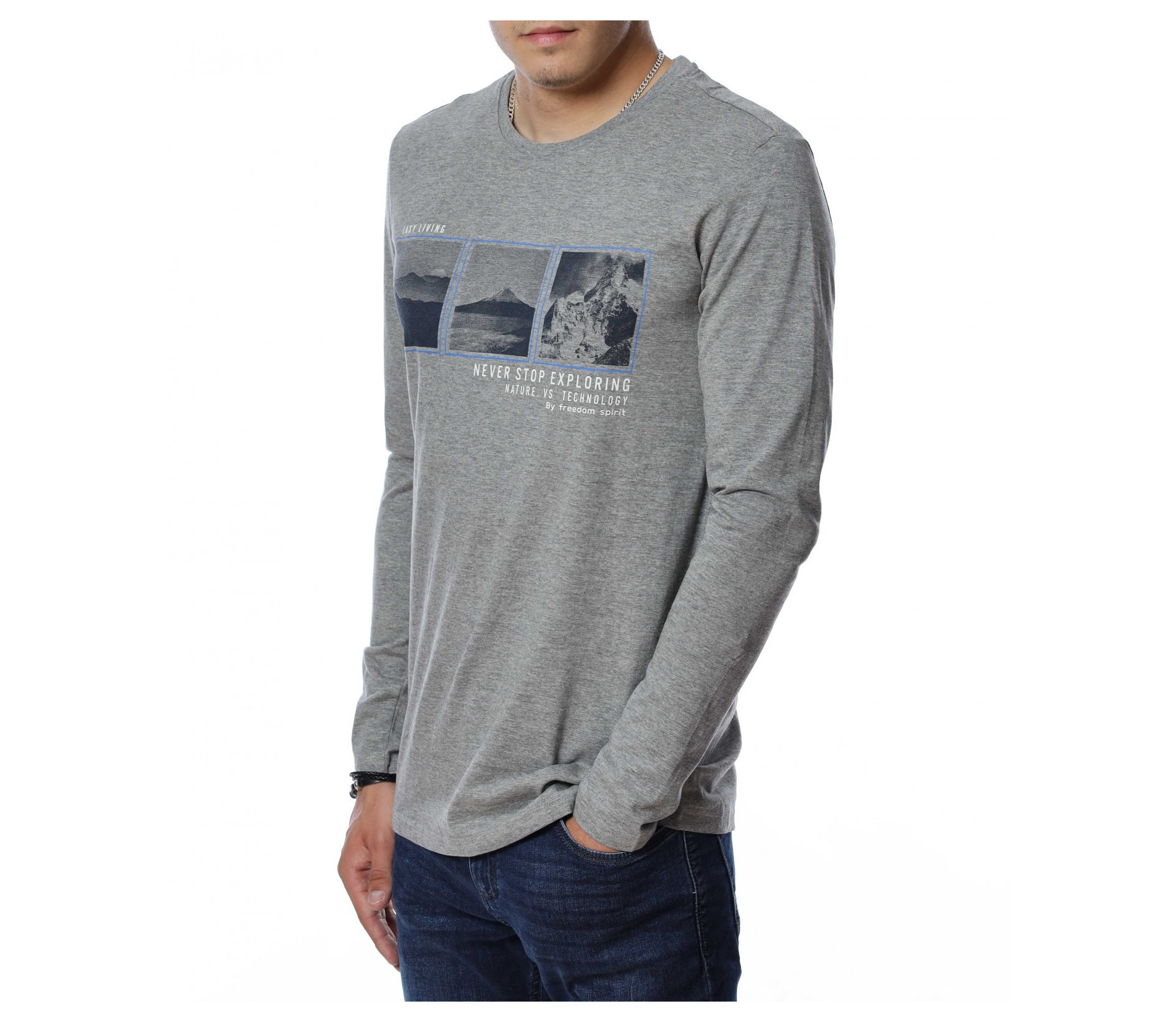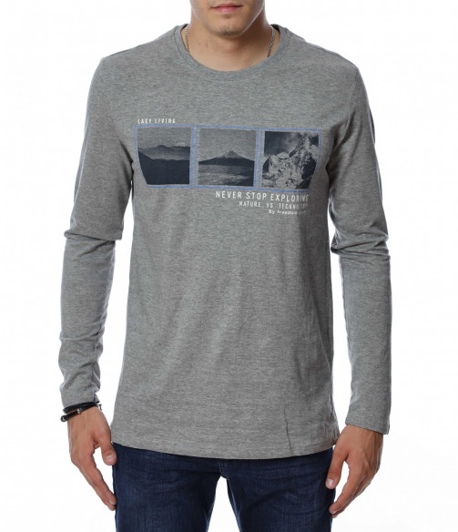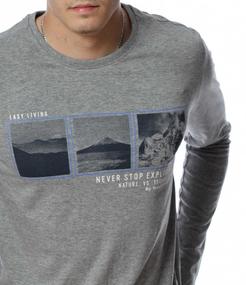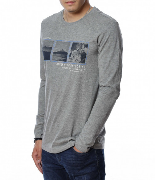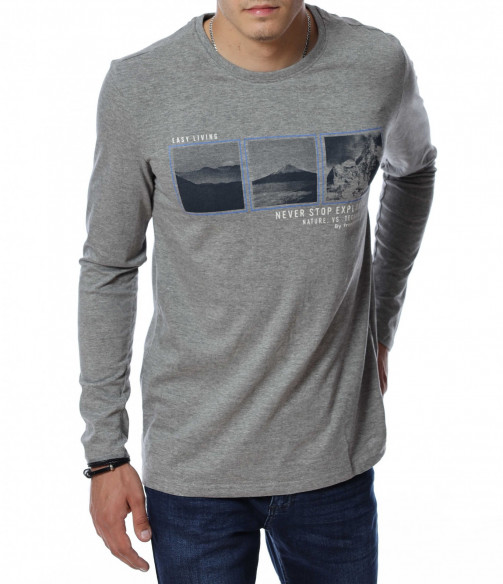 Мъжка блуза с дълъг ръкав. В средната част е добавена щампа с три изображения и надписи. Дължината е покриваща колана. Задната част е изчистена от детайли и декорации. Изработена от мека, памучна материя и вискоза. Комбинирайте с карго панталон, дънки, маратонки, кецове, подходящи обувки и любим аксесоар и няма да сбъркате с вашият аутфит.