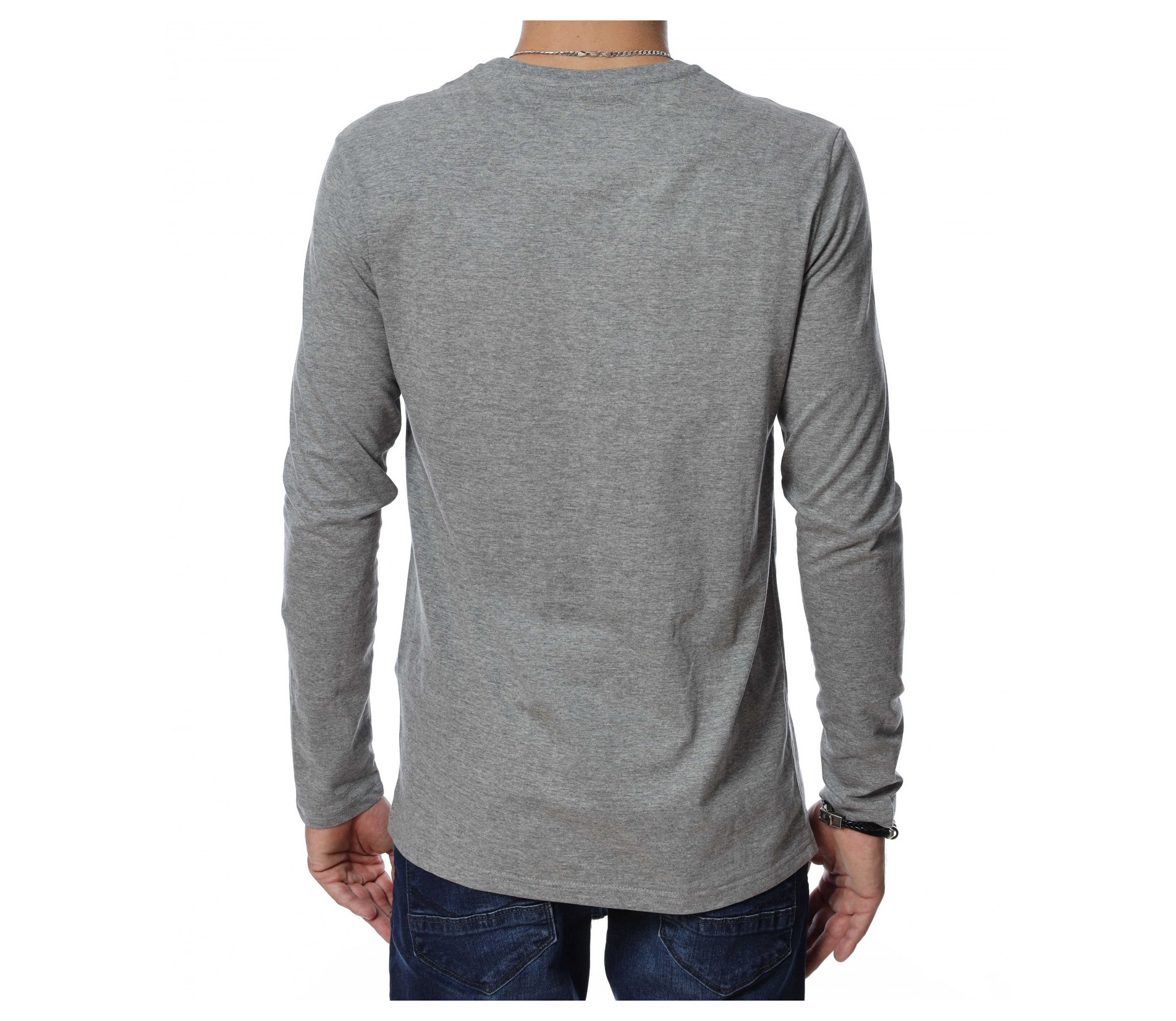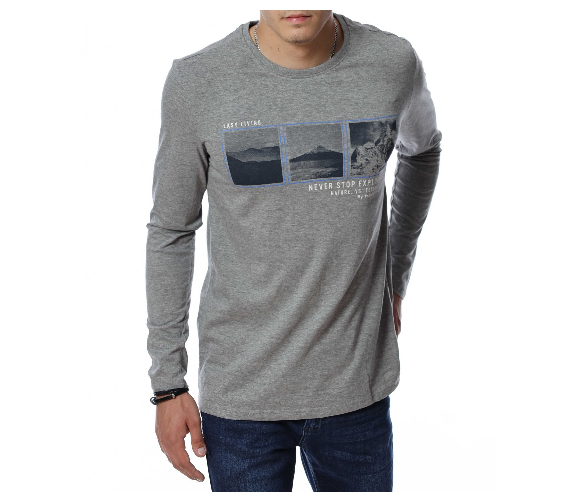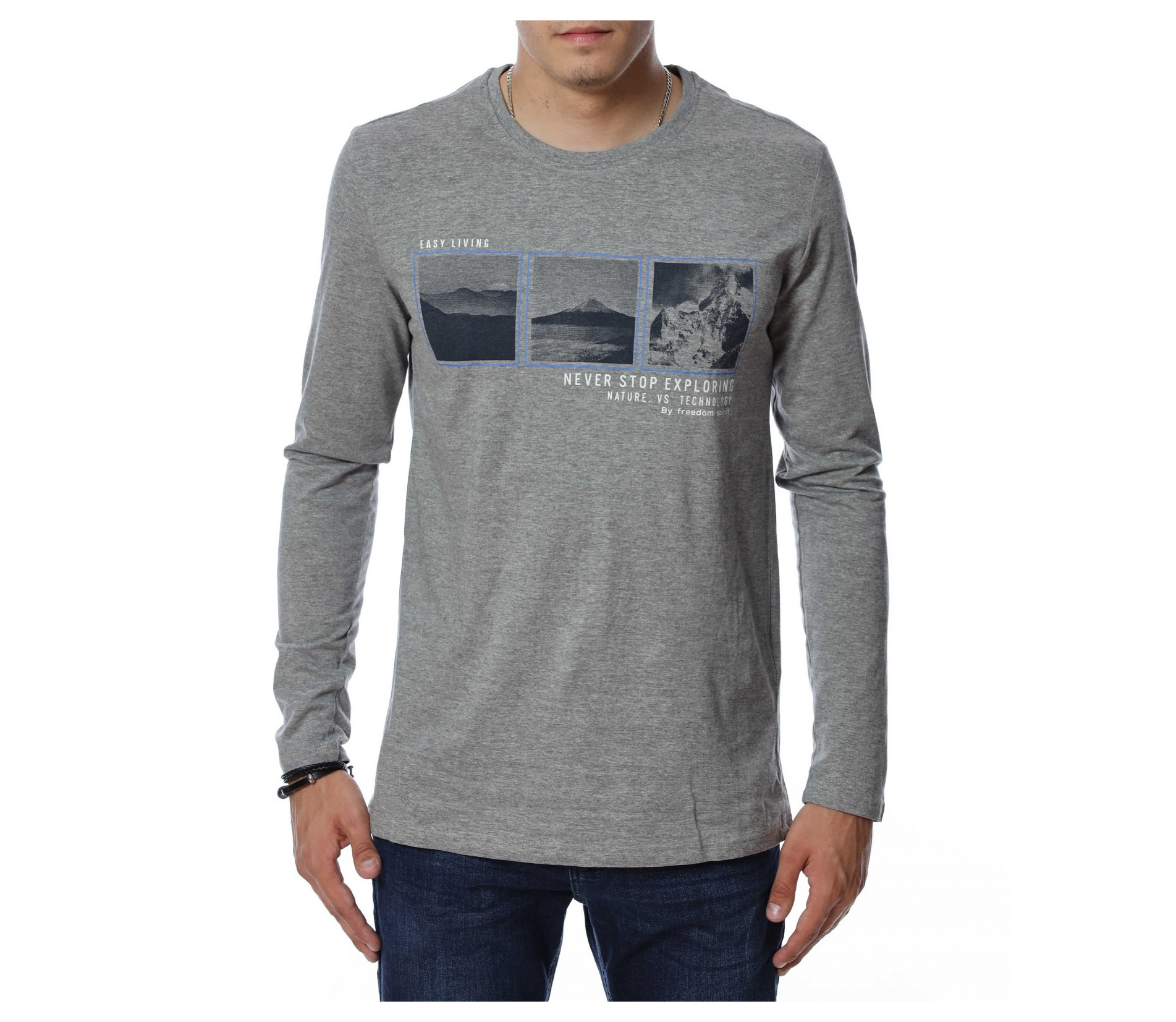 Мъжка блуза с дълъг ръкав. В средната част е добавена щампа с три изображения и надписи. Дължината е покриваща колана. Задната част е изчистена от детайли и декорации. Изработена от мека, памучна материя и вискоза. Комбинирайте с карго панталон, дънки, маратонки, кецове, подходящи обувки и любим аксесоар и няма да сбъркате с вашият аутфит.