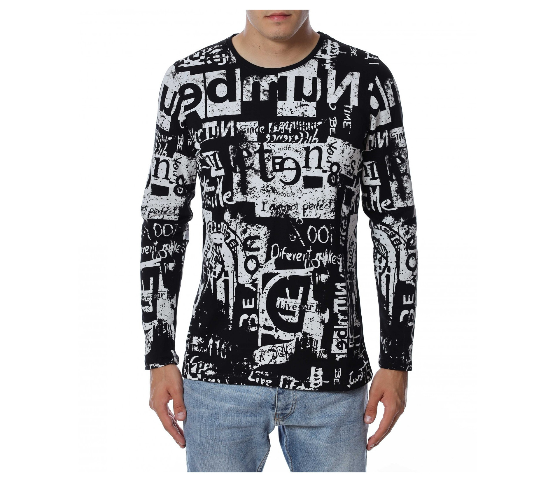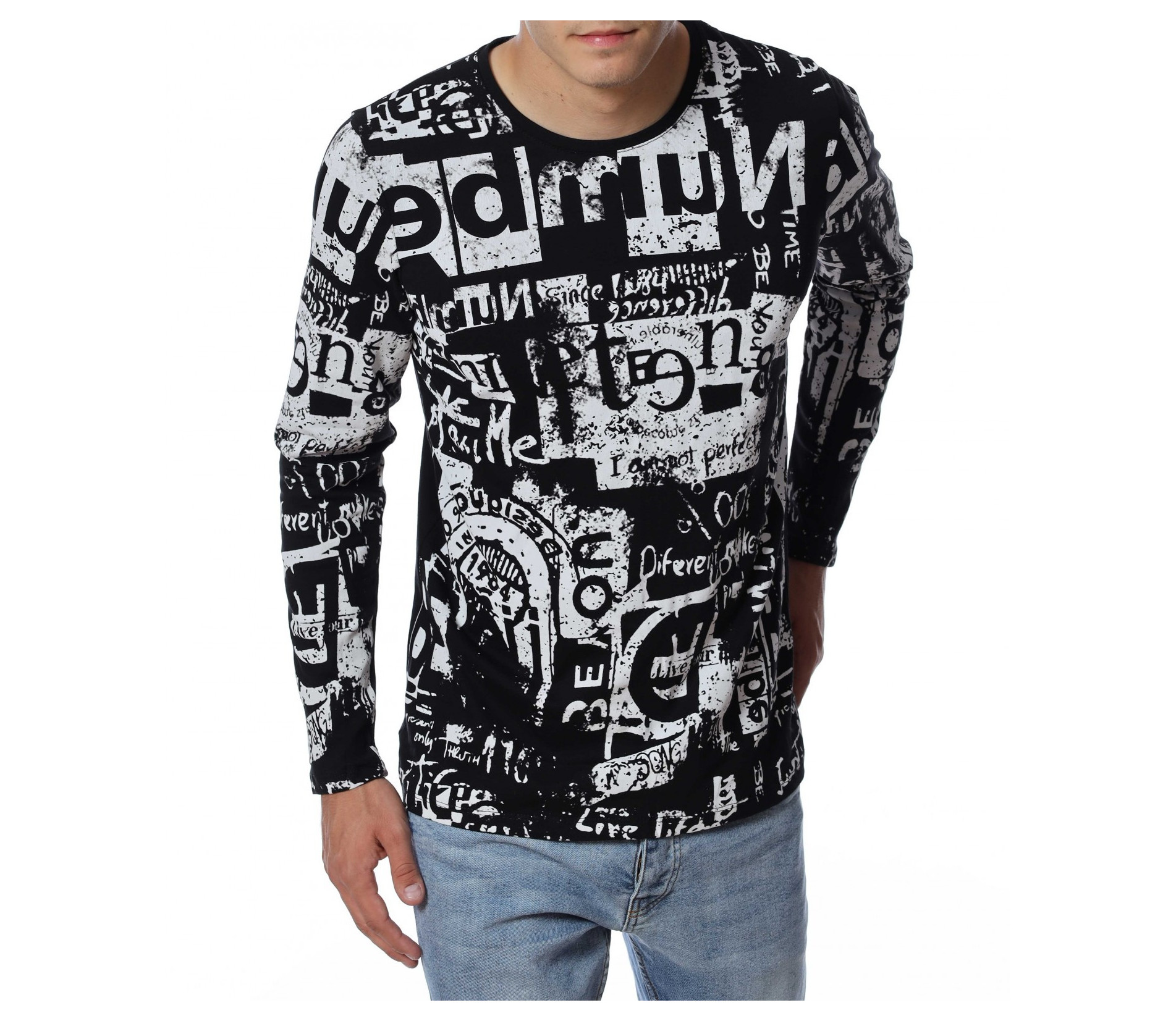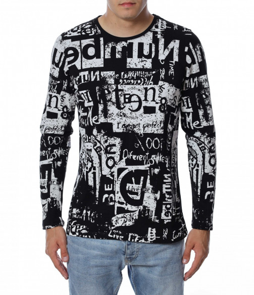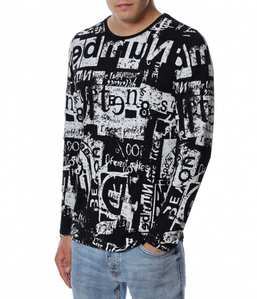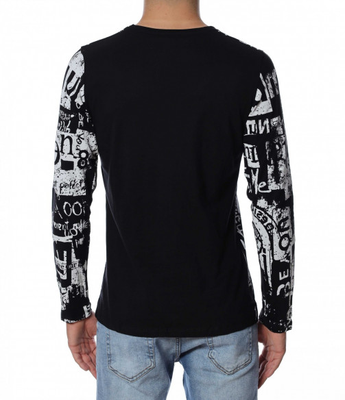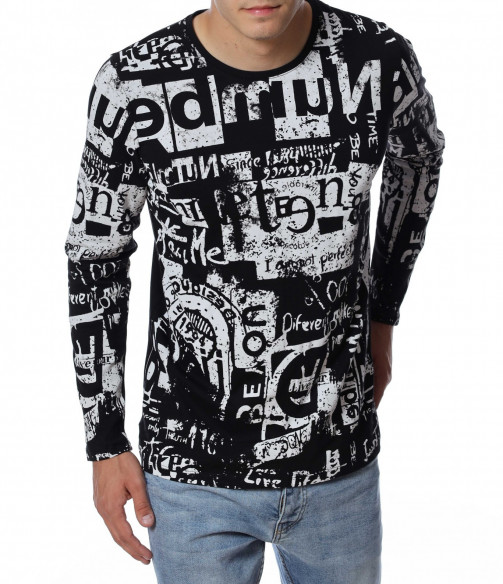Мъжка блуза с дълъг ръкав. Основата е едноцветна, а по цялата дължина е разположен интересен принт, който е пренесен и на ръкавите. Задната част е изчистена от допълнителни елементи и декорации, за да може да се акцентира отпред.Кройката следва линиите на тялото, а деколтето е овално. Комбинирайте с дънки, панталон, кецове, удобни обувки и любим аксесоар.