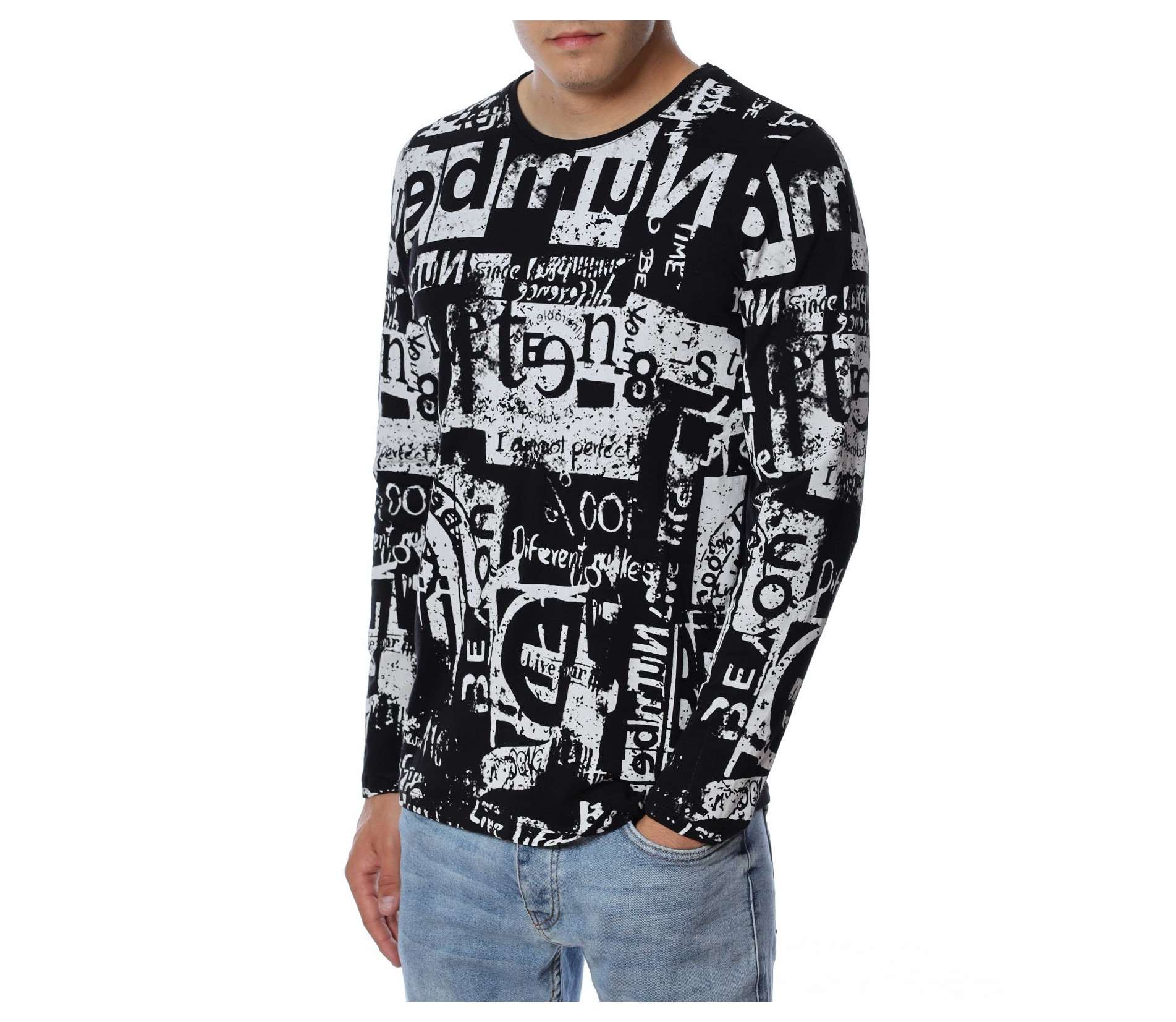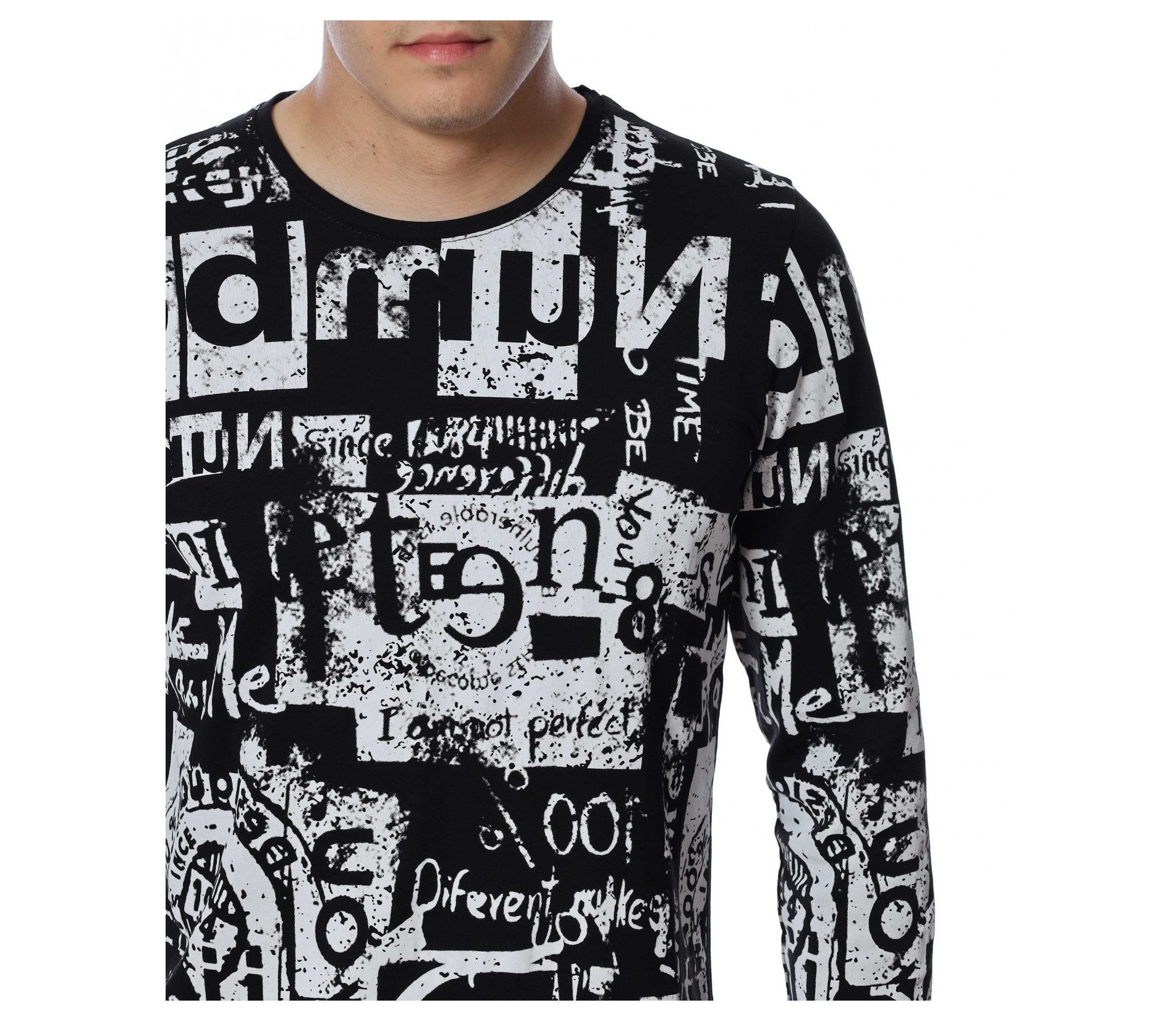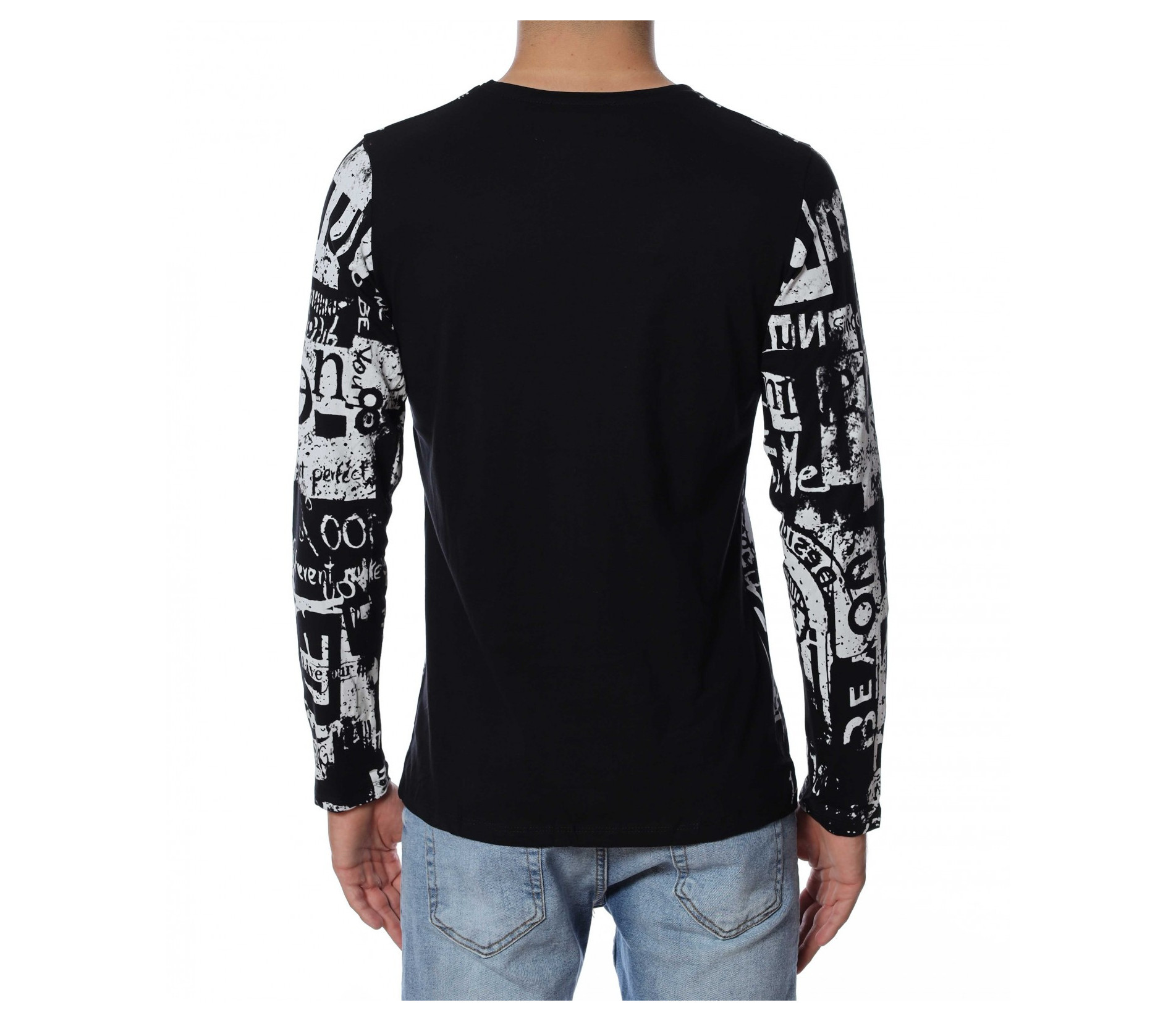 Мъжка блуза с дълъг ръкав. Основата е едноцветна, а по цялата дължина е разположен интересен принт, който е пренесен и на ръкавите. Задната част е изчистена от допълнителни елементи и декорации, за да може да се акцентира отпред.Кройката следва линиите на тялото, а деколтето е овално. Комбинирайте с дънки, панталон, кецове, удобни обувки и любим аксесоар.