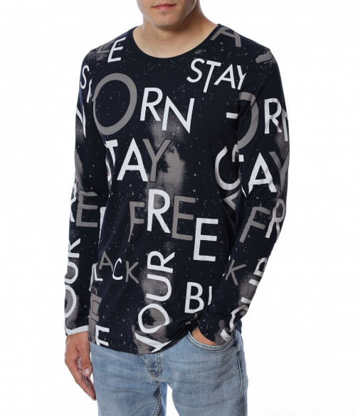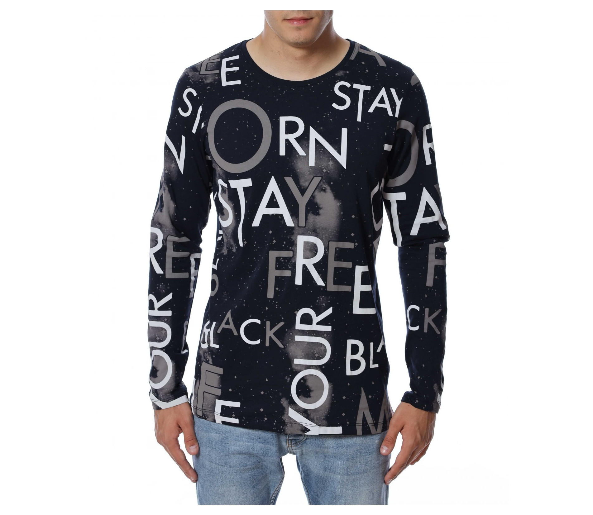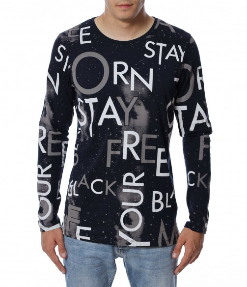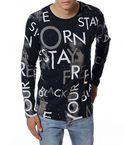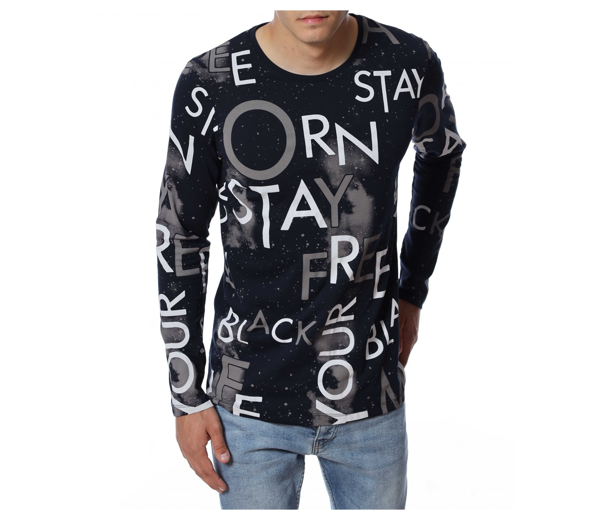 Мъжка блуза с дълъг ръкав и нестандартен принт в предната част и на ръкавите. Декорацията се състои в различни думи, които са разпръснати по цялата дължина и придават ефектен вид на дрехата. Задната част е изчистена от елементи. Кройката следва линиите на тялото. Комбинирайте с дънки, панталон, кецове, удобни обувки и любим аксесоар.