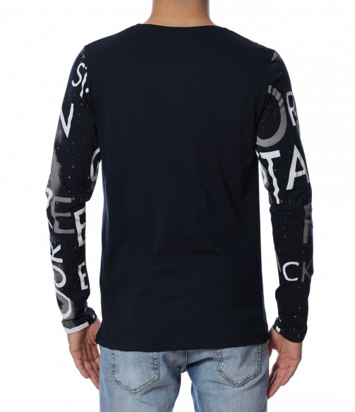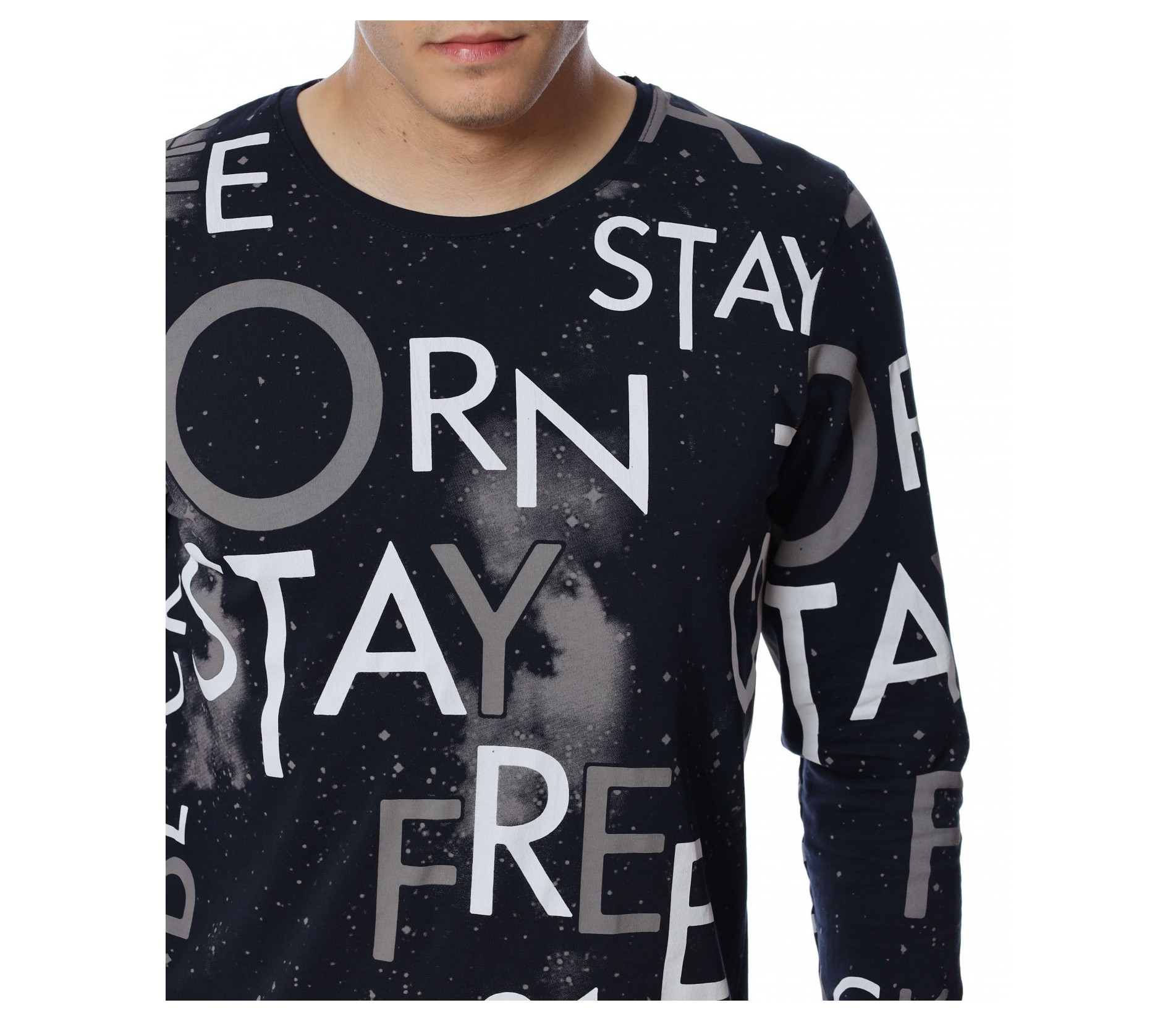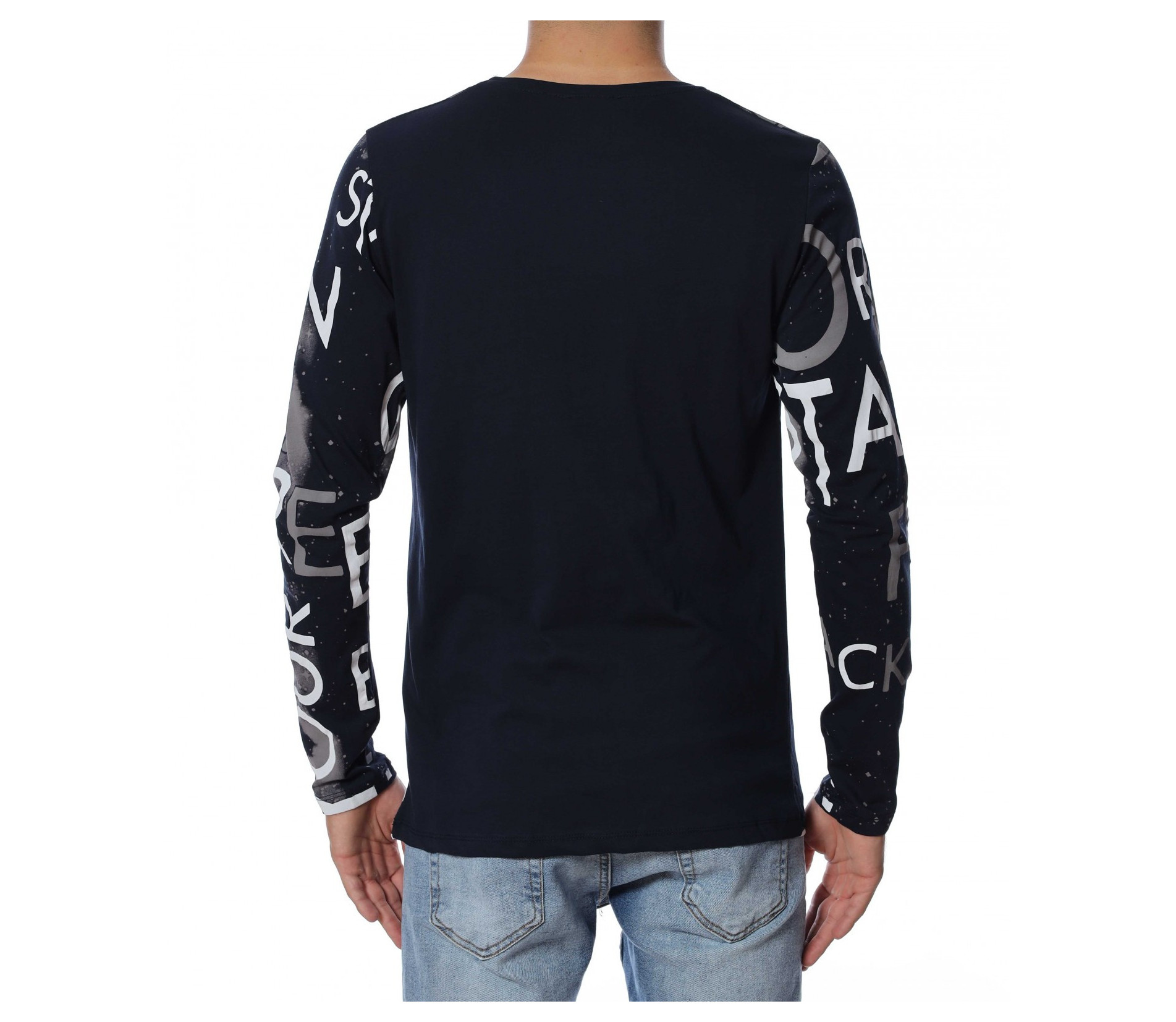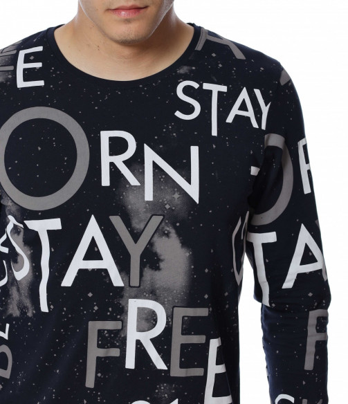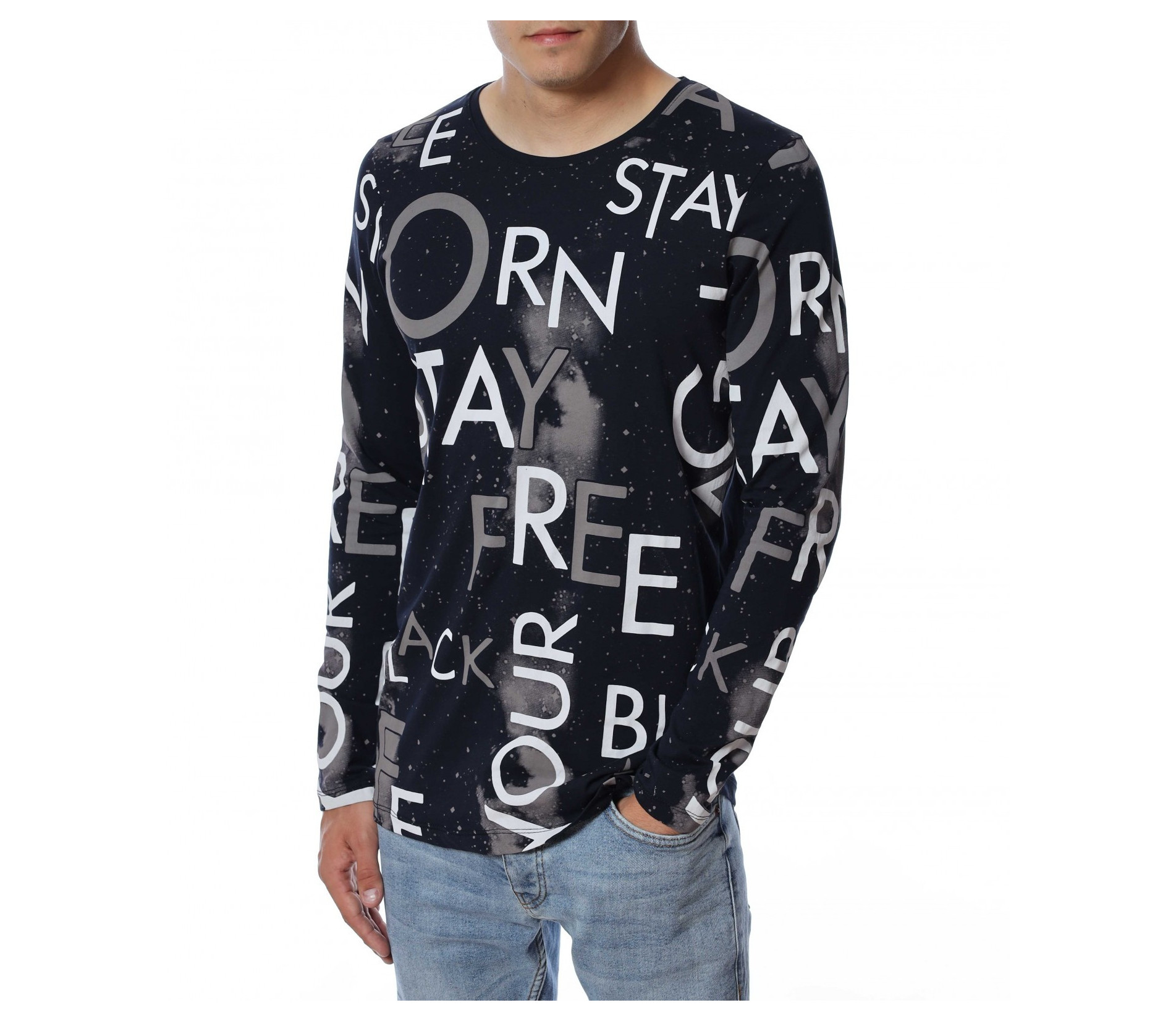 Мъжка блуза с дълъг ръкав и нестандартен принт в предната част и на ръкавите. Декорацията се състои в различни думи, които са разпръснати по цялата дължина и придават ефектен вид на дрехата. Задната част е изчистена от елементи. Кройката следва линиите на тялото. Комбинирайте с дънки, панталон, кецове, удобни обувки и любим аксесоар.