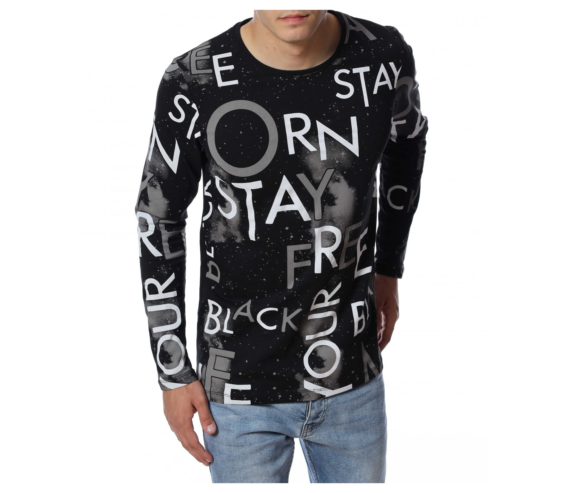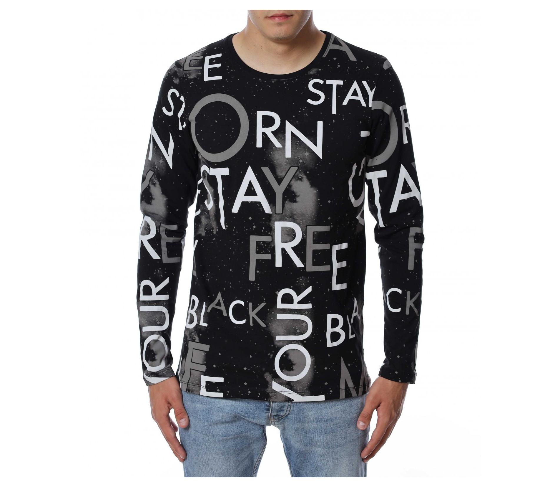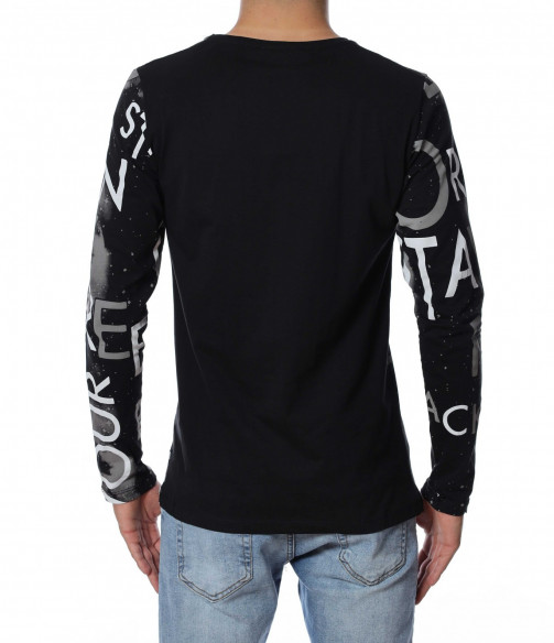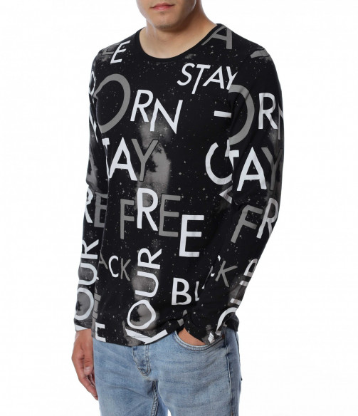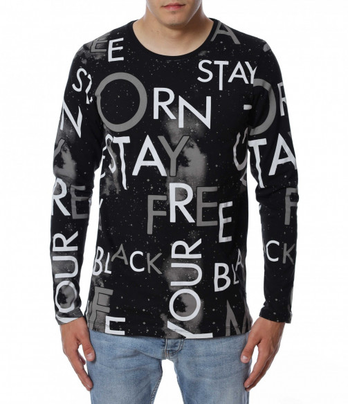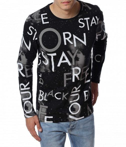 Мъжка блуза с дълъг ръкав и нестандартен принт в предната част и на ръкавите. Декорацията се състои в различни думи, които са разпръснати по цялата дължина и придават ефектен вид на дрехата. Задната част е изчистена от елементи. Кройката следва линиите на тялото. Комбинирайте с дънки, панталон, кецове, удобни обувки и любим аксесоар.