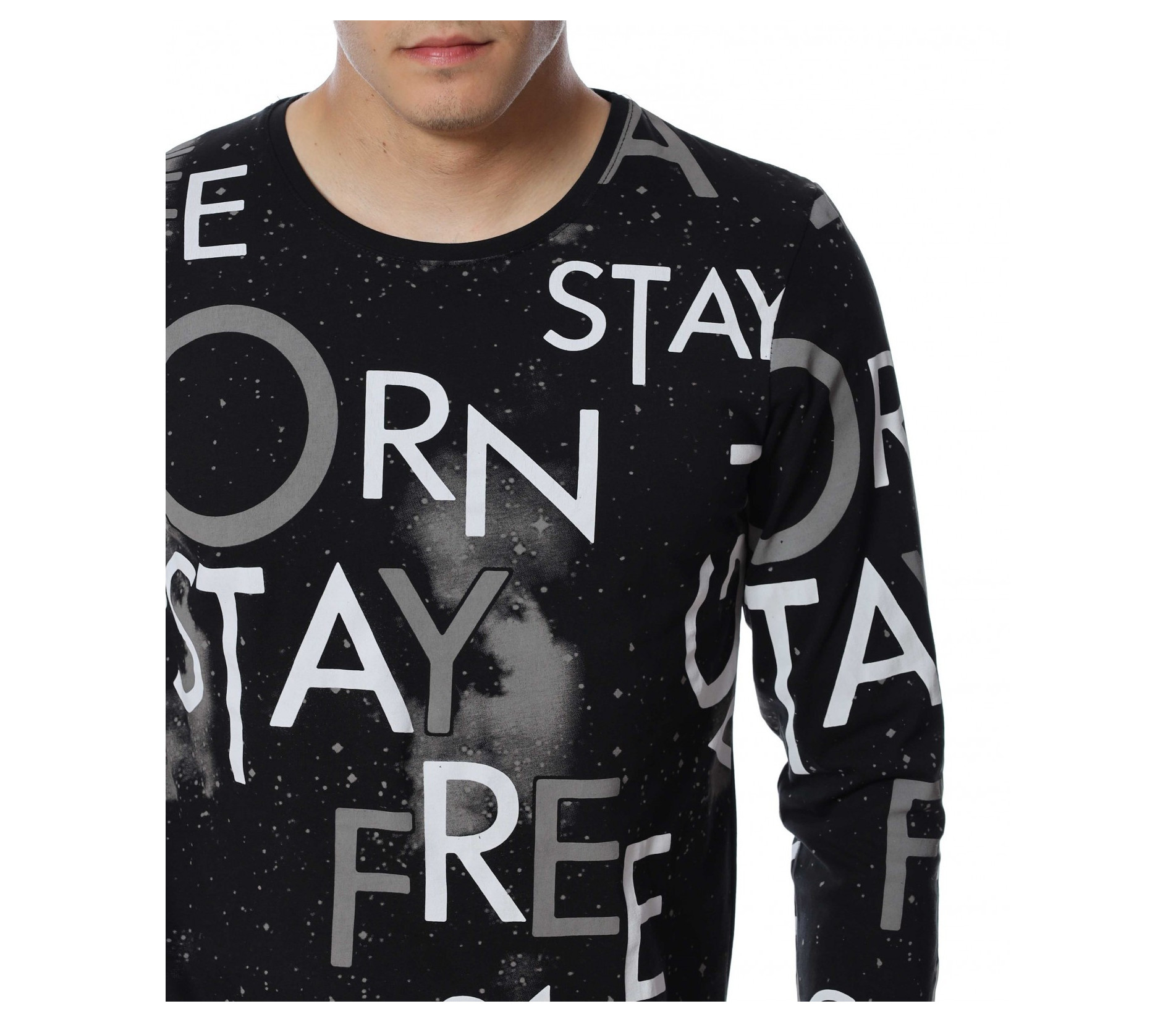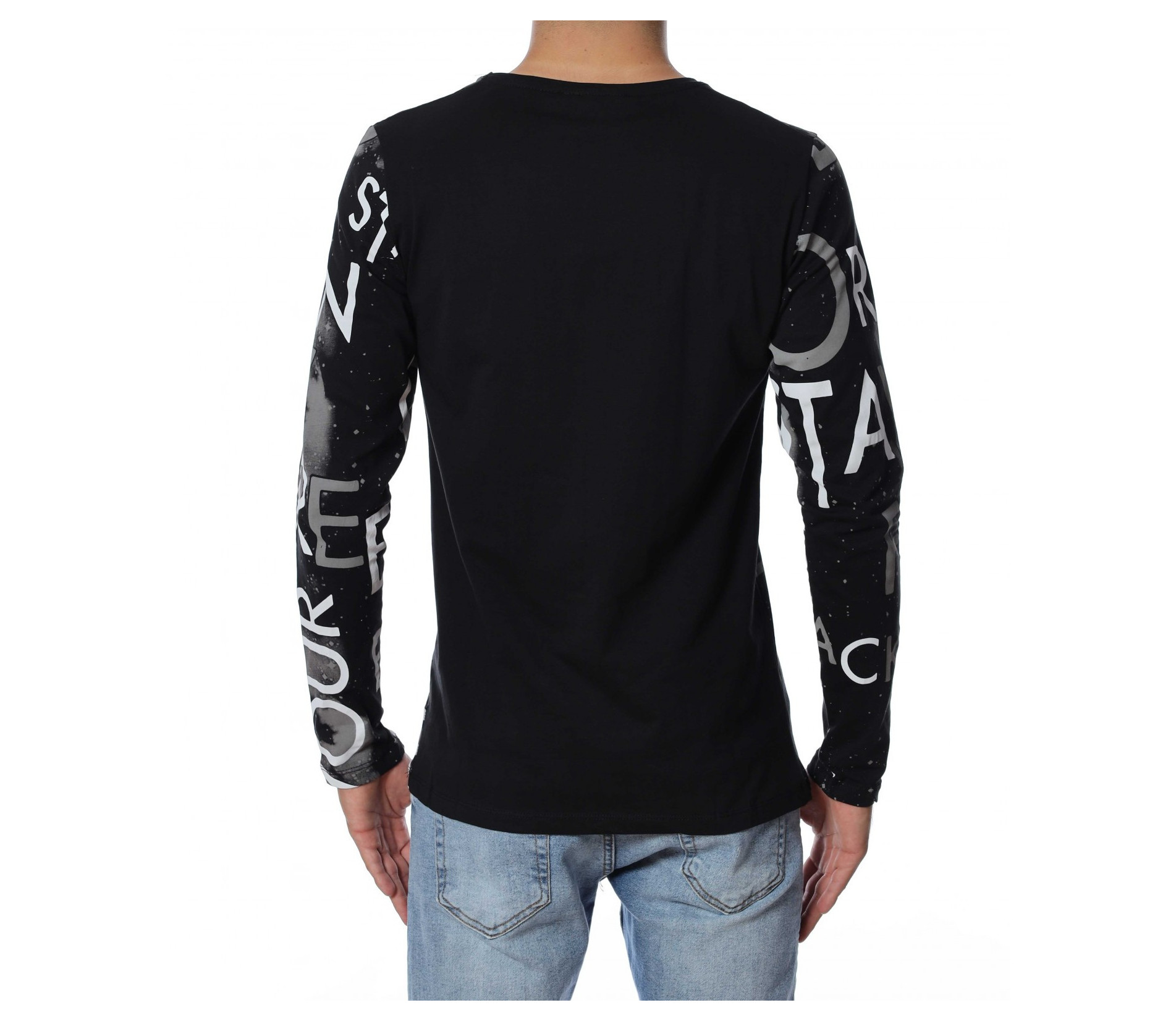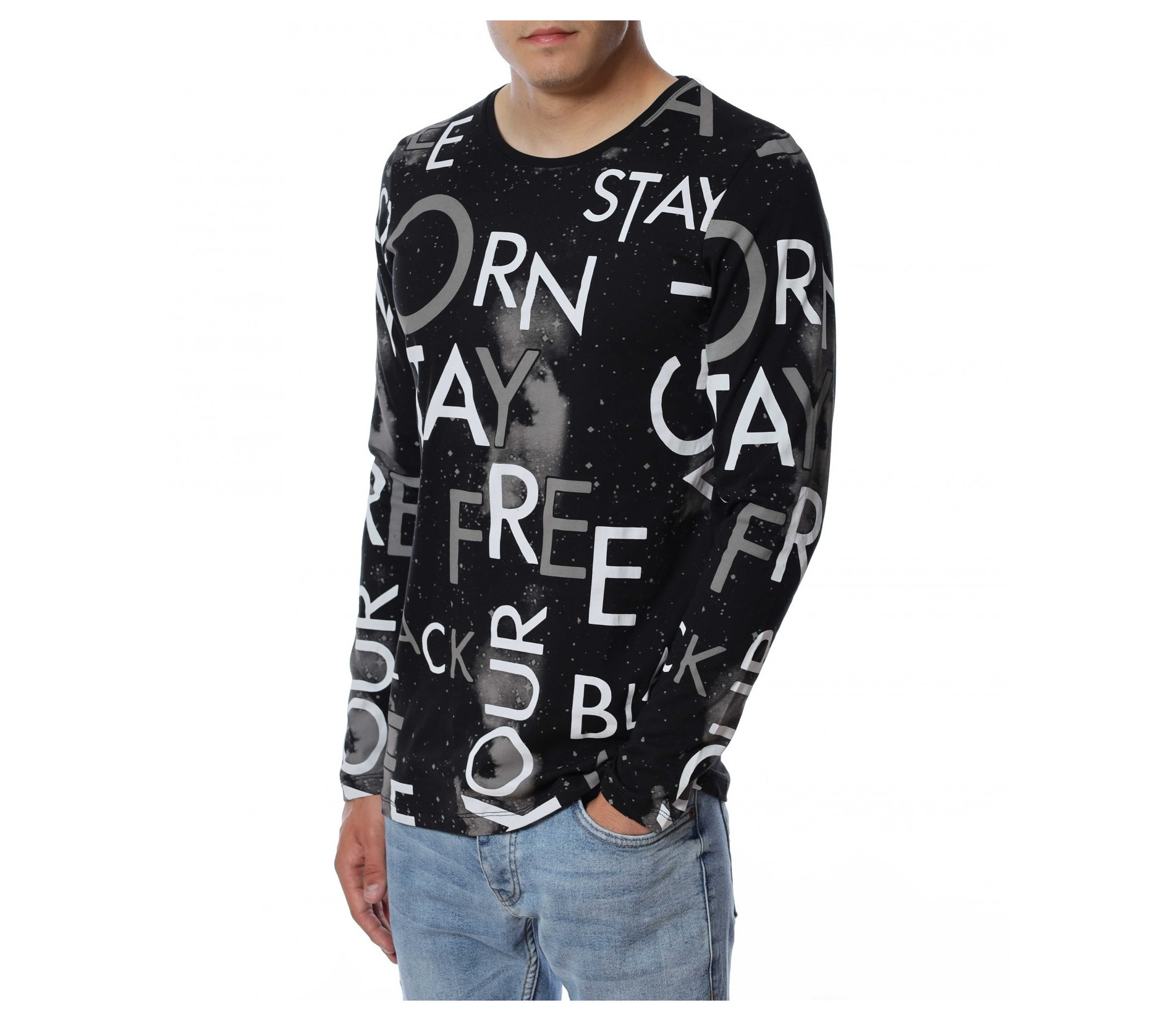 Мъжка блуза с дълъг ръкав и нестандартен принт в предната част и на ръкавите. Декорацията се състои в различни думи, които са разпръснати по цялата дължина и придават ефектен вид на дрехата. Задната част е изчистена от елементи. Кройката следва линиите на тялото. Комбинирайте с дънки, панталон, кецове, удобни обувки и любим аксесоар.