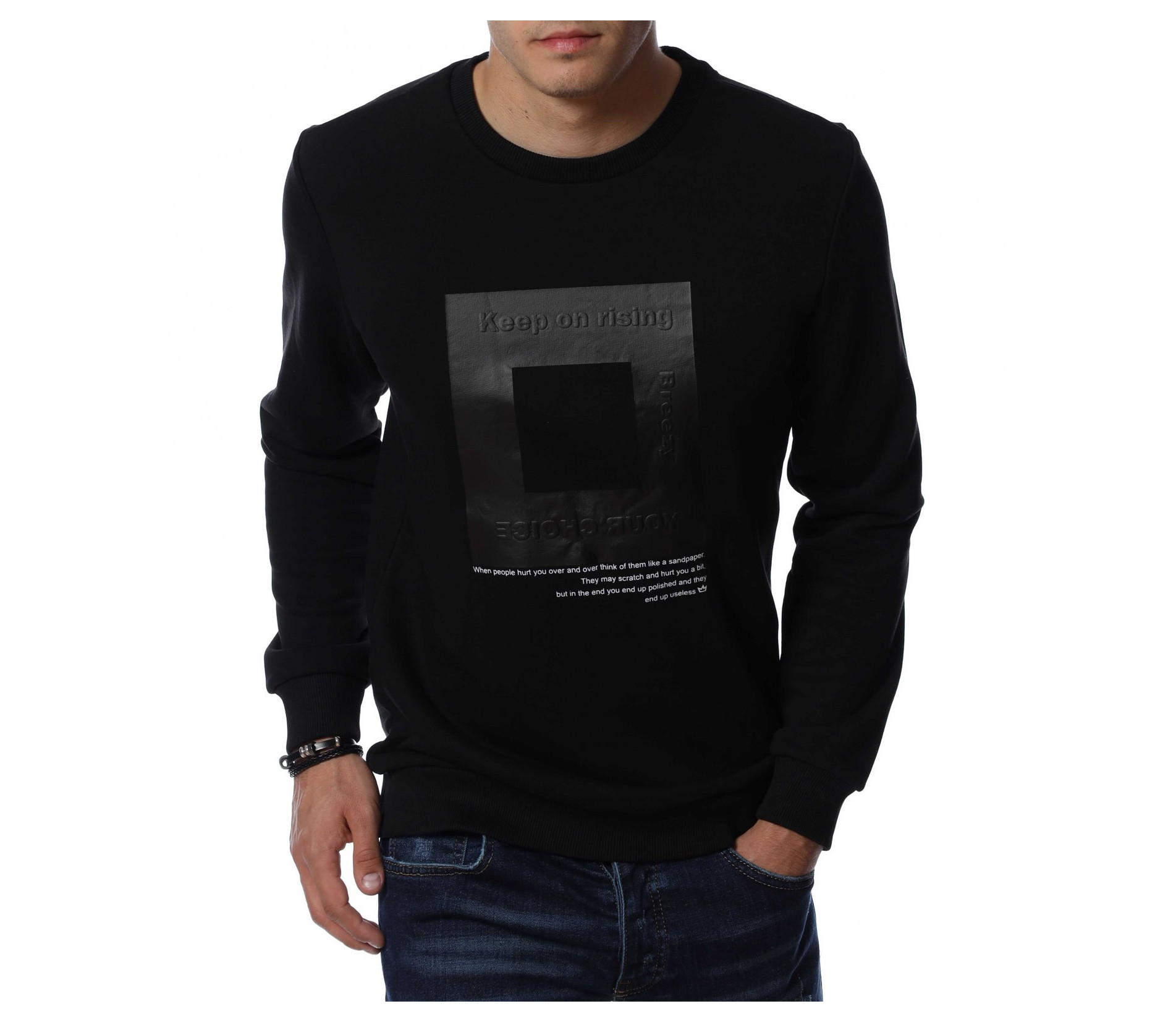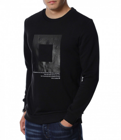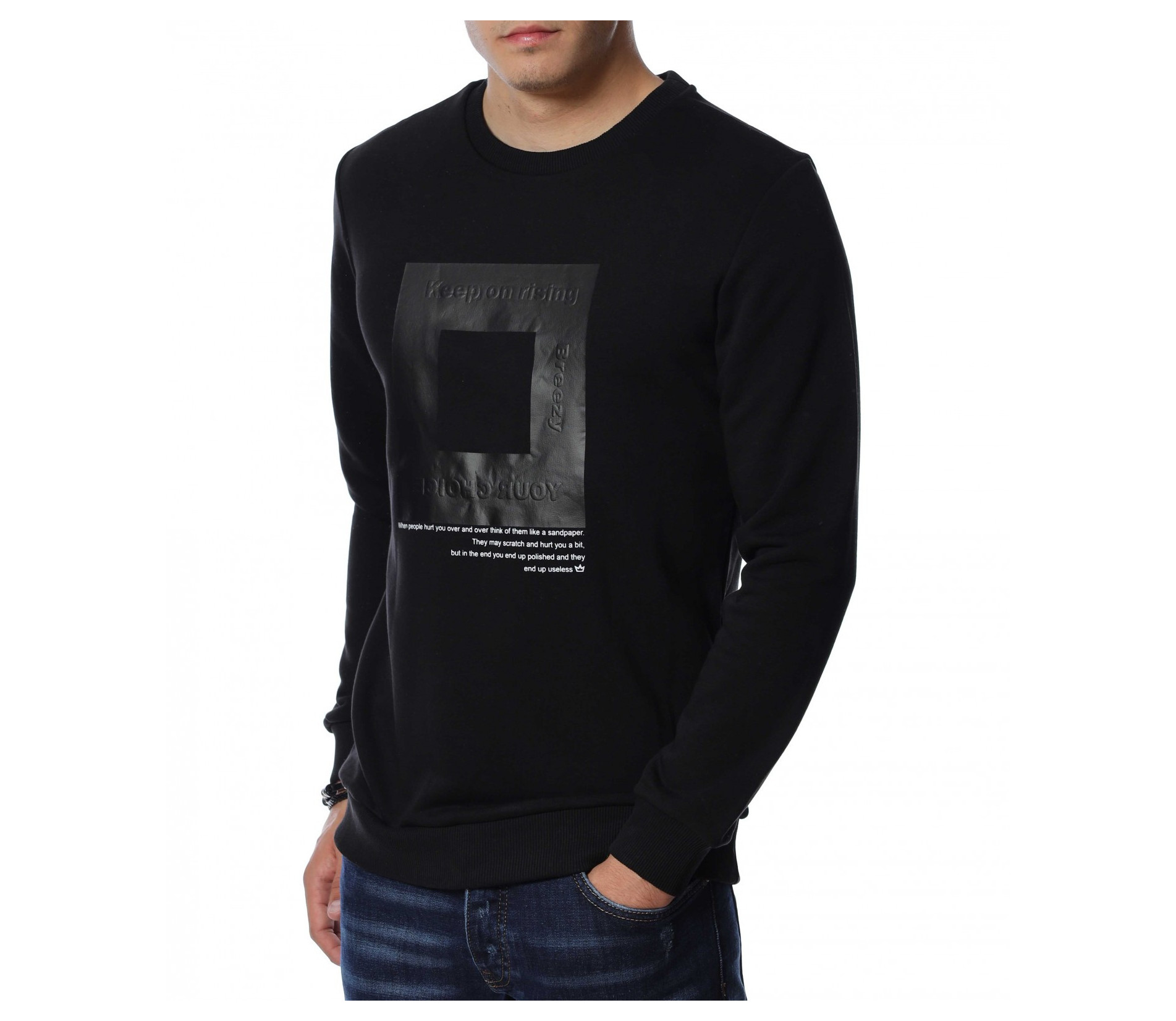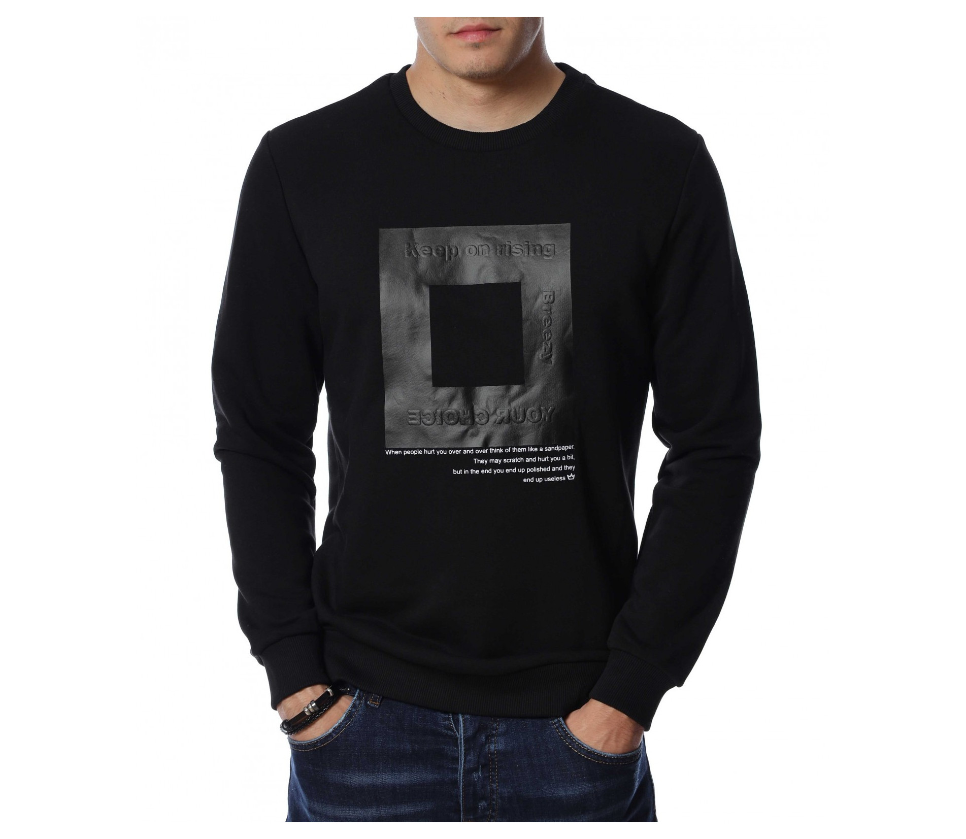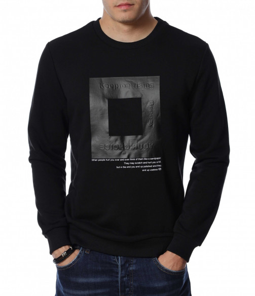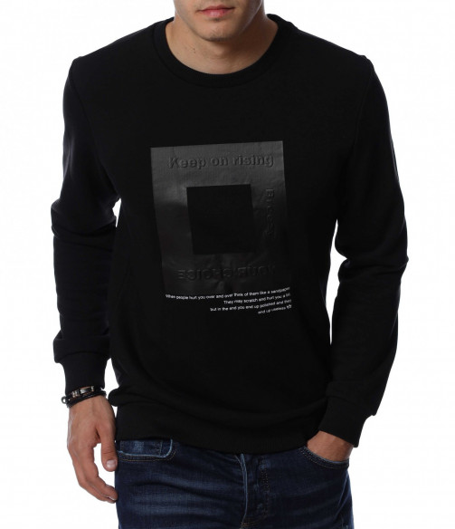 Мъжка блуза с дълъг ръкав. Основата на дрехата е едноцветна, а в предната част е позиционирана интересна и забележима щампа. Гърбът е в изчистен вариант, а деколтето е овално. Дължината покрива колана, а кройката следва линиите на тялото. Комбинирайте с дънки и кецове.