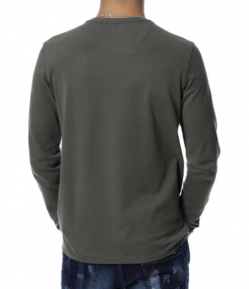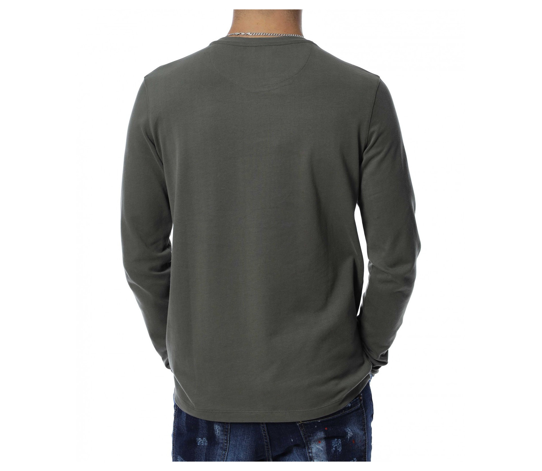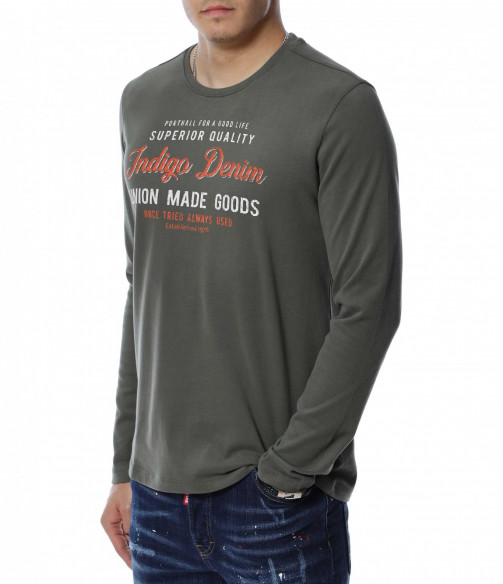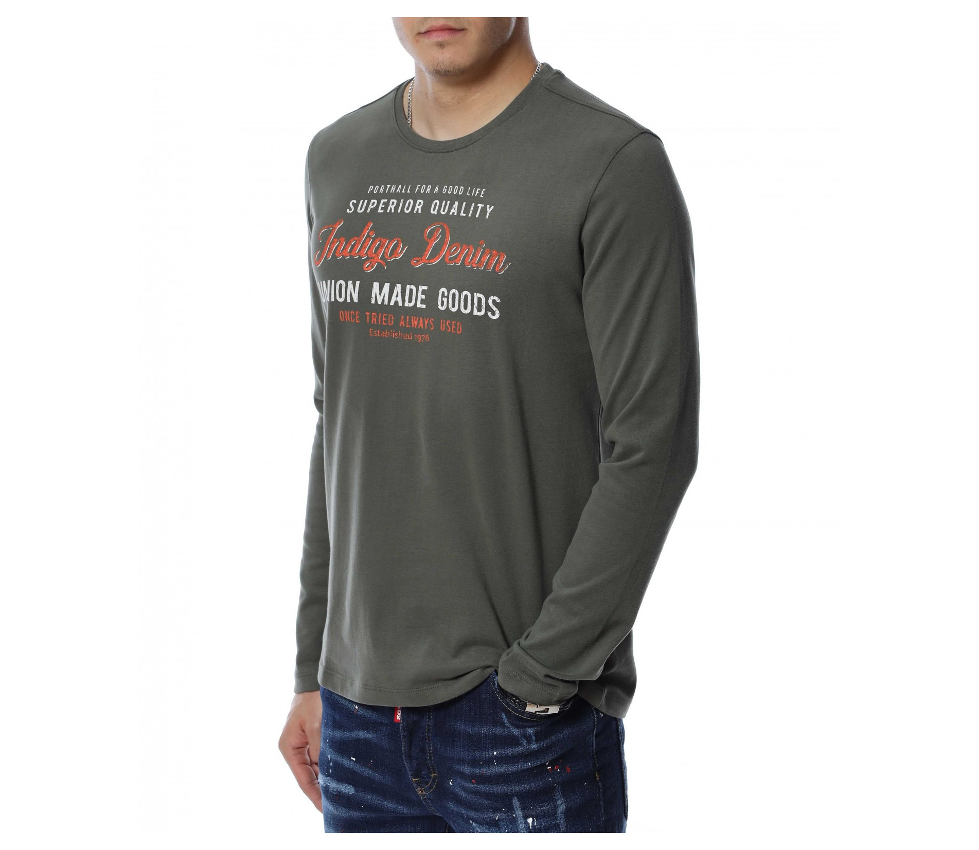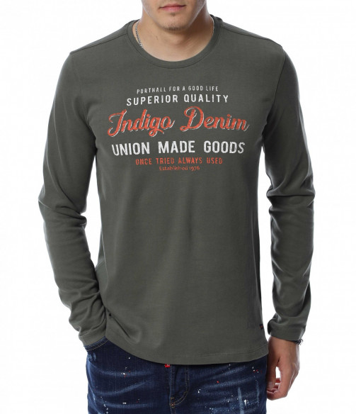 Мъжка блуза с дълъг ръкав. Основата е в едноцветен вариант, а в предната част забелязваме цветни надписи в различен шрифт \"Indigo Denim\" На раменете са позиционирани удебелени шевове, а деколтето е овално. Кройката следва линиите на тялото, а гърбът е в напълно изчистен вариант, за да може акцентът да падне отпред. Комбинирайте с дънки, панталон, кецове, удобни обувки и любим аксесоар.