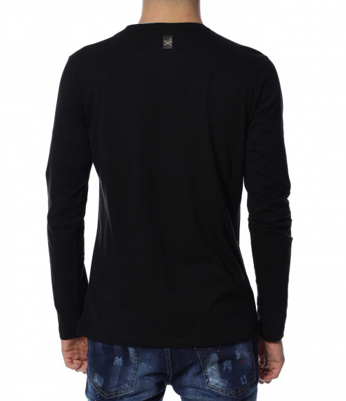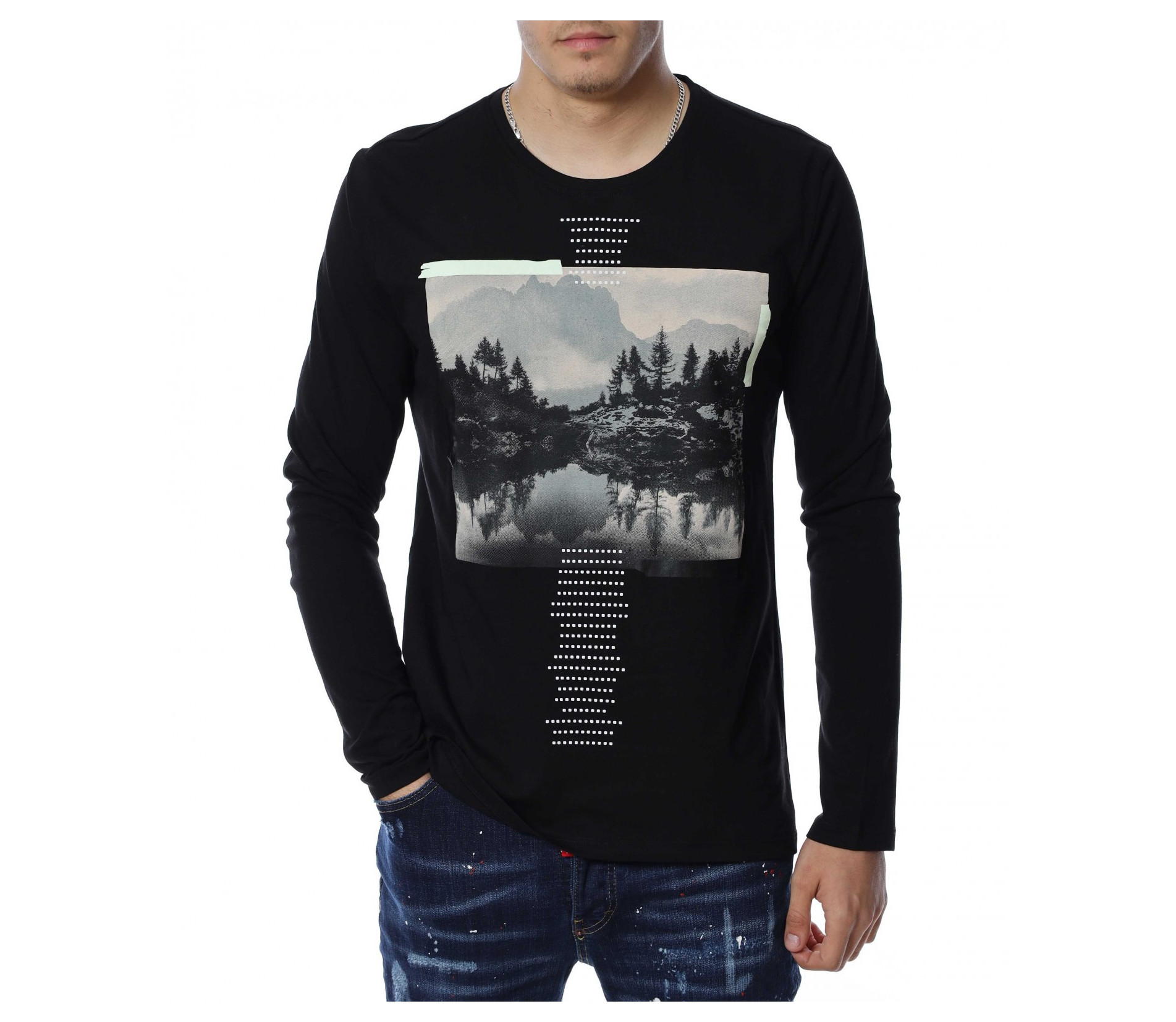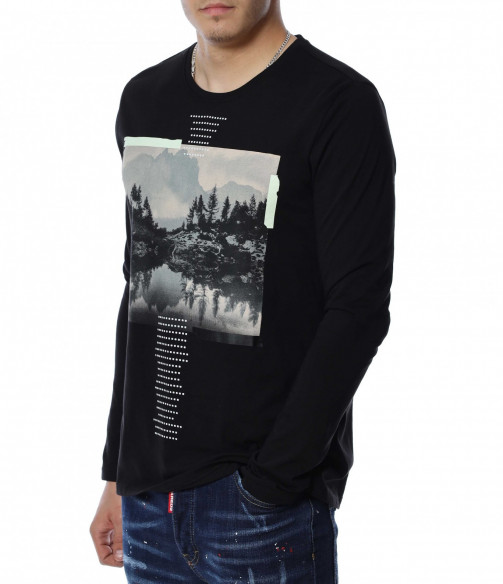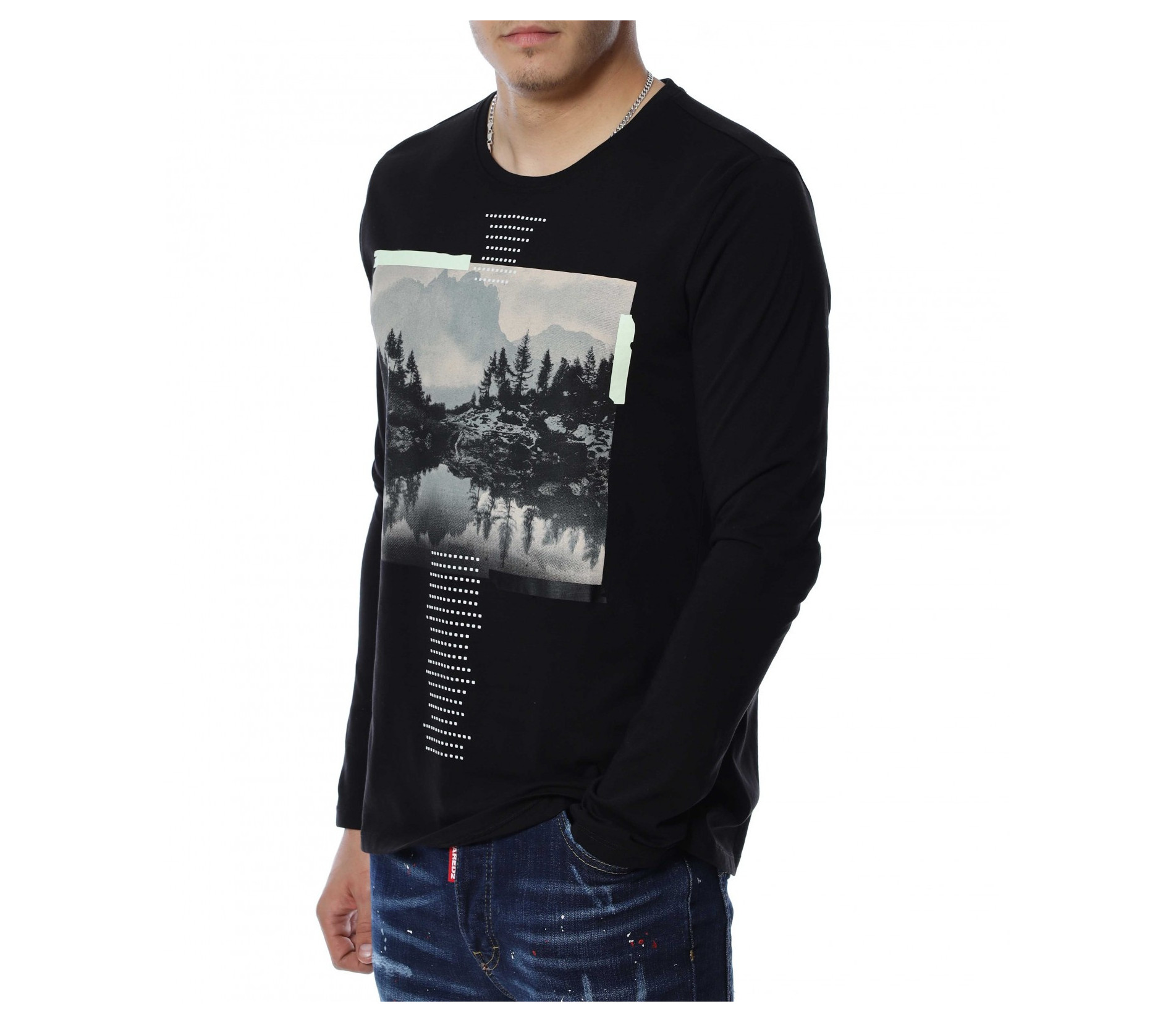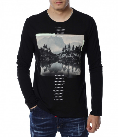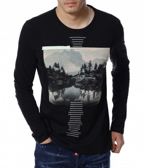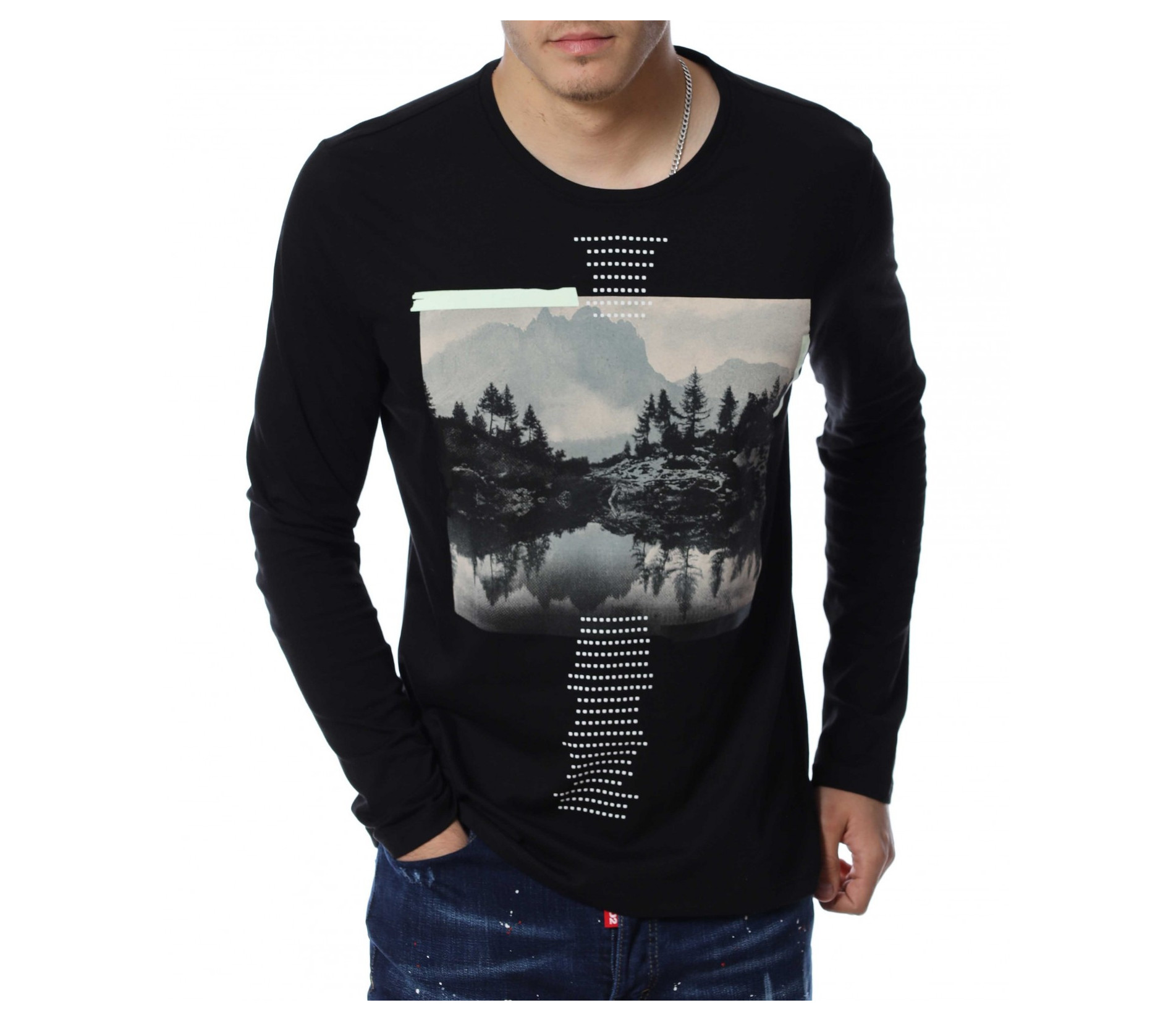 Мъжка блуза с дълъг ръкав и дължина, покриваща колана. Основата на моделът е едноцветна, а в предната част откриваме щампа, изобразяваща езеро и гора. Кройката осигурява свобода на движение, а меката материя предоставя комфорт на тялото. Деколтето е овално, а гърбът е в изчистен вариант. Комбинирайте с дънки и кецове за завършек на вашия аутфит.