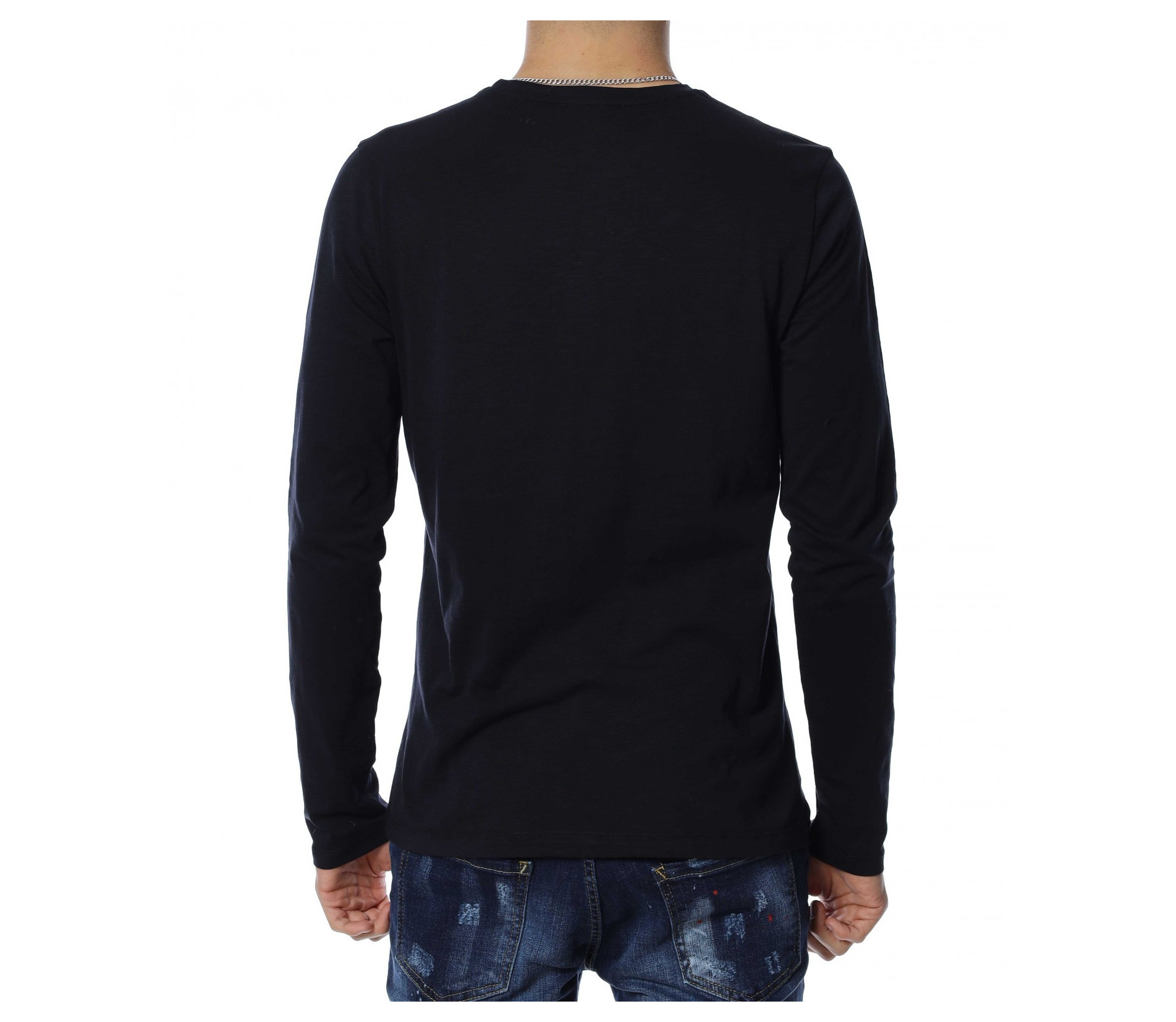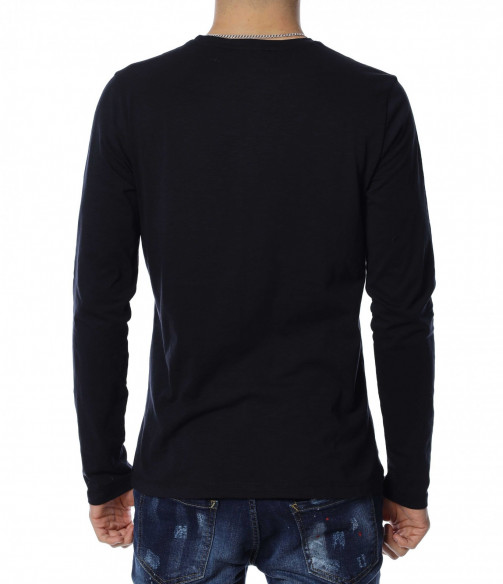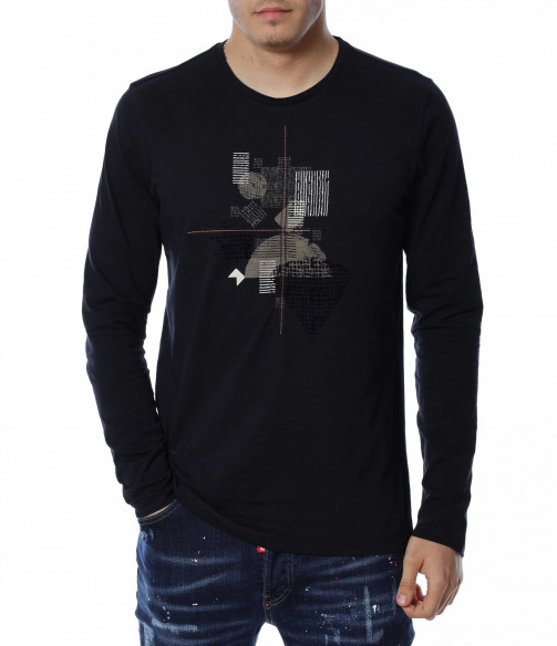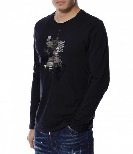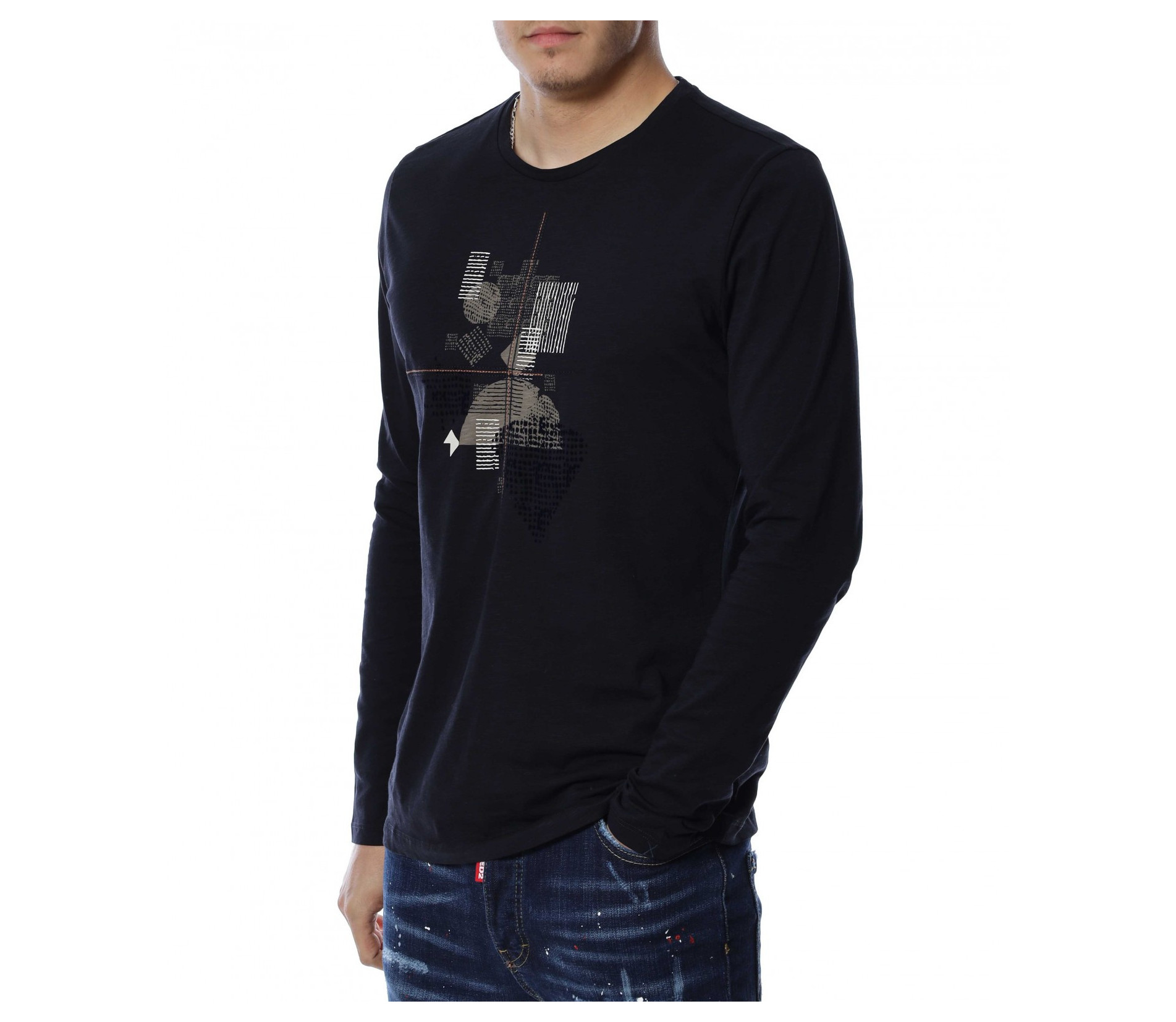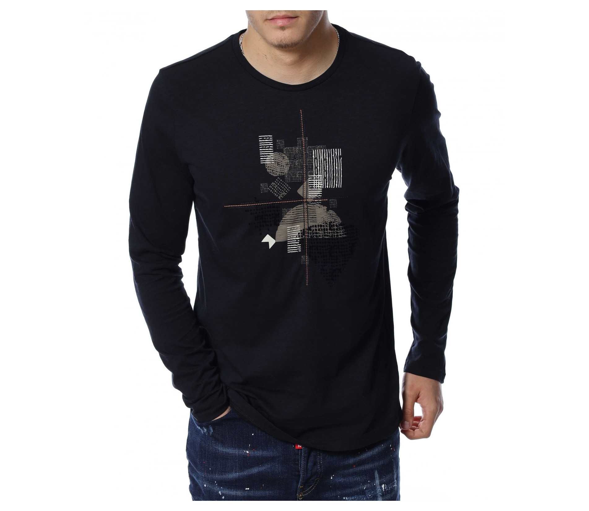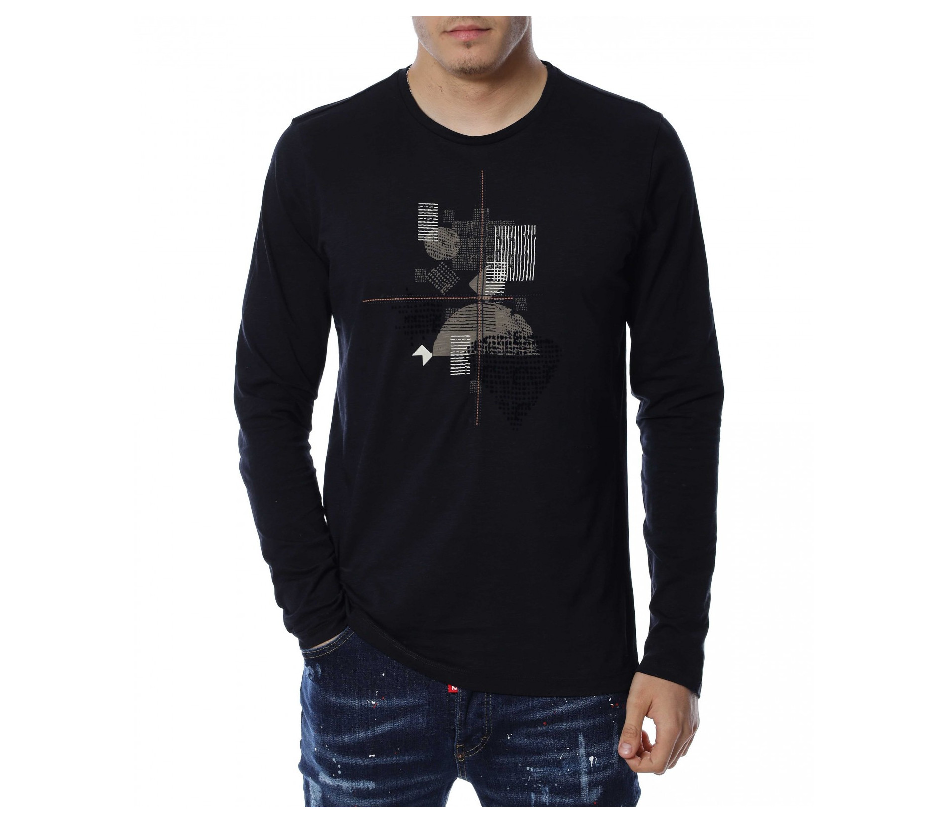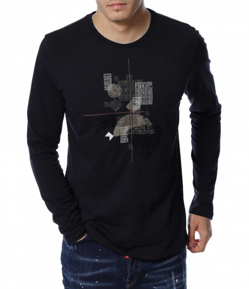 Мъжка блуза с дълъг ръкав и овално деколте. Основата на дрехата е едноцветна, а в предната част е разположена нетипична, интересна щампа. Гърбът е в напълно изчистен вариант, без декорации и елементи. Кройката подхожда на тялото, а меката материя придава така желаният от всички комфорт. Комбинирайте с дънки и кецове.