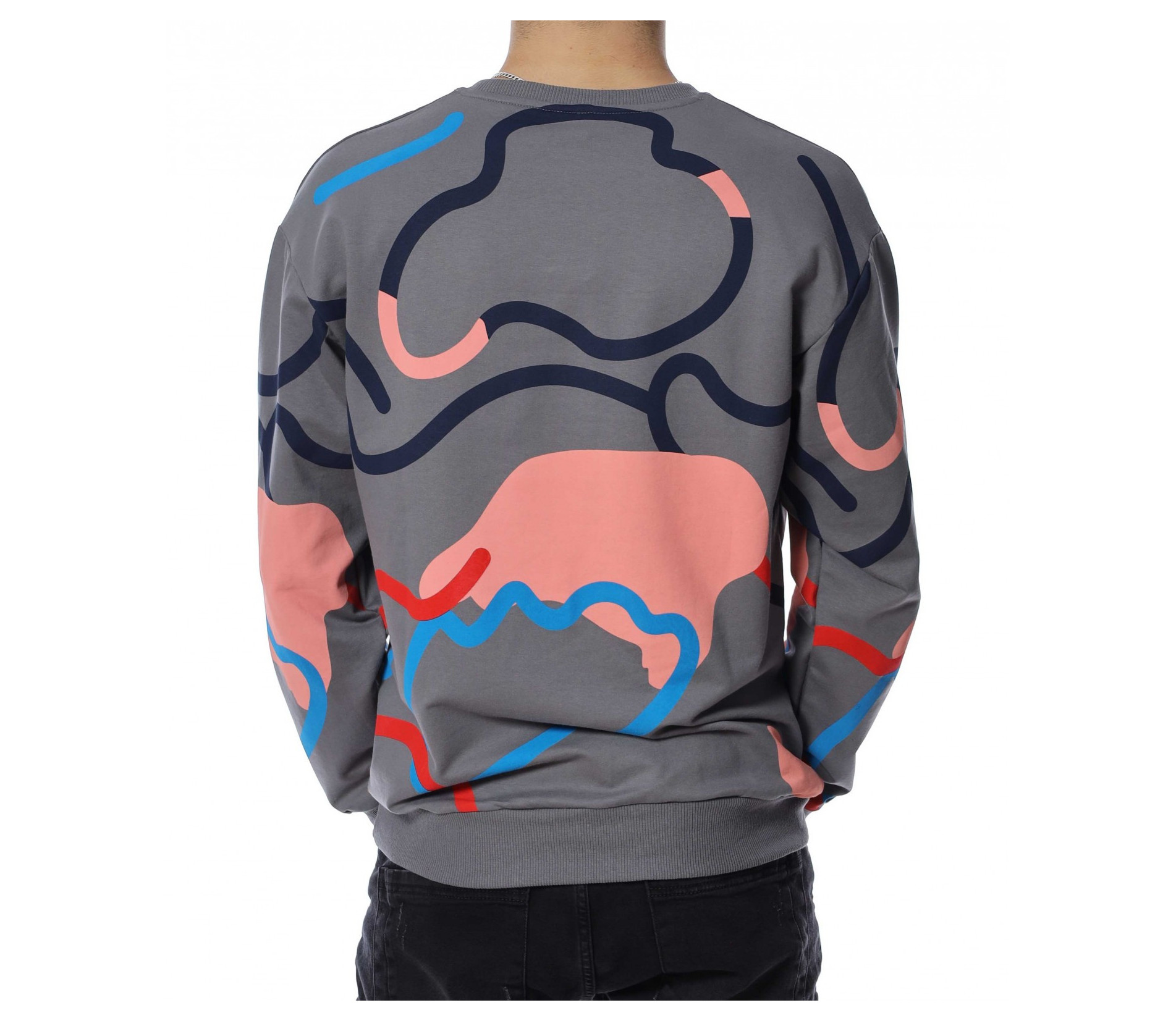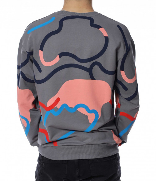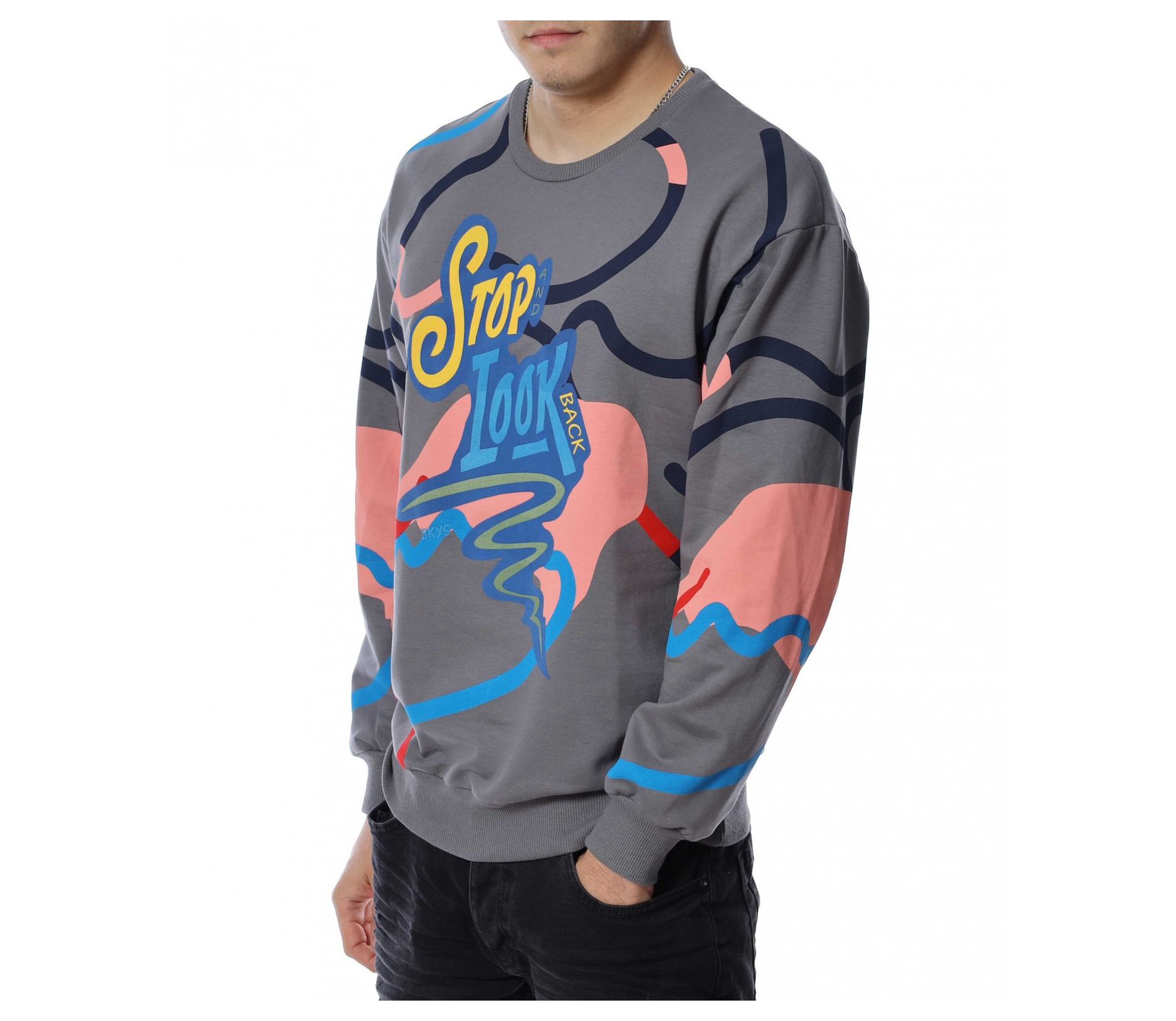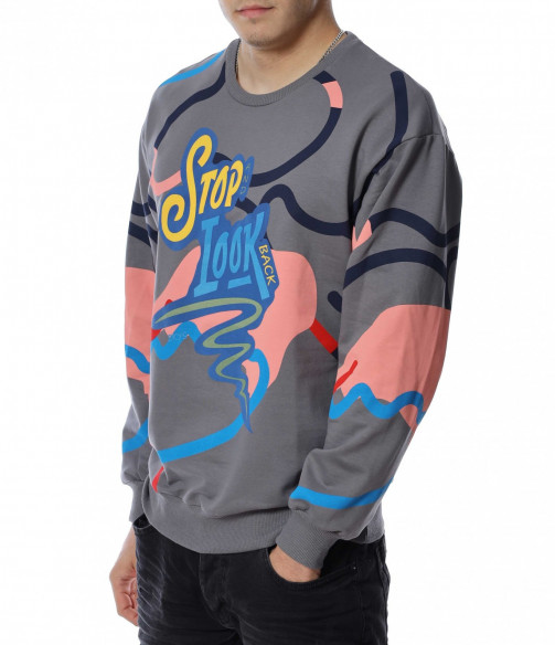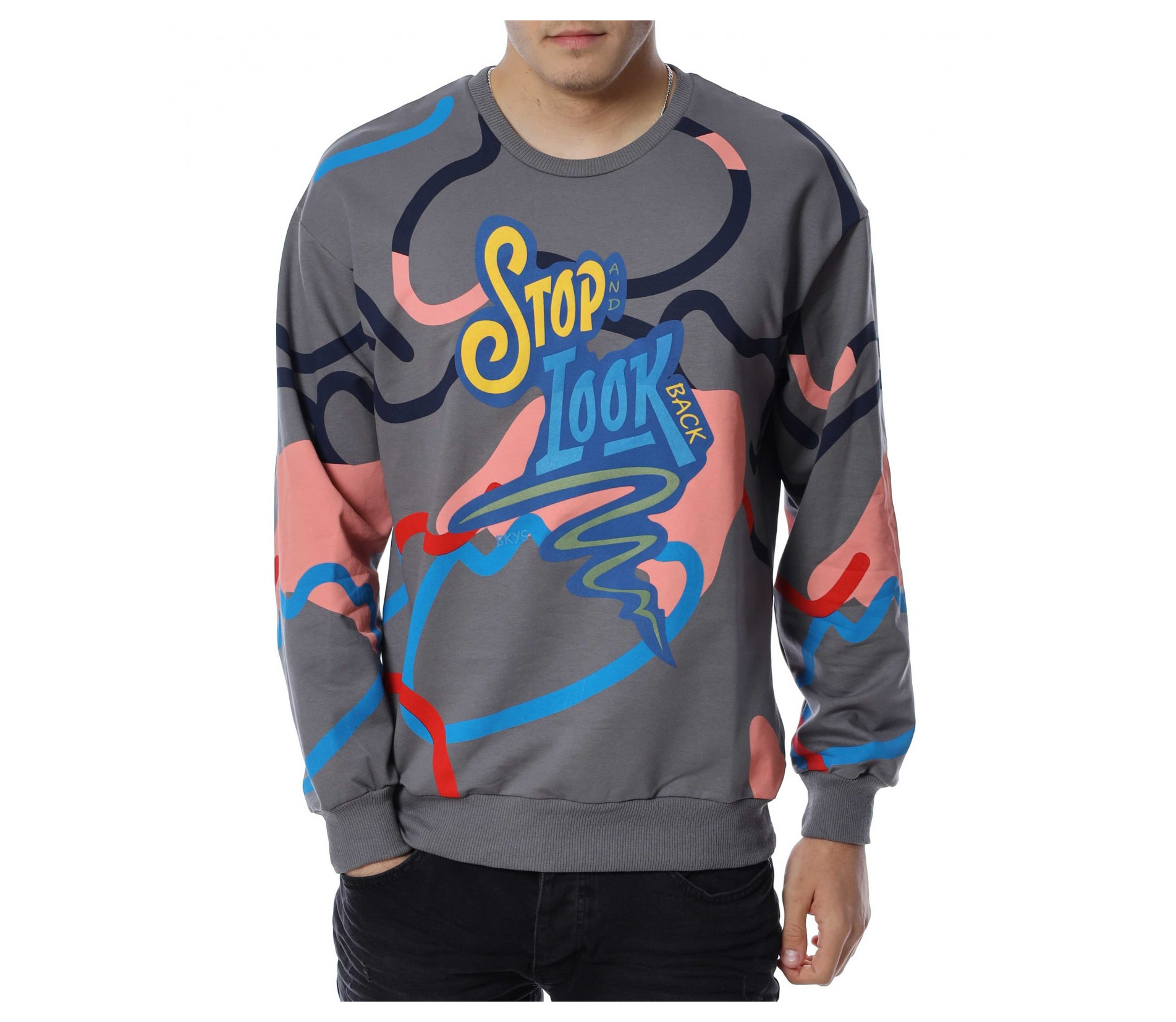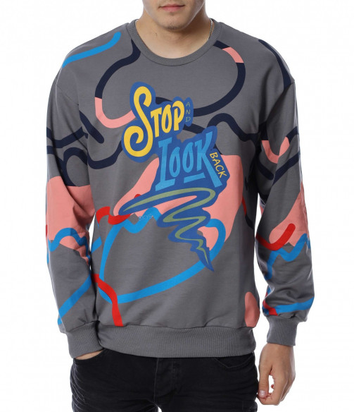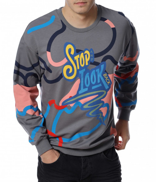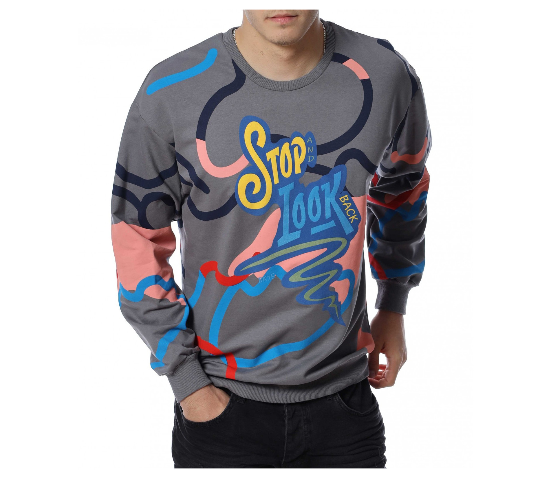 Мъжка блуза с дълъг ръкав. Основата е в един цвят, а дизайнът, който се състои в цветни и небрежно разположени декорации е разположен по цялата дължина, както в предната, така и в задната част. Отпред в допълнение е позиционирана щампа с надпис Stop and look back. Деколтето е овално, кройката се адаптира към тялото, а меката материя придава на тялото невероятен комфорт. Комбинирайте с кецове и дънки.