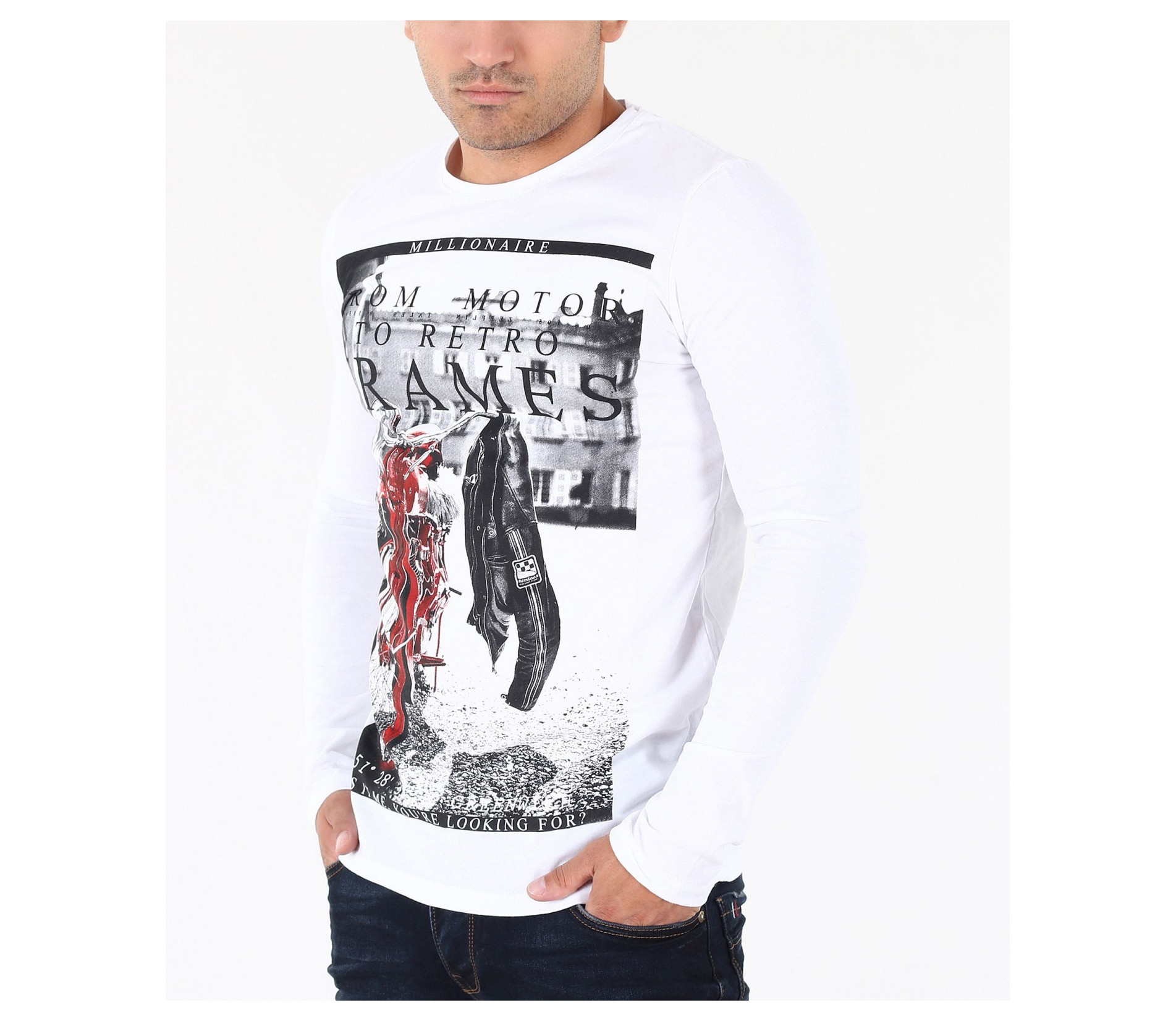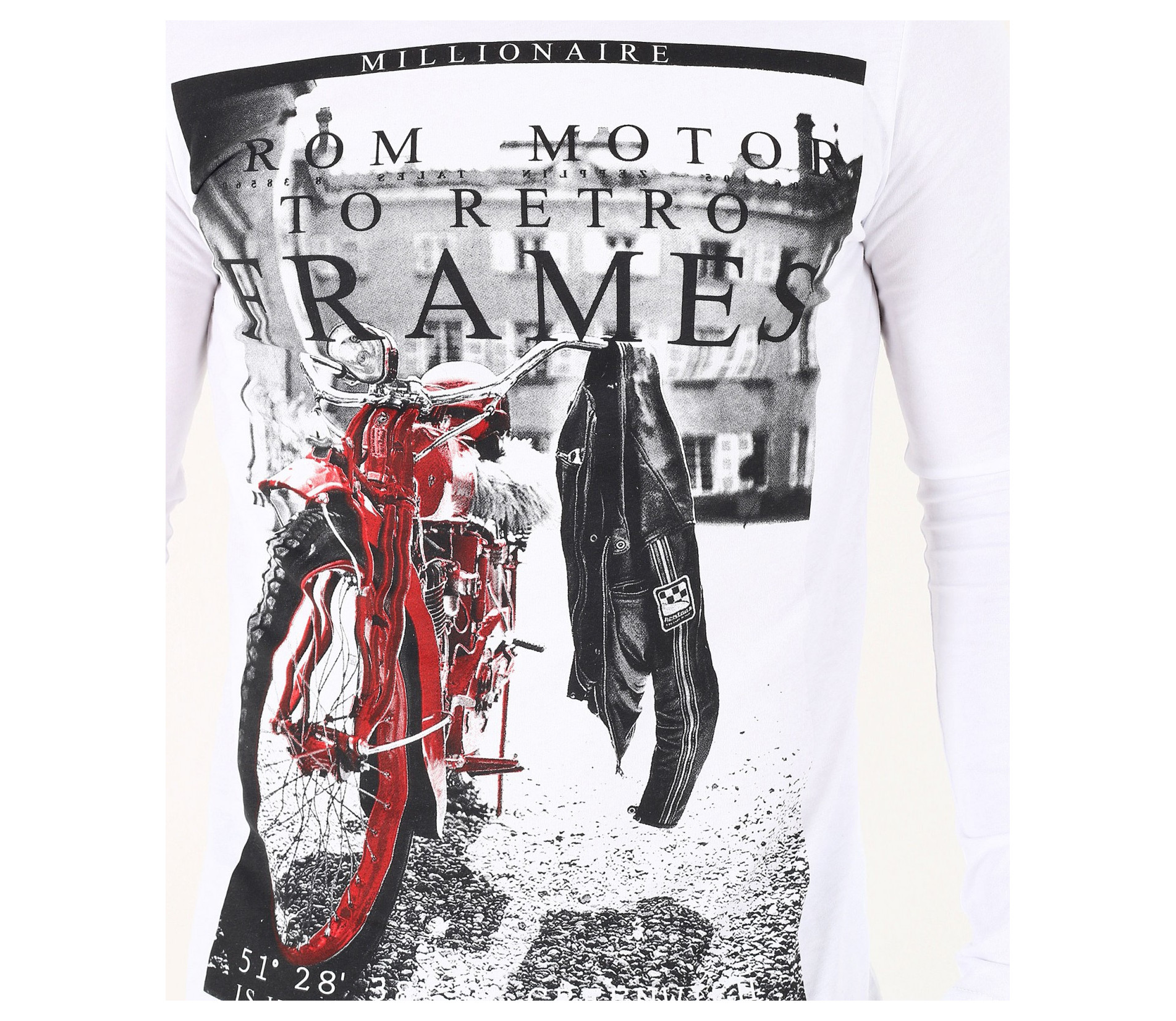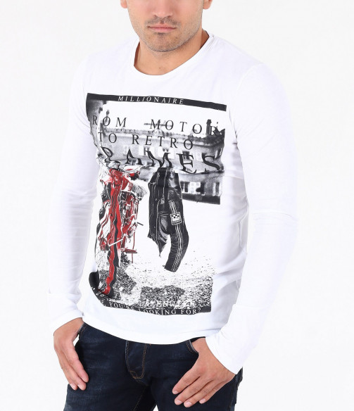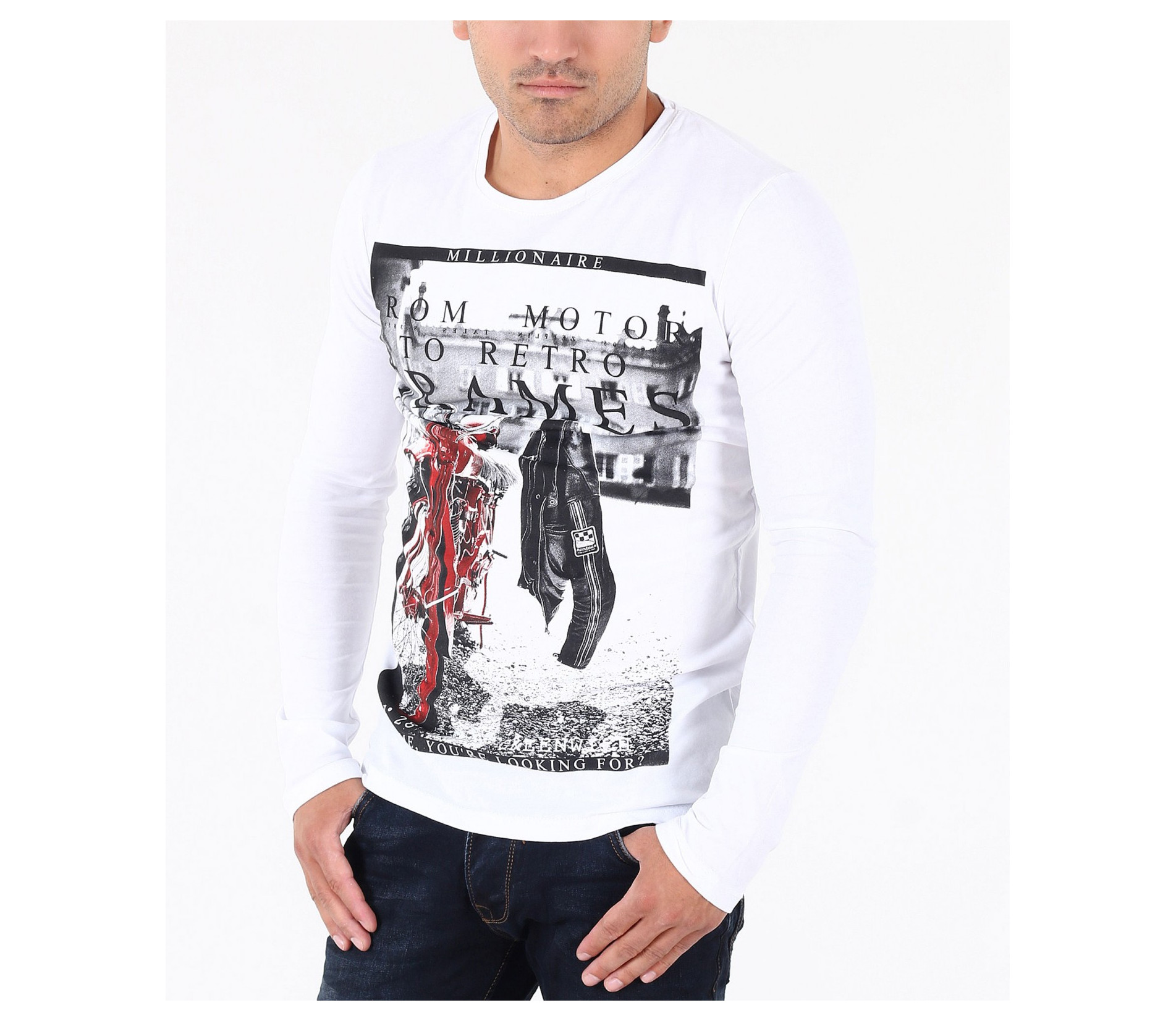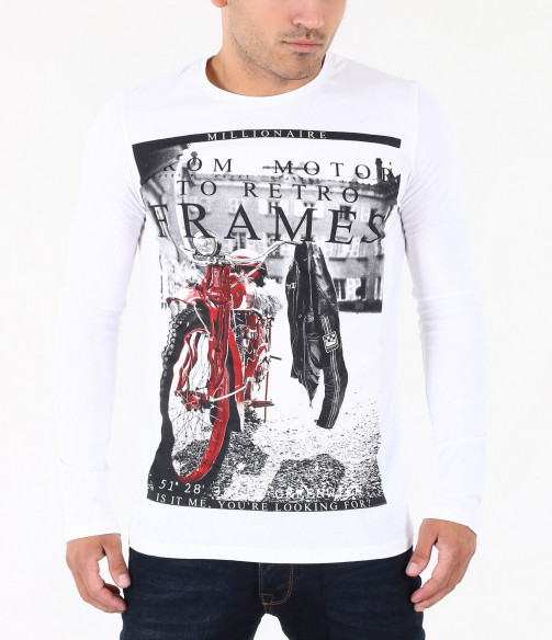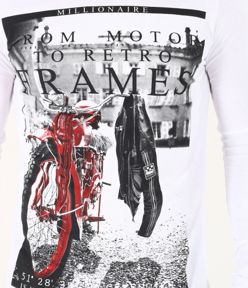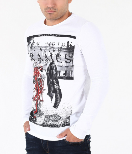 Описание на продукта: Модерна мъжка блуза с дълъг ръкав. В предната част моделът е декориран с интересен принт изобразяващ мотор, в който се преплитат най-актуалните цвтове за сезона: бял, черен и червен. Апликацията наподобява рамка от черни очертания. С вталена кройка, стандартна дължина и овално деколте, този модел се превръща в изключително харесван и желан. Смело съчетавайки блузата с широка гама от цветове на панталони, дънки, обувки или кецове и аксесоари, завършвате уникална fashion визия, подходяща за всеки ден. Изработката е от 100% висококачествен памук.