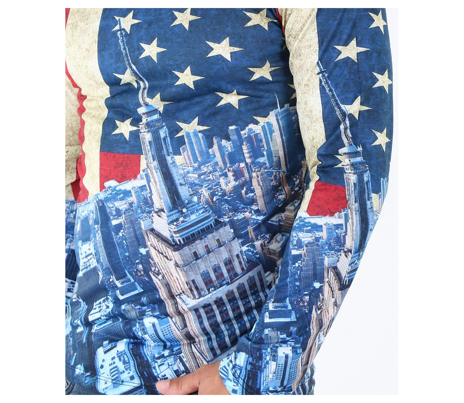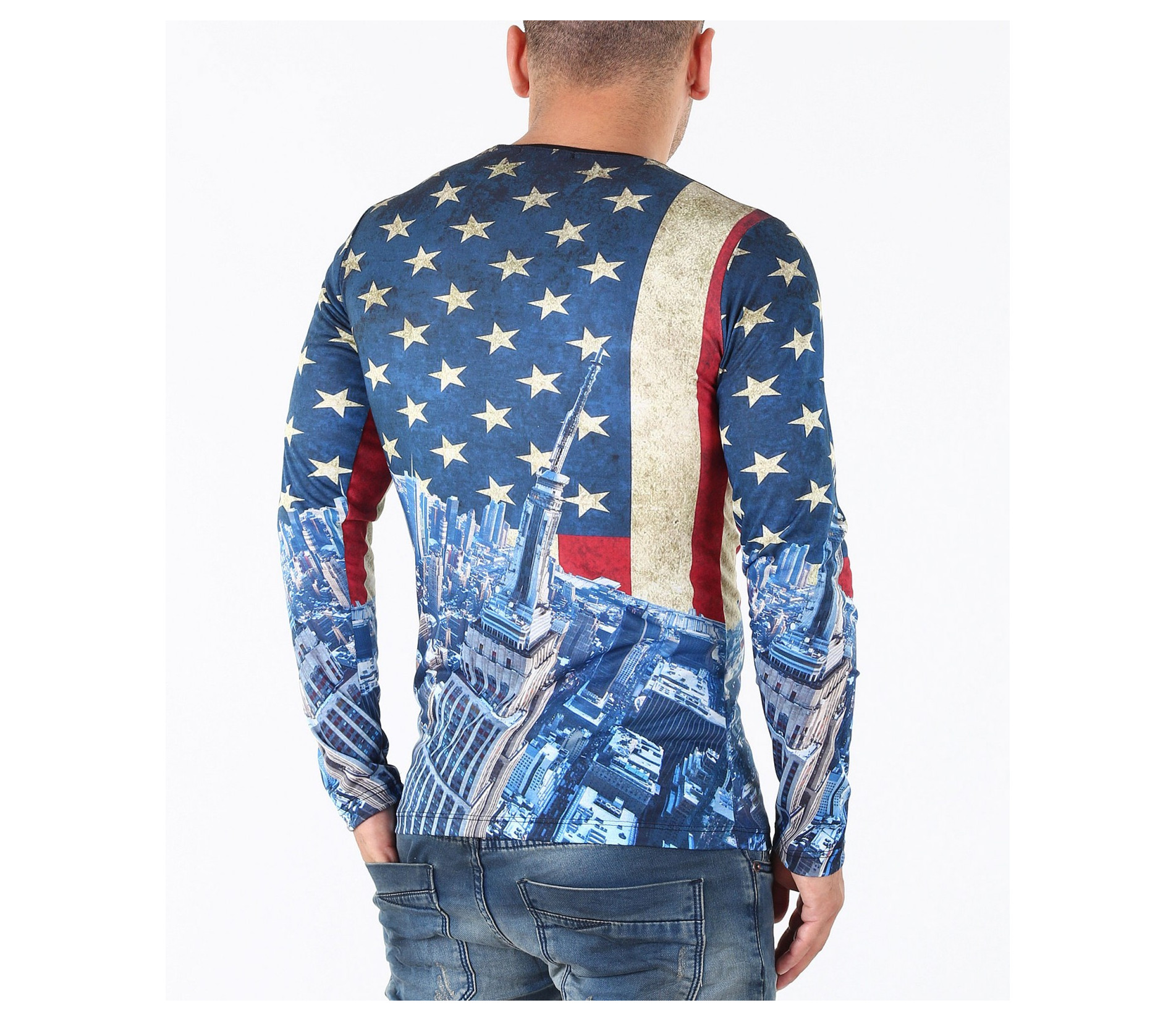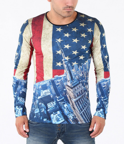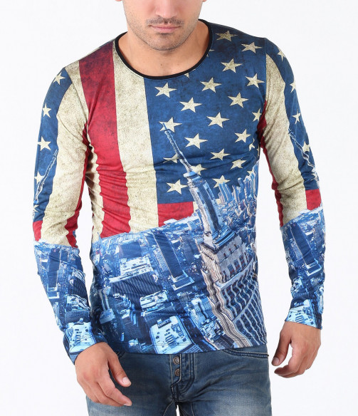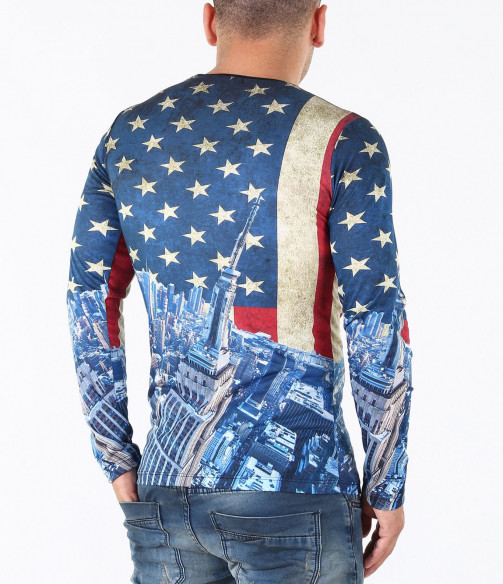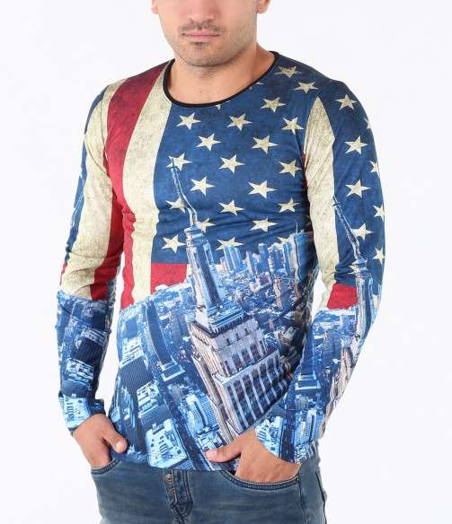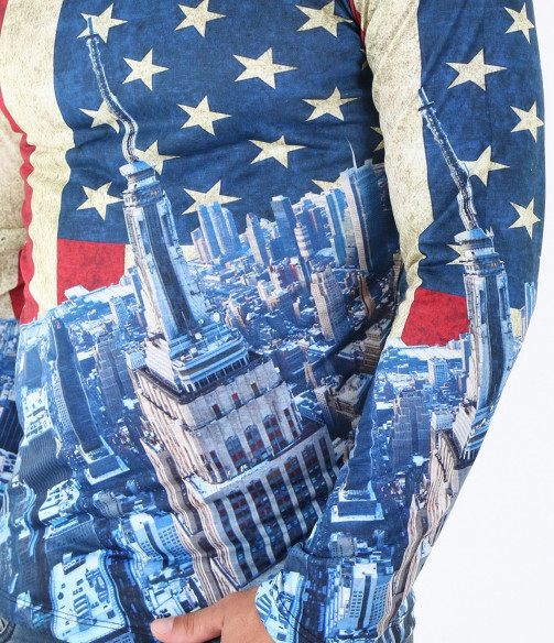 Описание на продукта: Предстаме Ви един супер актуален модел мъжка блуза в модерен принт. Цялостния десен на фанелката изобразява американско знаме, по един по-интересен и впечатляващ начин. В областта на раменете и гърдите е илюстриран американият флаг, а в долната част, сгради символи на Америка. Изключително цветен и свеж модел със силно вталена кройка и прибрано овално деколте, който Ви позволява смело да експериментирате със съчетанието му с други дрехи. В комбинация с модерни дънки, спортен кец и аксесоар по Ваш вкус, получавате уникален сет, гарантирано привличащ погледите.