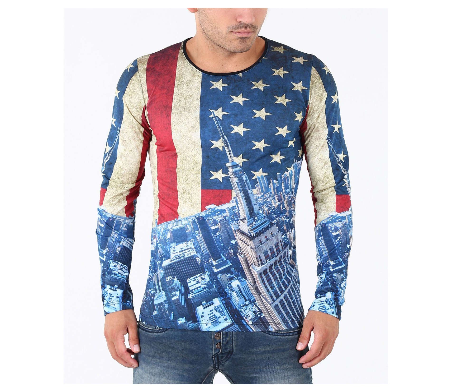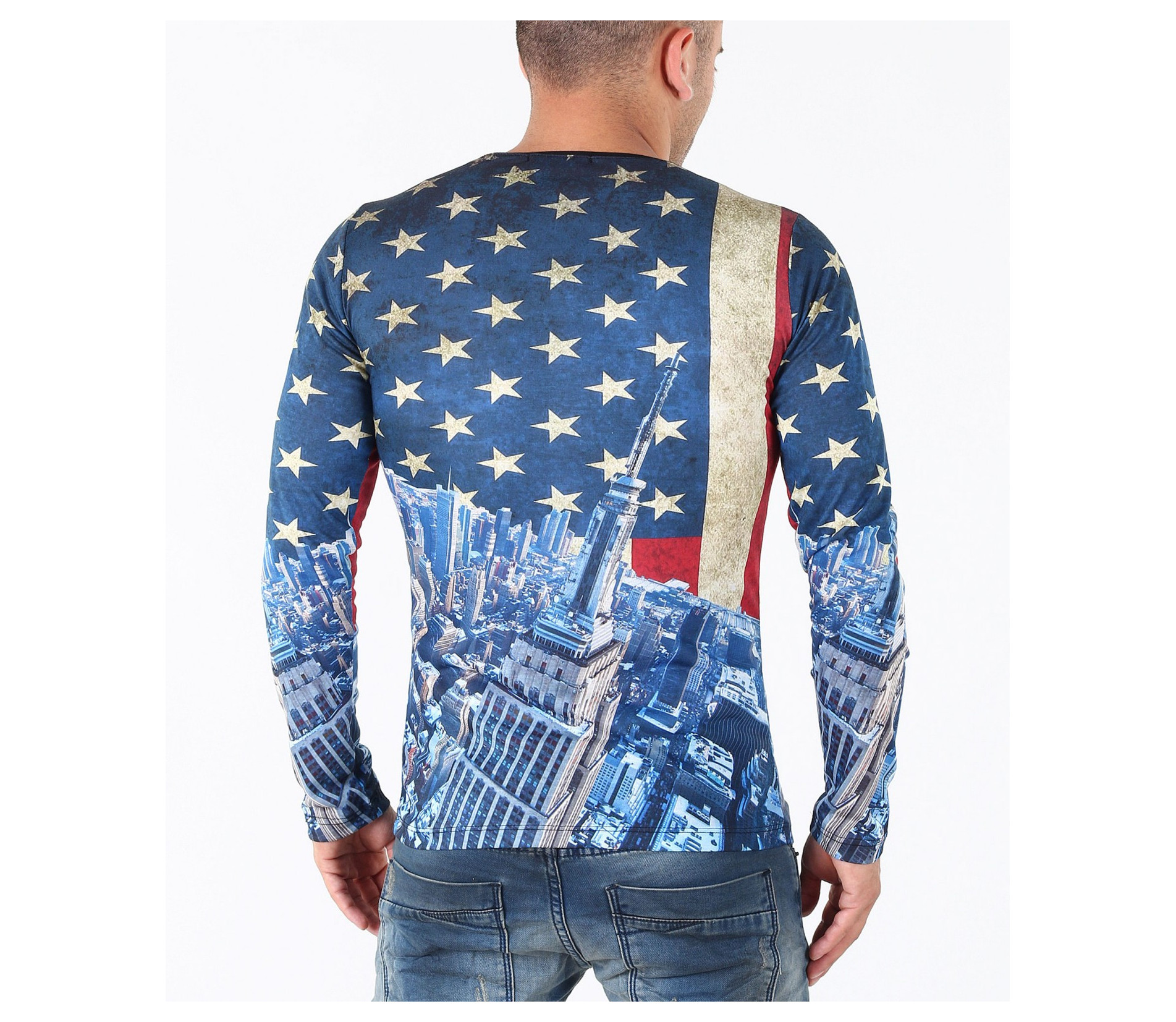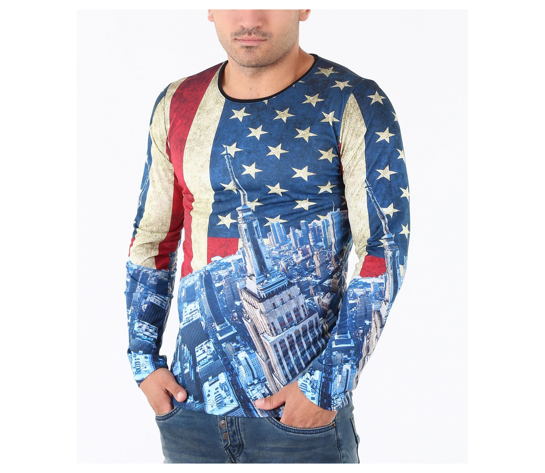 Описание на продукта: Предстаме Ви един супер актуален модел мъжка блуза в модерен принт. Цялостния десен на фанелката изобразява американско знаме, по един по-интересен и впечатляващ начин. В областта на раменете и гърдите е илюстриран американият флаг, а в долната част, сгради символи на Америка. Изключително цветен и свеж модел със силно вталена кройка и прибрано овално деколте, който Ви позволява смело да експериментирате със съчетанието му с други дрехи. В комбинация с модерни дънки, спортен кец и аксесоар по Ваш вкус, получавате уникален сет, гарантирано привличащ погледите.