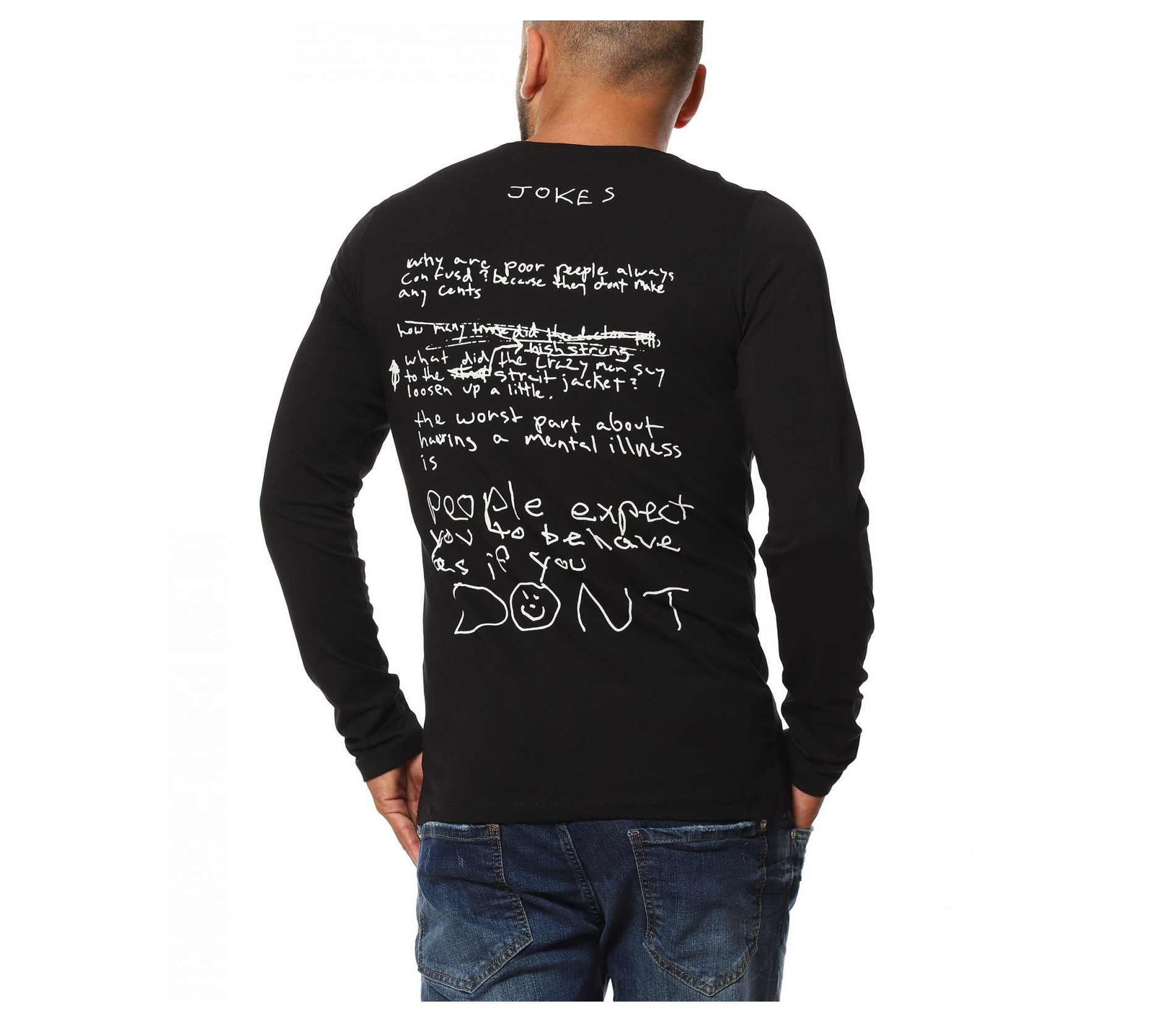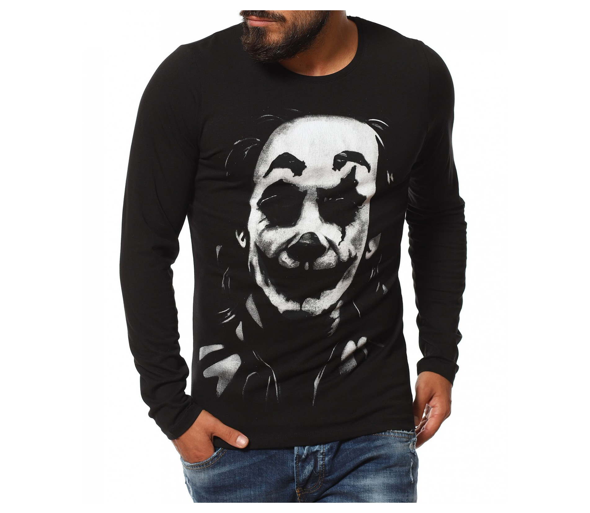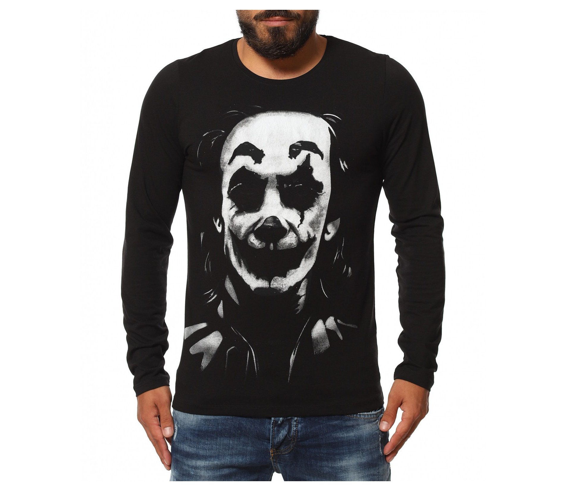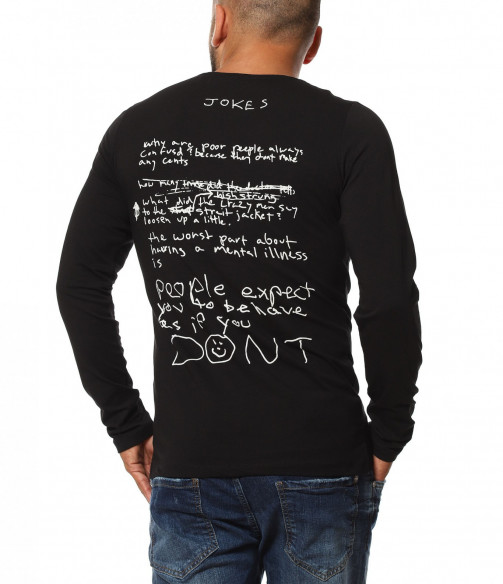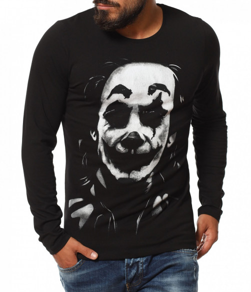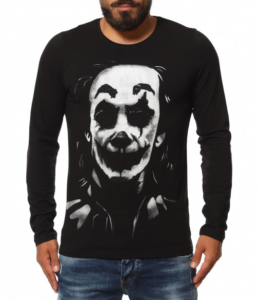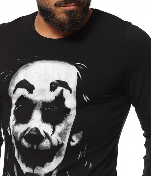 Описание на продукта: За тези от Вас, които предпочитат по-семплия имидж, но въпреки това имате нужда от поне малка провокация, за да се чувствате абсолютно в свои води, то насладете се на новото ни предложение в категория „Блузи“. Върху наситена черна основа е разположена масивна щампа, в предната част. Изобразяваща лика на така актуалния герои „The Joker”, създава усещане за загадъчност и модерно излъчване. Апликацията е израобтена под формата на светлосенки, които очертават дори и най-малките детайли по облика на героят. Освен този принт, гърба също е допълнен от интересен акцент от текст, имитиращ ръкописен почерк на малко дете. Всички тези провокативни елементи са съчетани в slim линия, изработена от памучна и леко еластична материя. За финал е поставено деликатно овално деколте, което слага удивителния знак в края на декорацията.