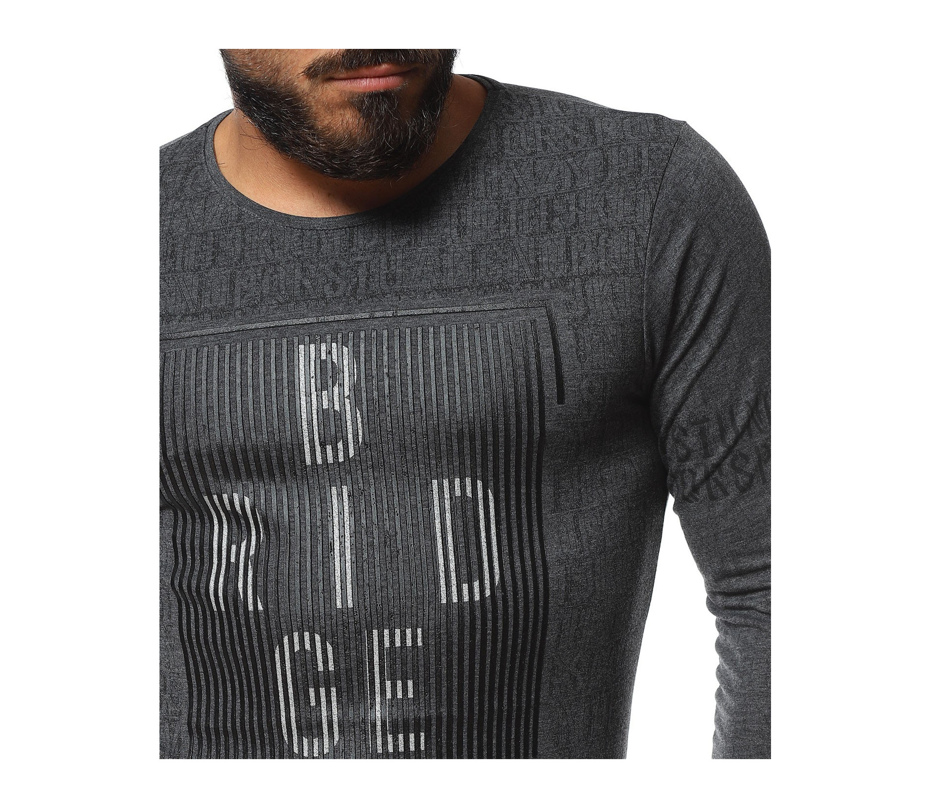 Описание на продукта: Ако сте фен на запомнящата се и различна визия, то ние сме Ви подготвили един модел мъжка блуза, съчетаваща в себе си набор от орнаменти, перфектно свързани по между си. Започваме с основата, която откривате в три нюанса: бял, бежов и сив. И трите варианта са декорирани идентично, започвайки от покритата основа с бледи надписи, обикаляща торса и тъкавите. По наситени се образуват около бицепсите, имитиращи пристягане. За ярък контраст е използвана масивна щампа при гърдите, изобразяваща черно вертикално райе, тип баркод. Този елемент е плътно следващ и допълващ следващия, а именно издължаването с тъмна лента в долната част. Финалния мотив държи средно големия орнаменти в долната част, който е релефен и изграден от две части. Всички тези акценти се събират в една силно вталена кройка, финализирана от класическо овално деколте.