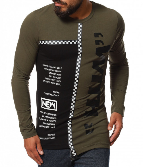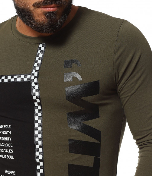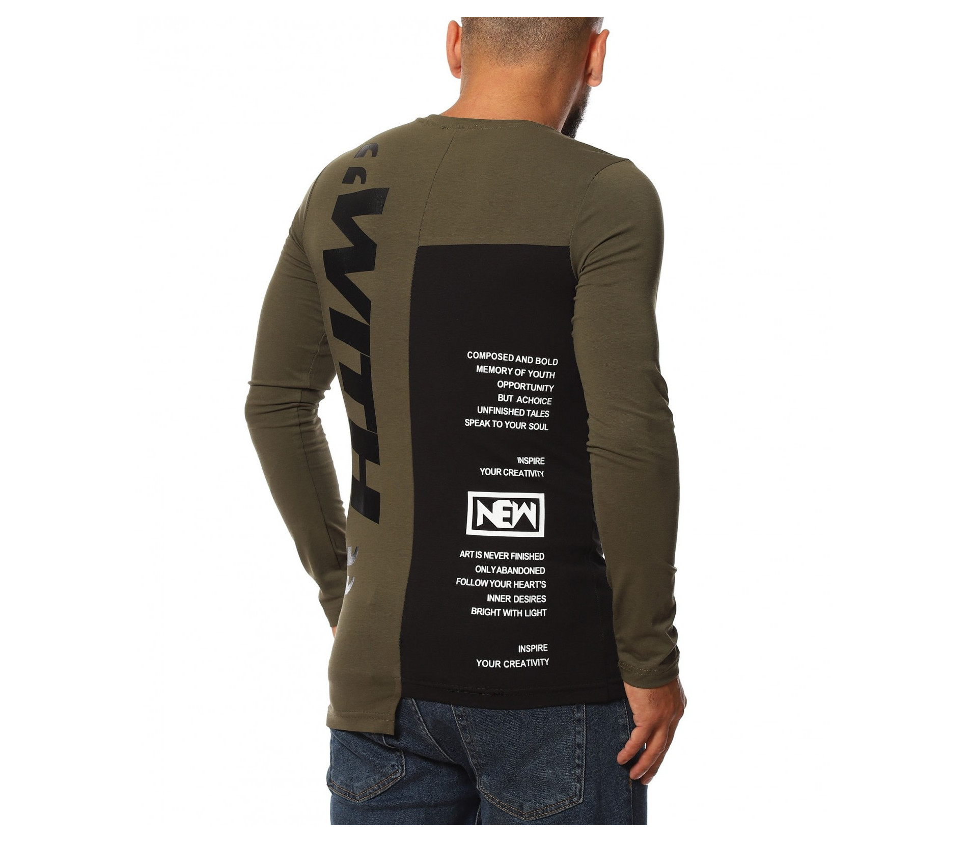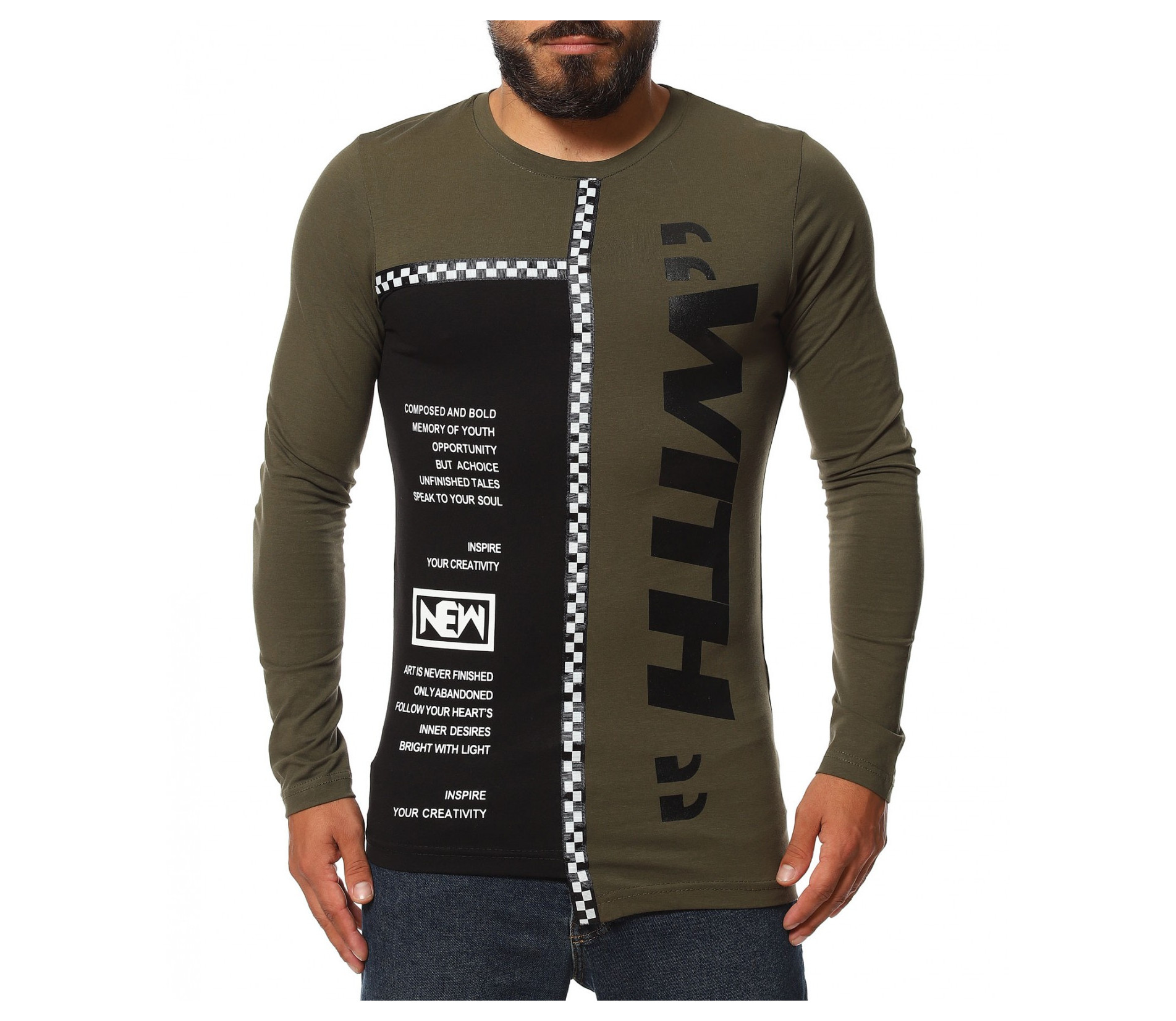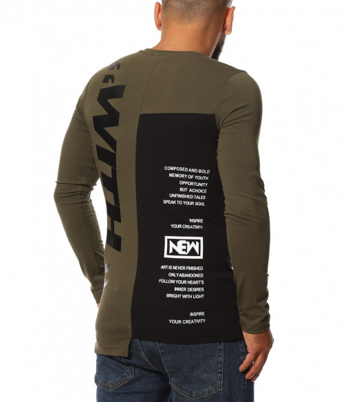 Описание на продукта: Авангарден моделл мжка есенна блуза, изработена  от мека, удобна и еластична материя, прилягаща идеално по тялото. Slim линията изгражда един запомнящ се силует, който е ярко декориран от взаимно допълващи се акценти. Първият от тях е неравномерната дължина, различна от двете страни. Една от страните е иизпъстрена в черен цвят, декориран от контрастни щампи, а другата в по-ярка багра. Върху нея е разположен едър надпис What, коjто допълнително раздвижват дизайнът. двете страни на тениската с дълъг ръкав са разделени от черно бяла лента, елемент вдъхновен от последните модни трендове. Както основата, така и ръкавът са със силно вталена линия. За финал е добавено и семпло овално деколте, което придава нужния баланс между останалите части на тениската. Бъдете екстравагантни, подбирайки ефектни блузи, подходящи както за ежедневен, така и за клубен аутфит.