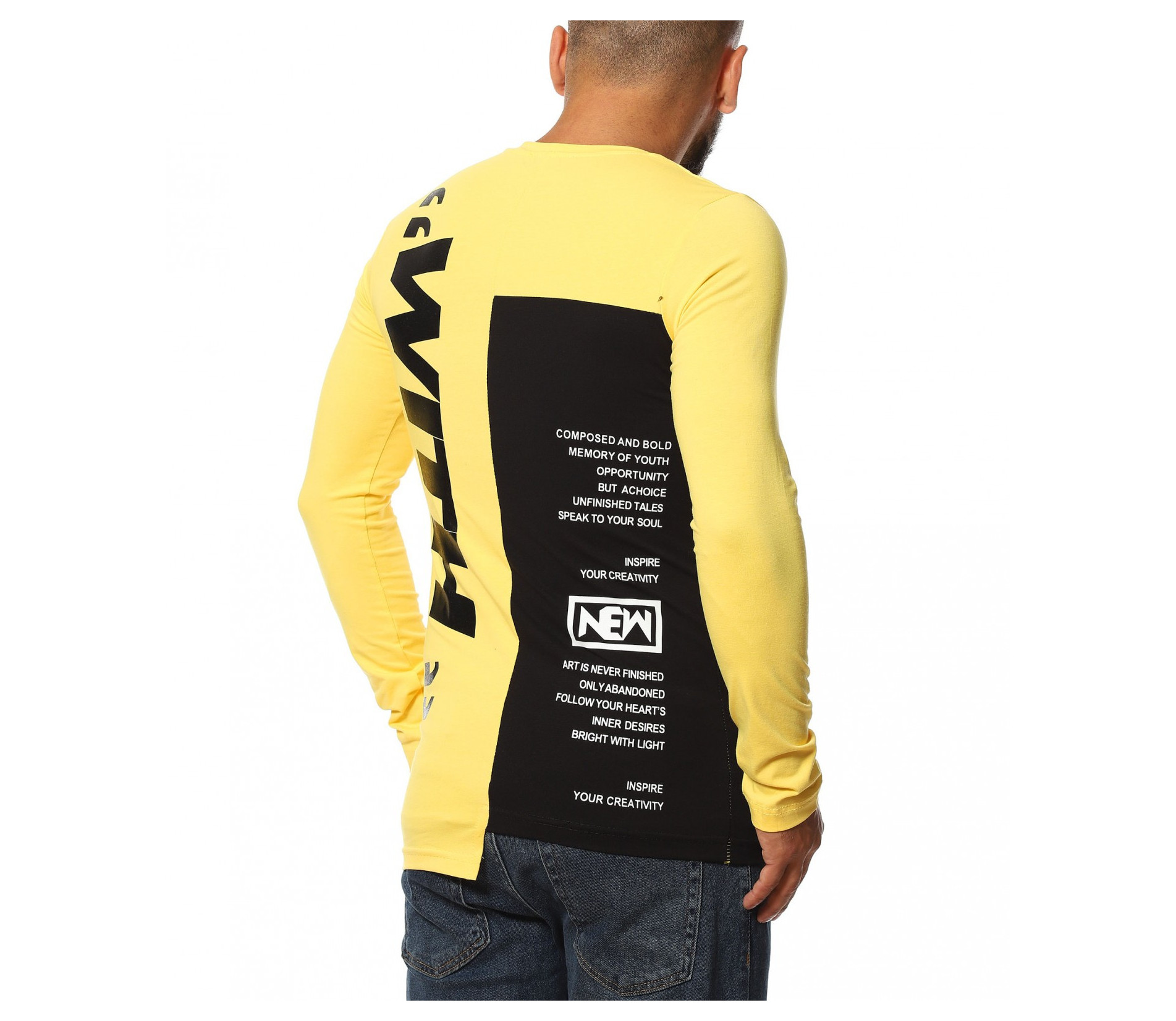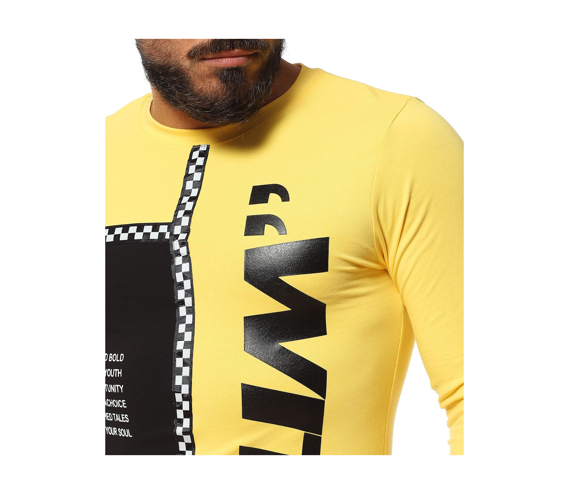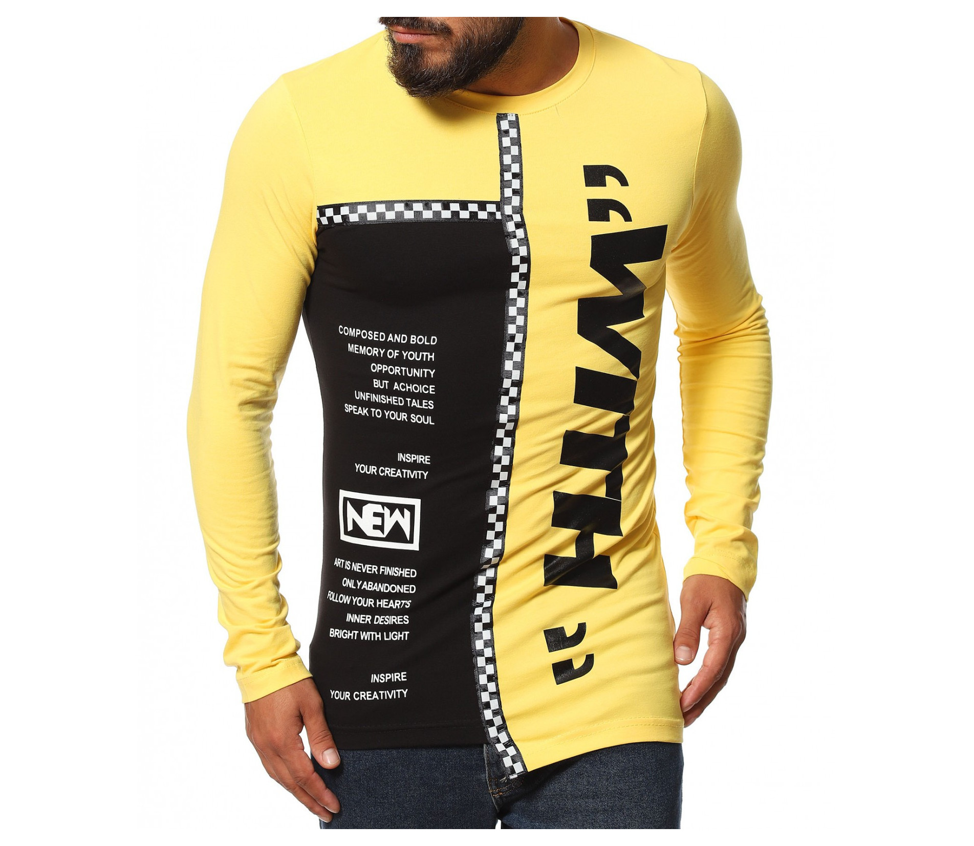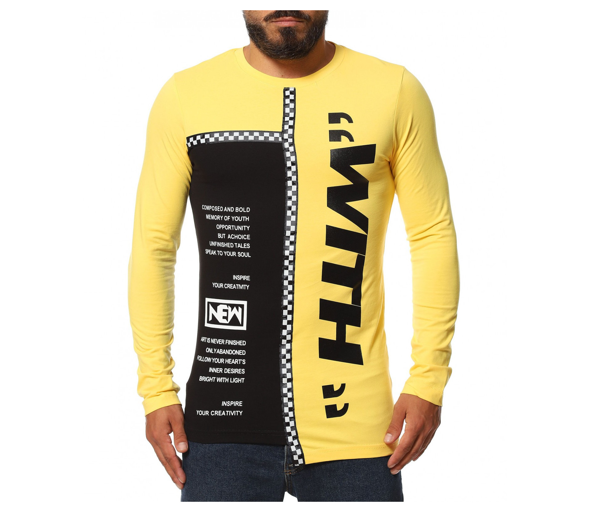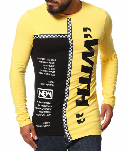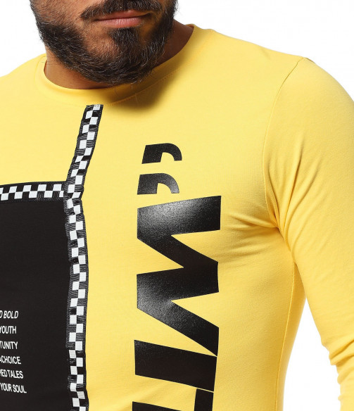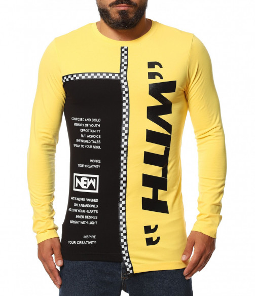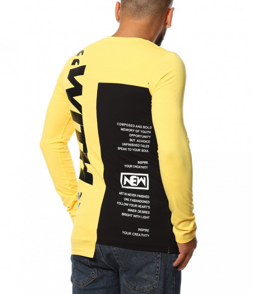 Описание на продукта: Авангарден моделл мжка есенна блуза, изработена  от мека, удобна и еластична материя, прилягаща идеално по тялото. Slim линията изгражда един запомнящ се силует, който е ярко декориран от взаимно допълващи се акценти. Първият от тях е неравномерната дължина, различна от двете страни. Една от страните е иизпъстрена в черен цвят, декориран от контрастни щампи, а другата в по-ярка багра. Върху нея е разположен едър надпис What, коjто допълнително раздвижват дизайнът. двете страни на тениската с дълъг ръкав са разделени от черно бяла лента, елемент вдъхновен от последните модни трендове. Както основата, така и ръкавът са със силно вталена линия. За финал е добавено и семпло овално деколте, което придава нужния баланс между останалите части на тениската. Бъдете екстравагантни, подбирайки ефектни блузи, подходящи както за ежедневен, така и за клубен аутфит.
