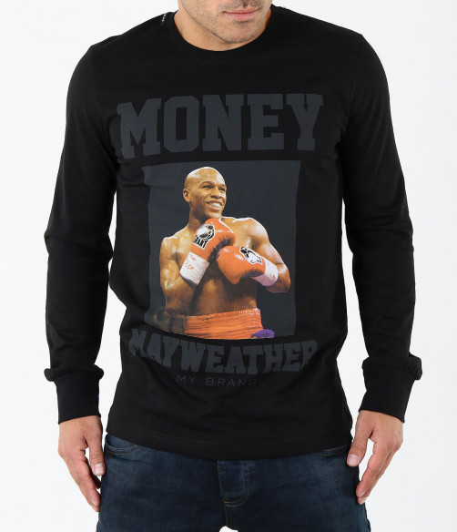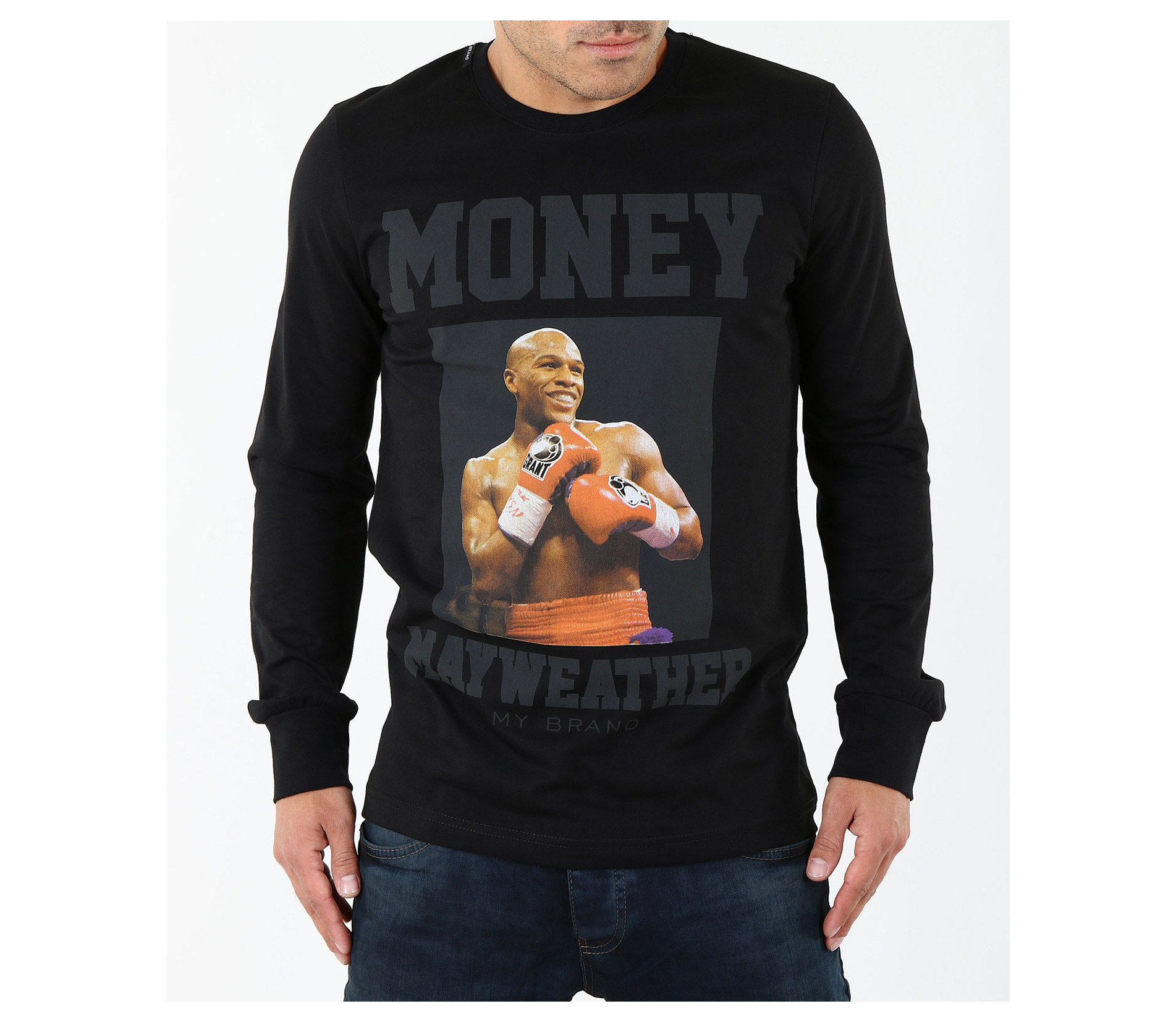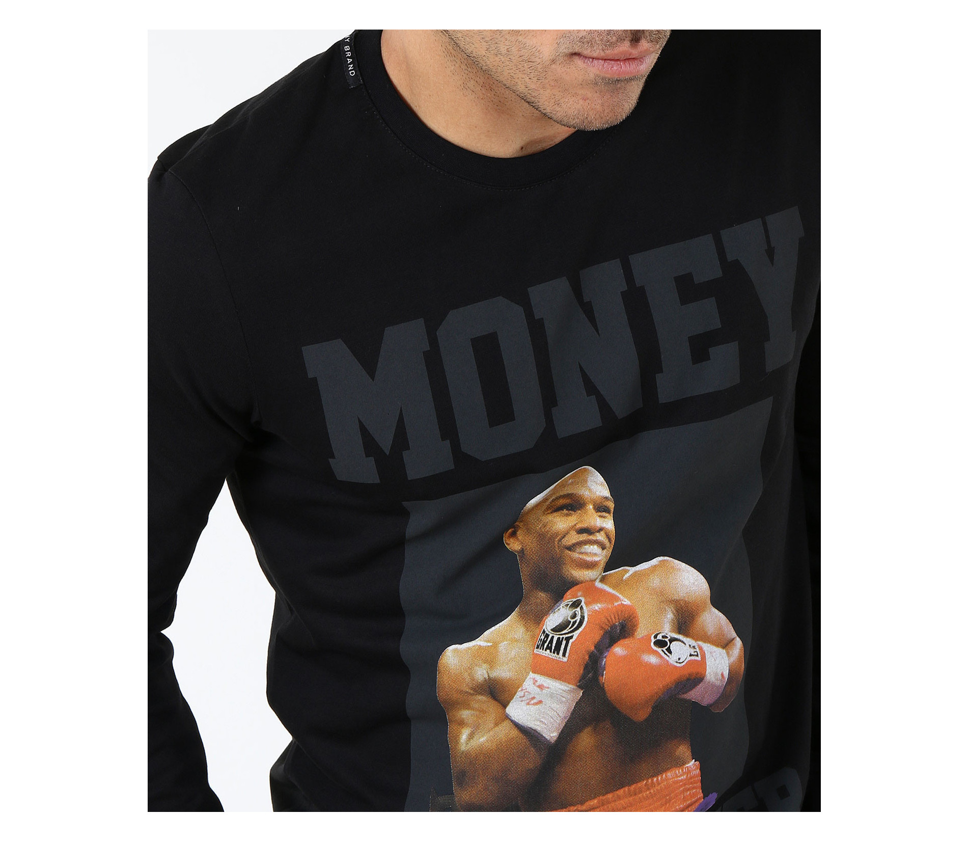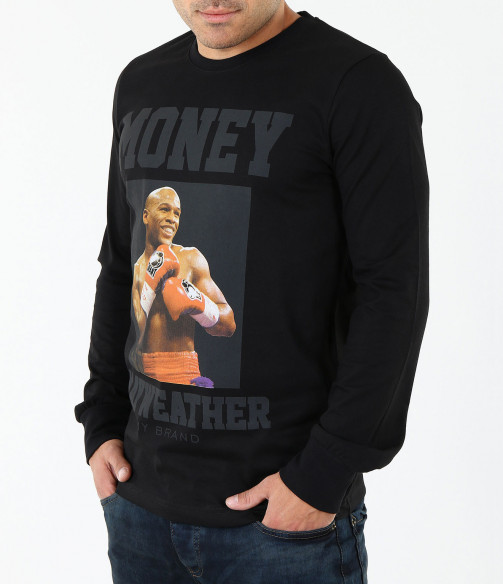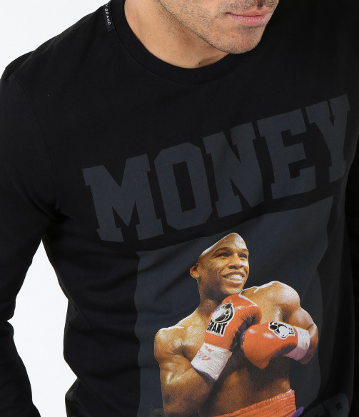 Описание на продукта: Стилна спортна мъжка блуза с апликация.На вниманието Ви е мъжка черна блуза, с апликации за акцент. В лицето на модела е разположена голяма апликация на боксьор,като от двете страни на снимката са разположени надписите MONEY и MAYWEATHER, които допълнително акцентират.В края ръкавите са завършени с дебели ластици в черен цвят.Гърба на модела е не по малко ефектен от предната част.Голяма апликация в надписи подчертава задната част.Блузата е със стандартна дължина, а деколтето е овално.Съчетайте с модерни дънки, кецове,яке и аксесоари за завършена визия.