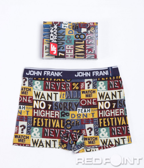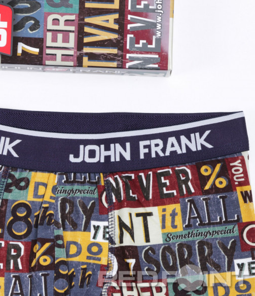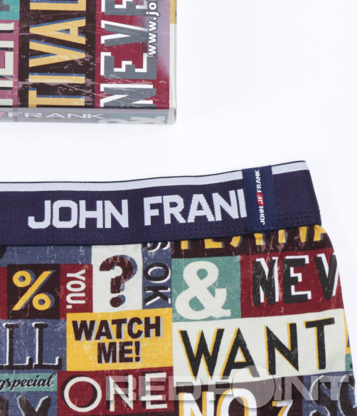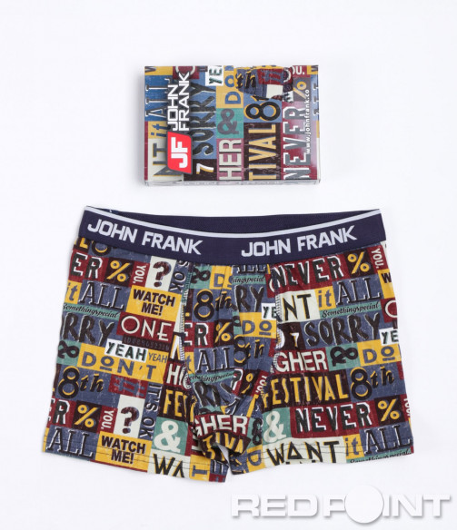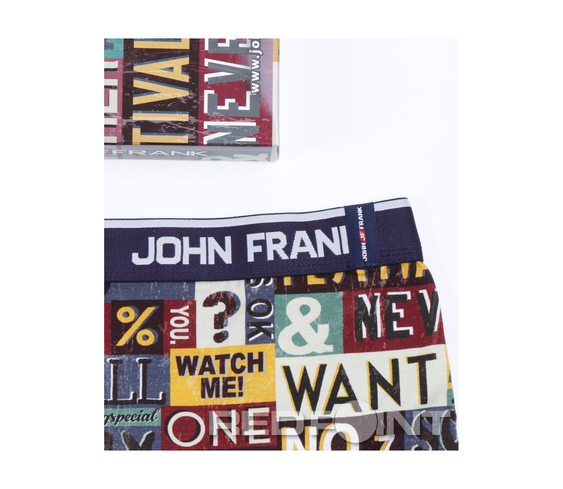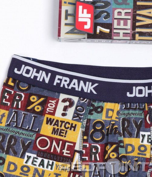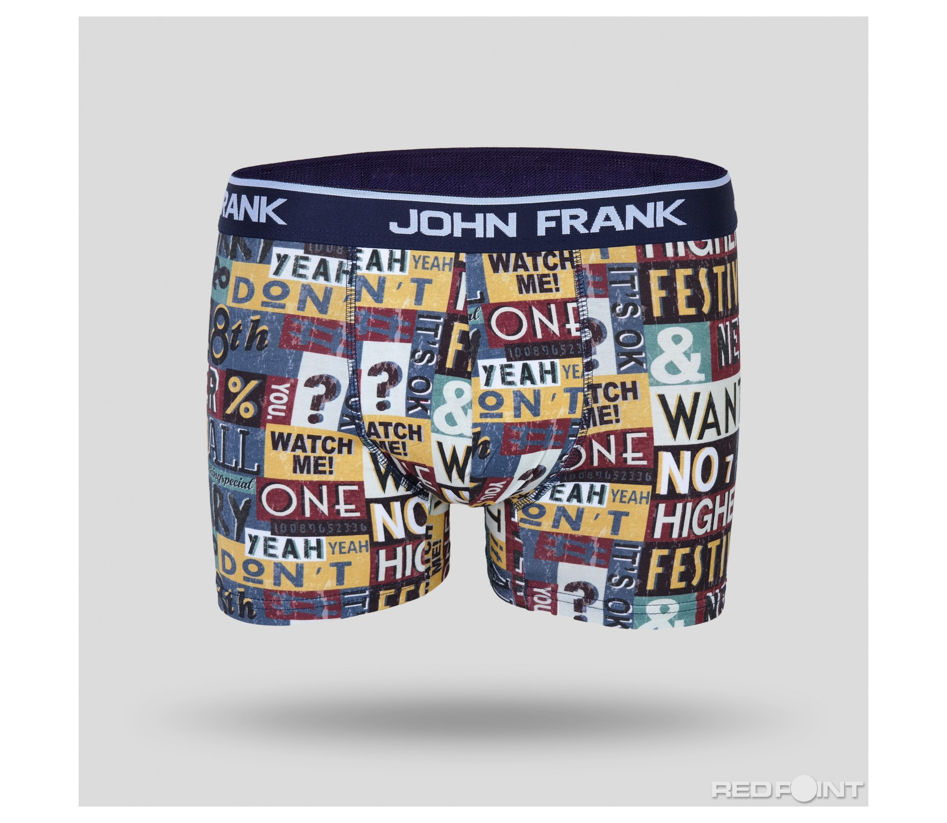 Описание на продукта: Атрактивни мъжки боксерки в черен основен цвят. Над него са поставени интересни апликации с различни послания Watch me.. Sorry.. и други провокации. Като завършек на декоративната част на моделът е поставен широк черен ластик, допълнен от едър надпис John Frank. Освен супер интересен и свеж десен, боксерките впчатляват с уникален дизайн, изработен от естествени материали, комбинирани с лека еластичност, която допринася за гарантирания комфорт. Не правете компромис с една от най-важните части от облекото си, а изберете този интересен и висококачествен модел мъжки бокесрки.