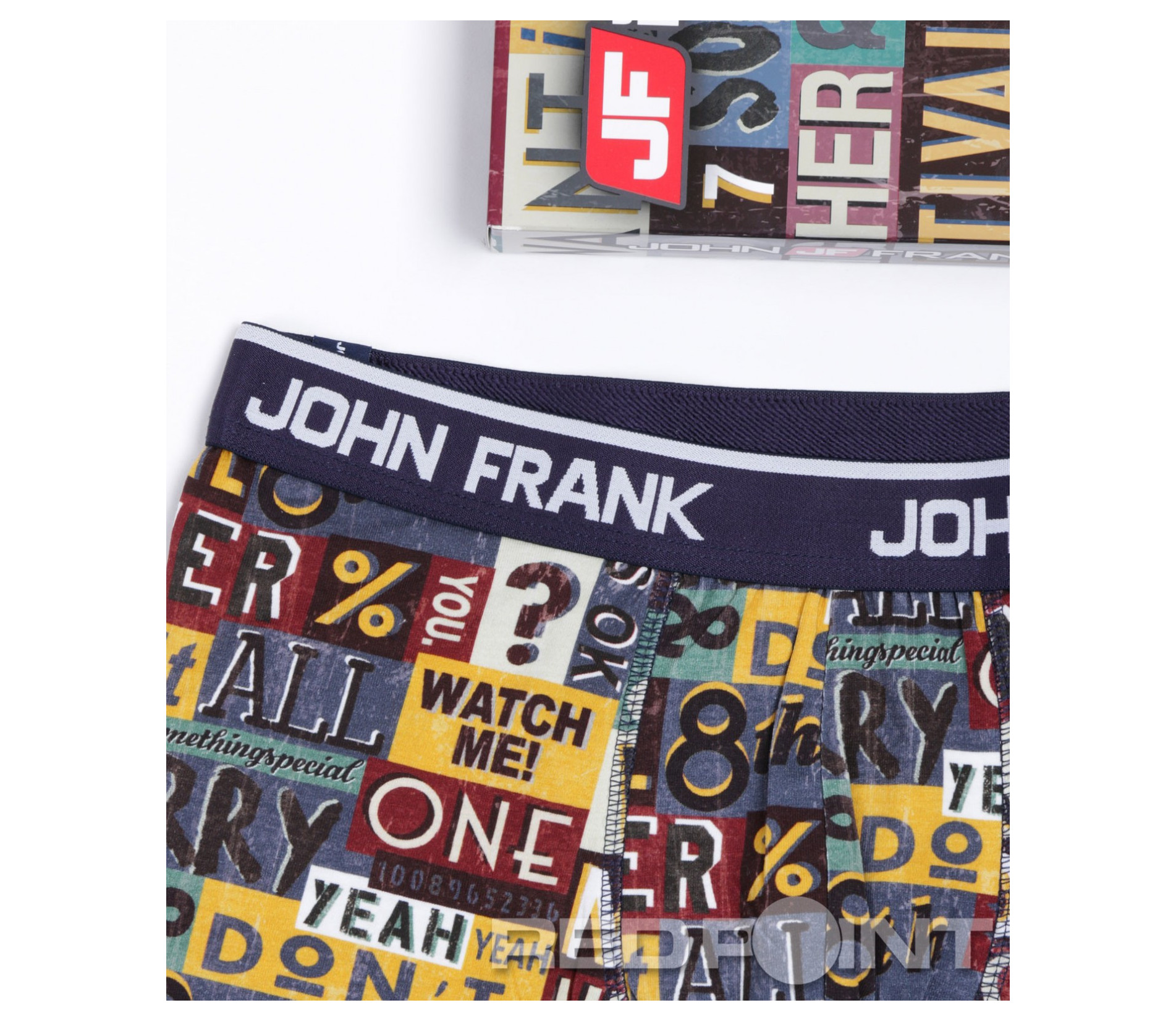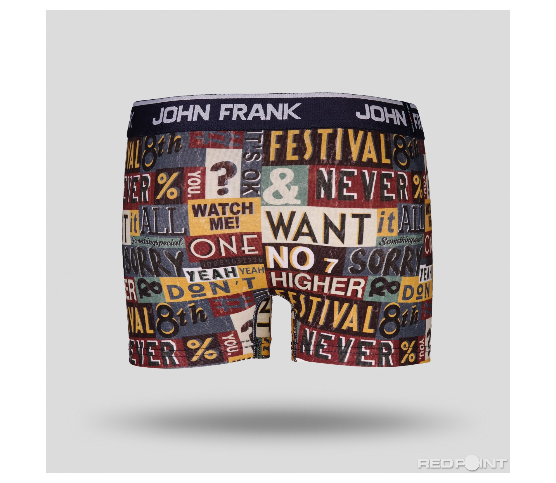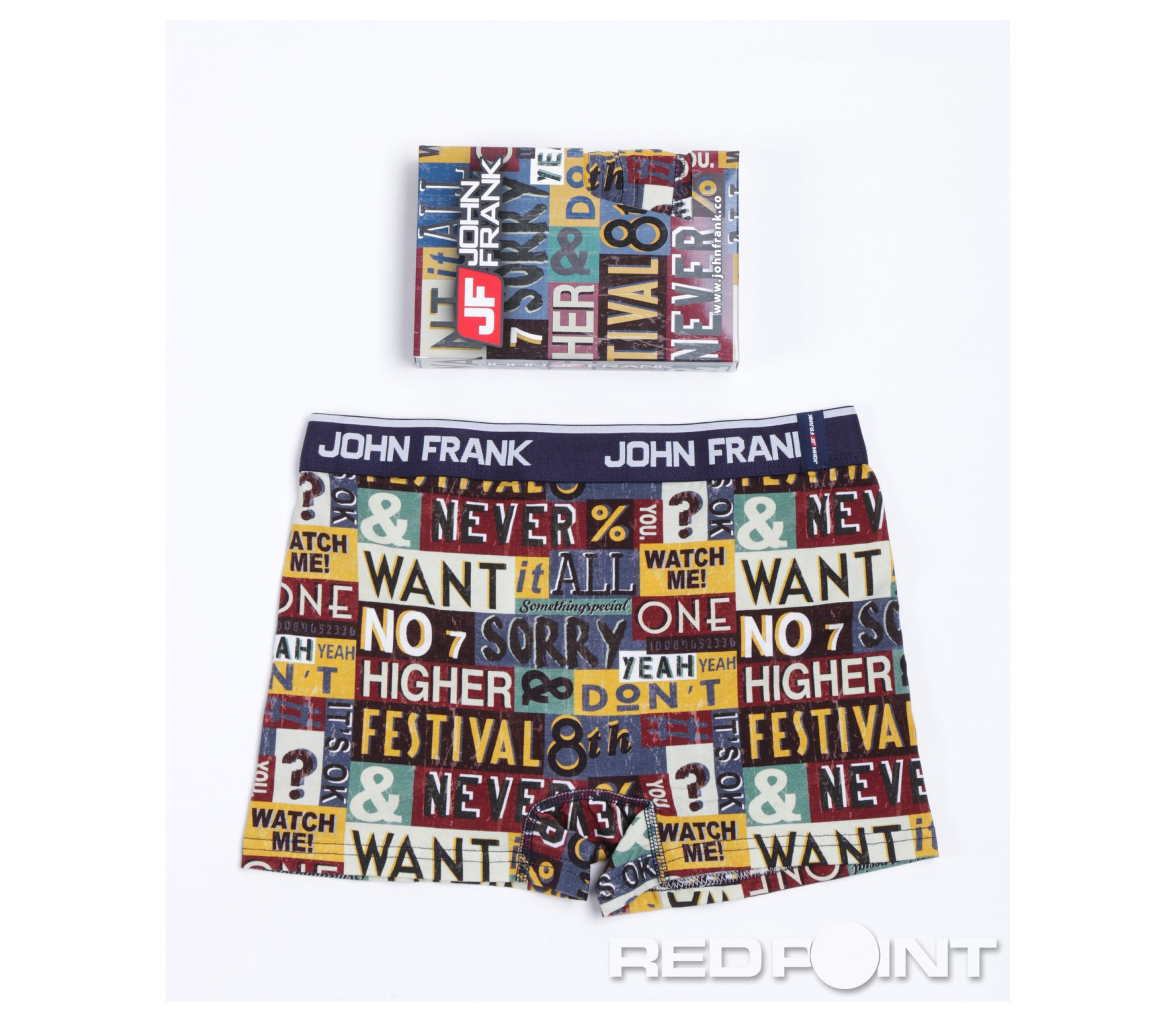 Описание на продукта: Атрактивни мъжки боксерки в черен основен цвят. Над него са поставени интересни апликации с различни послания Watch me.. Sorry.. и други провокации. Като завършек на декоративната част на моделът е поставен широк черен ластик, допълнен от едър надпис John Frank. Освен супер интересен и свеж десен, боксерките впчатляват с уникален дизайн, изработен от естествени материали, комбинирани с лека еластичност, която допринася за гарантирания комфорт. Не правете компромис с една от най-важните части от облекото си, а изберете този интересен и висококачествен модел мъжки бокесрки.