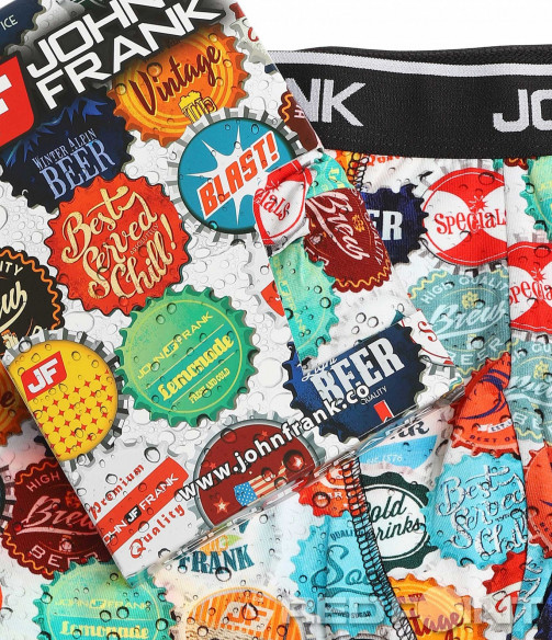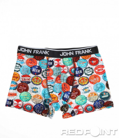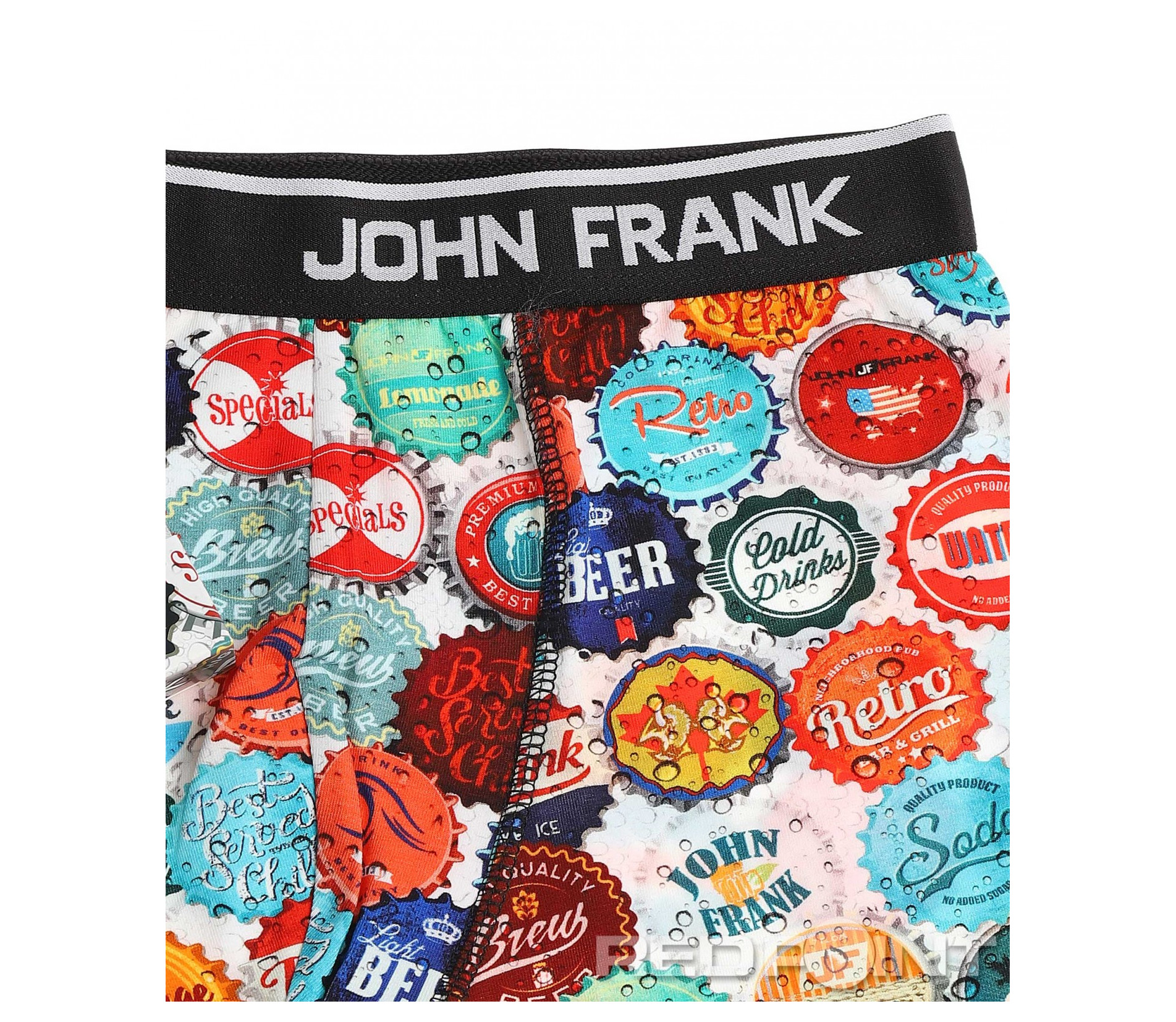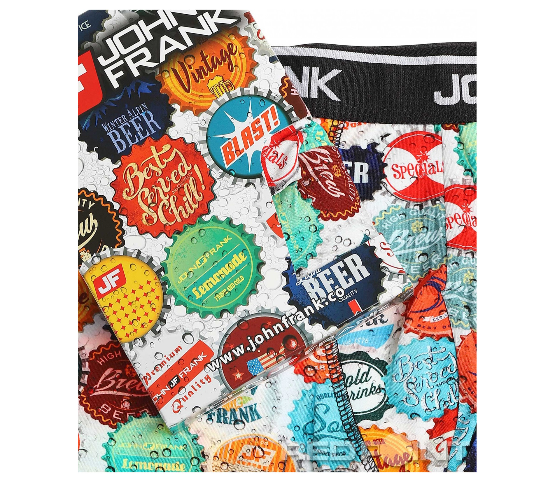 Описание на продукта: Мъжки актуални боксерки с интересни апликации. Самия принт имитира капачки от различни напитки, декорирани с много цветове и надписи. По този начин се създава един шарен и нестандартен десен, впечатляващ с оригиналност и неподражаемост. В областа на кръста има широк ластик в черен цвят с бял надпис с името на марката John Frank. Този модел боксерки се предлага в атрактивна кутия и е перфектен избор за подарък. Заложи на качественото бельо, съставено от памук и еластан, осигурявайки максимален комфорт и чувство на удобство през цялото ежедневие.