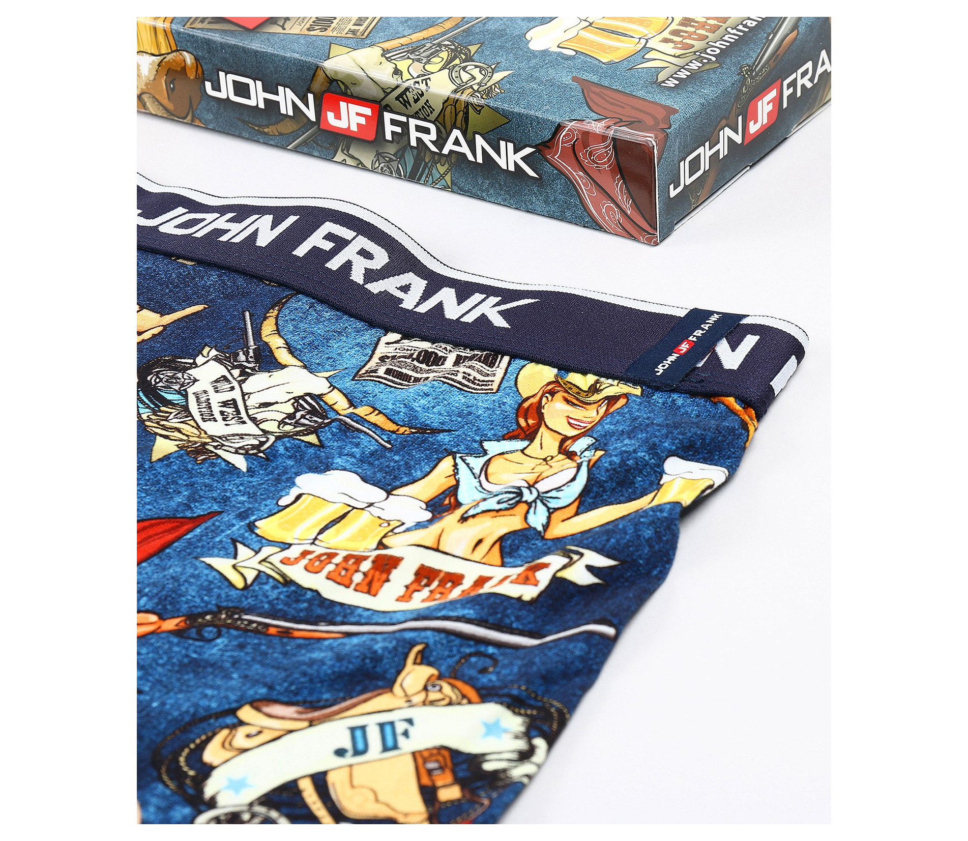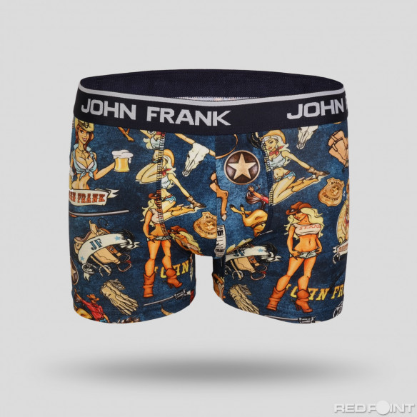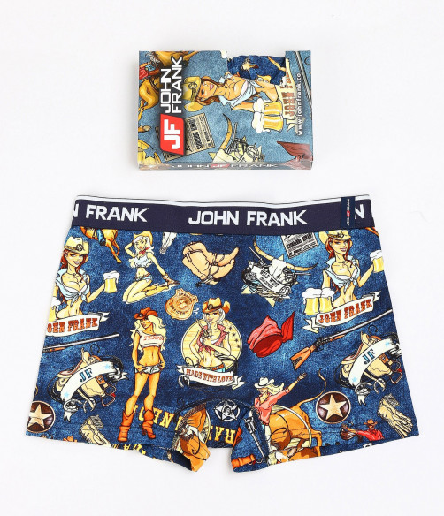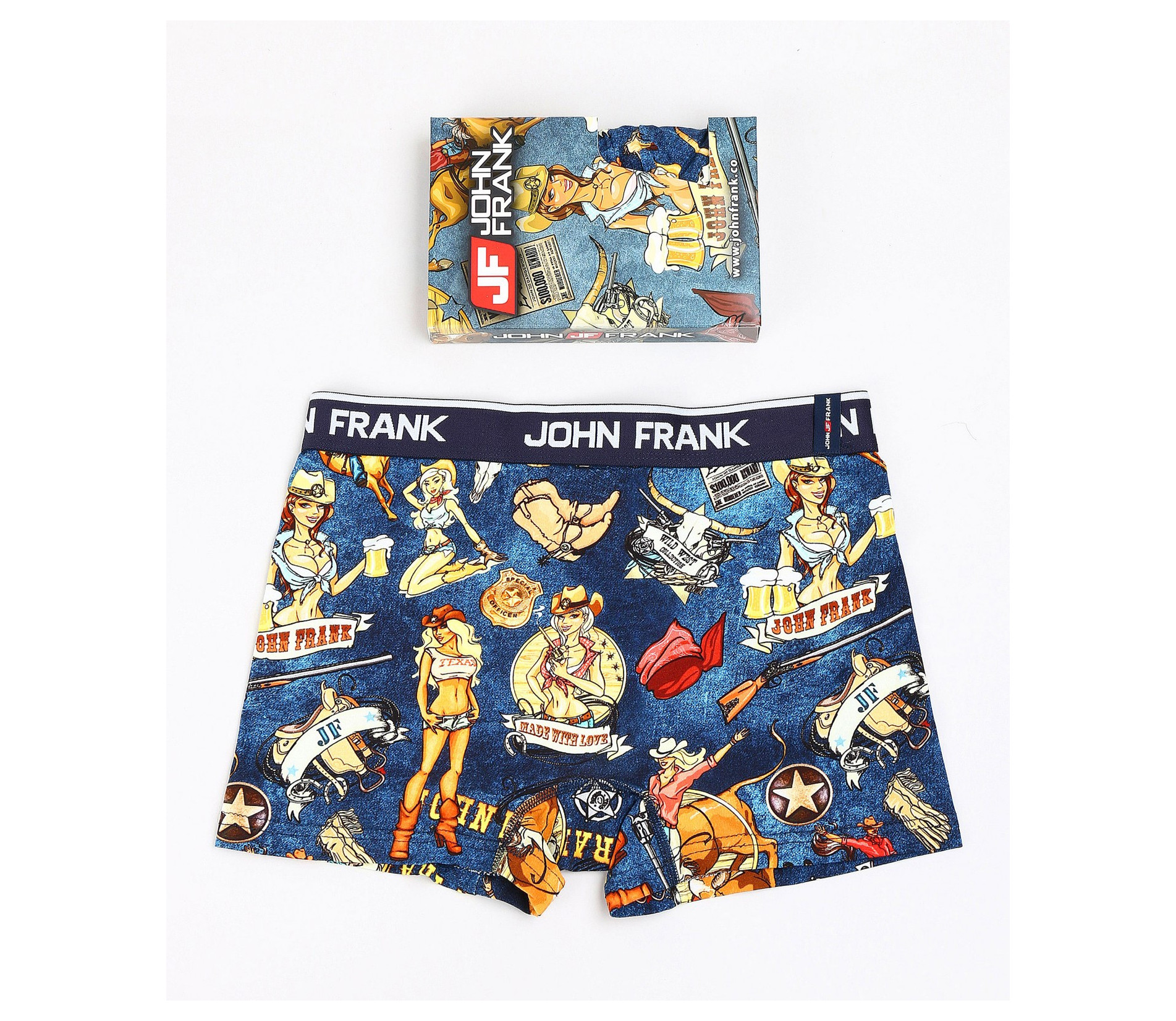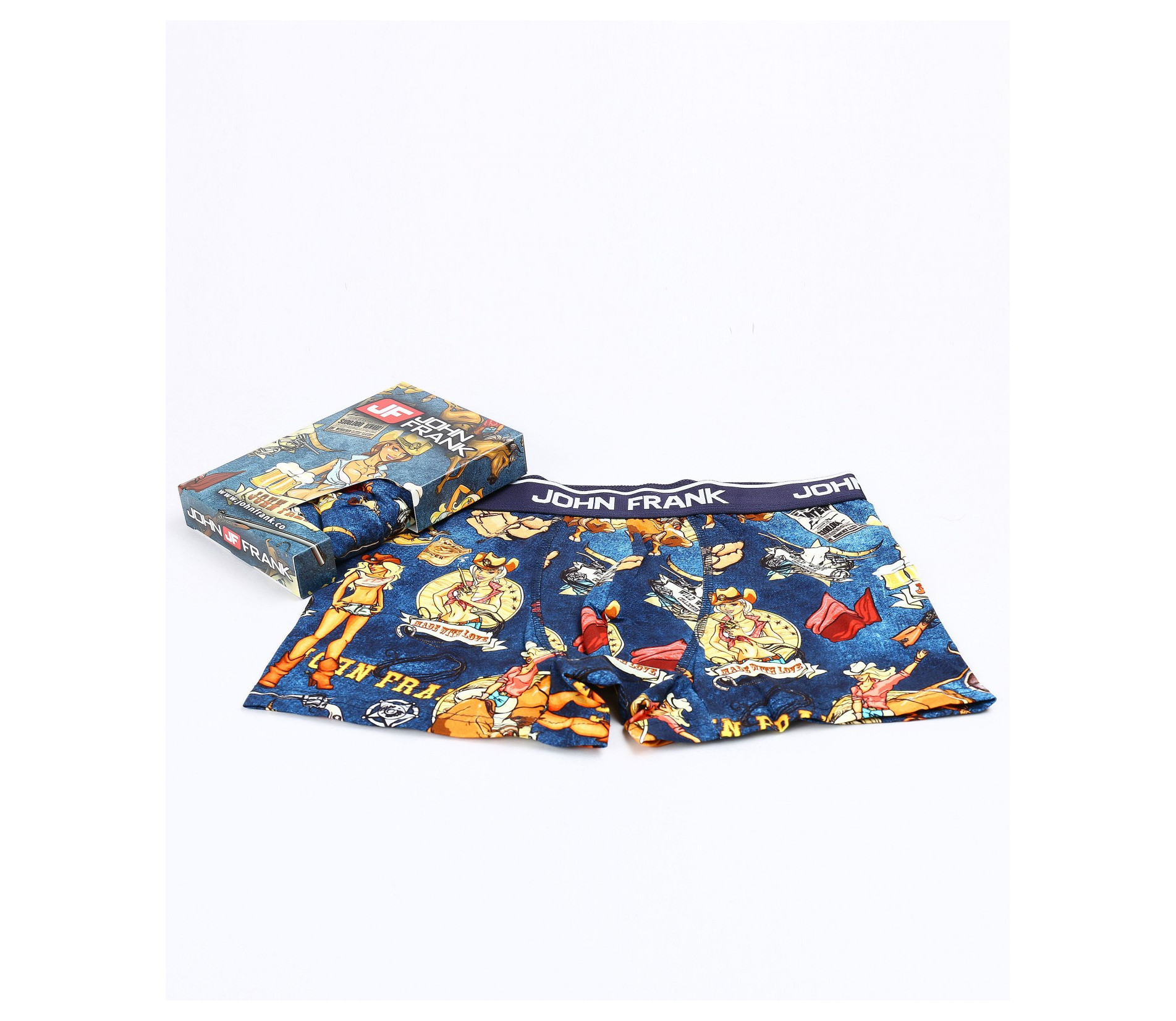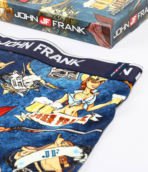 Описание на продукта: Свеж модел мъжки боксерки, изпъстрени в модерните цветове за сезона. Апликацията на моделът е поставена върху изчистен черен десен, който създава перфектен контраст. В принта са вплетени различни щампи изобразяващи каубойски мотиви. В областта на кръста е разположен широк черен ластик, декориран с надпис JOHN FRANK, който Ви създава гарантиран комфорт. Заложете на стилното бельо, като не правите комрпомис с качеството му.