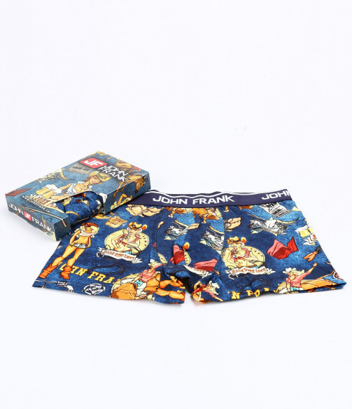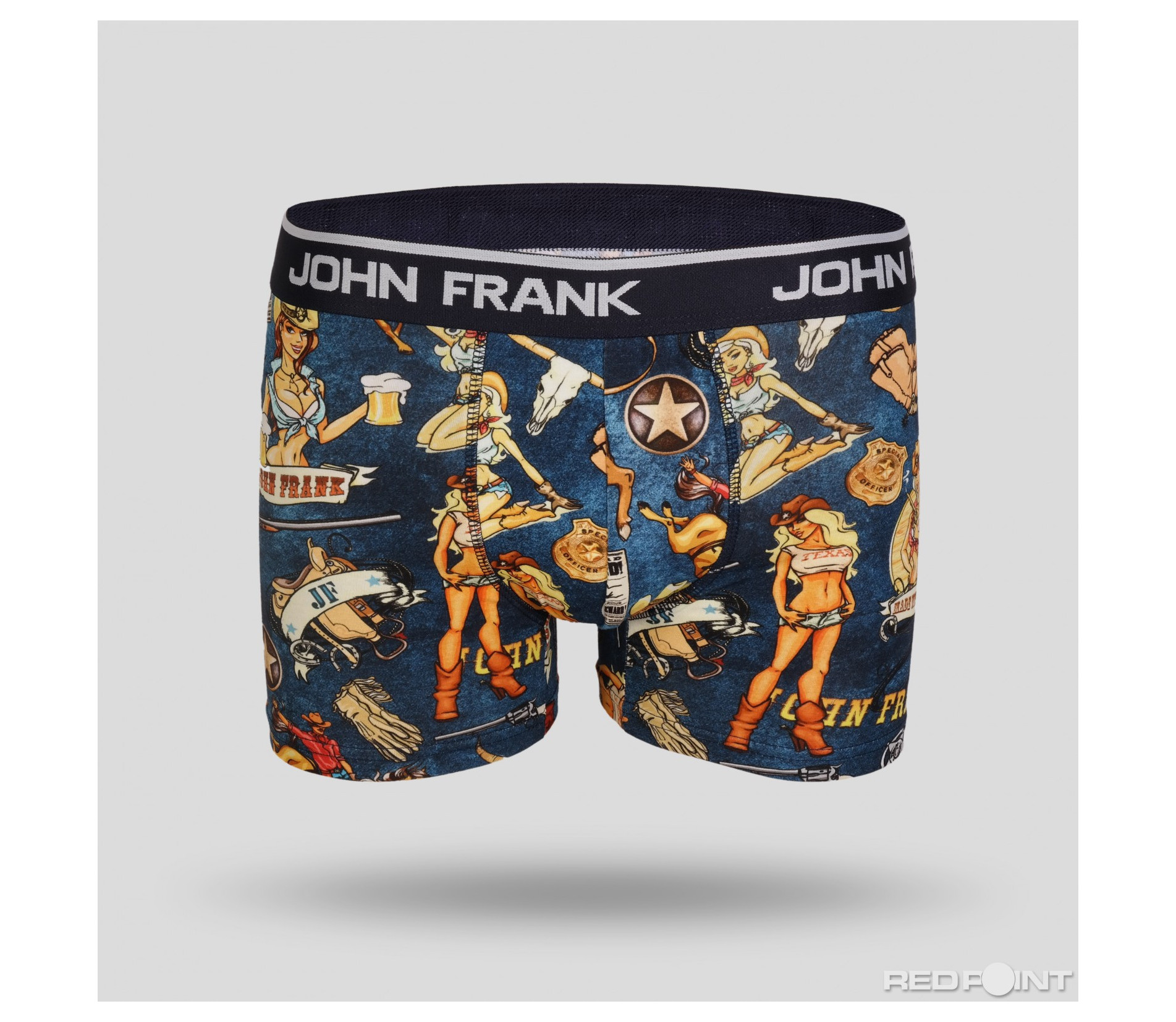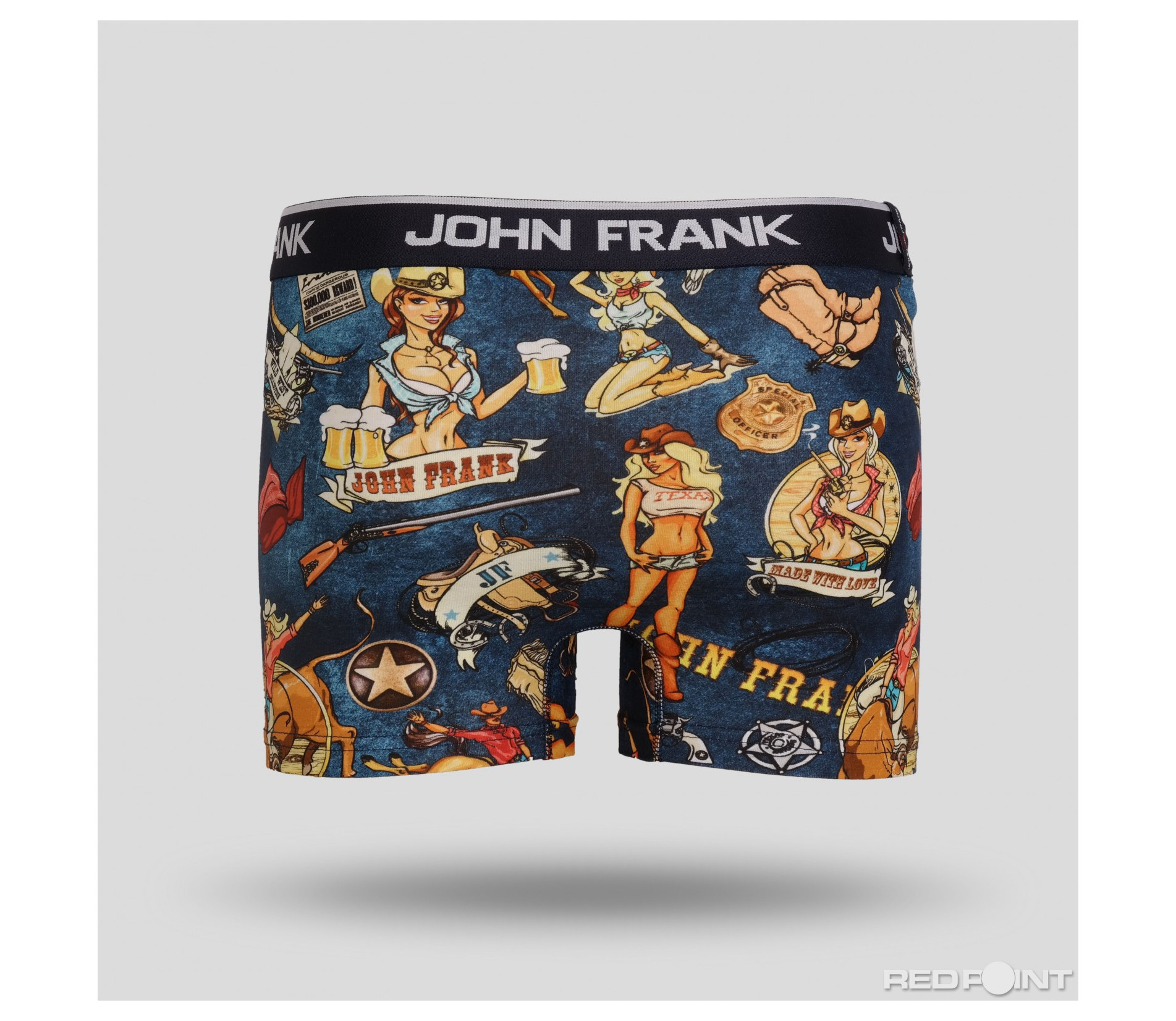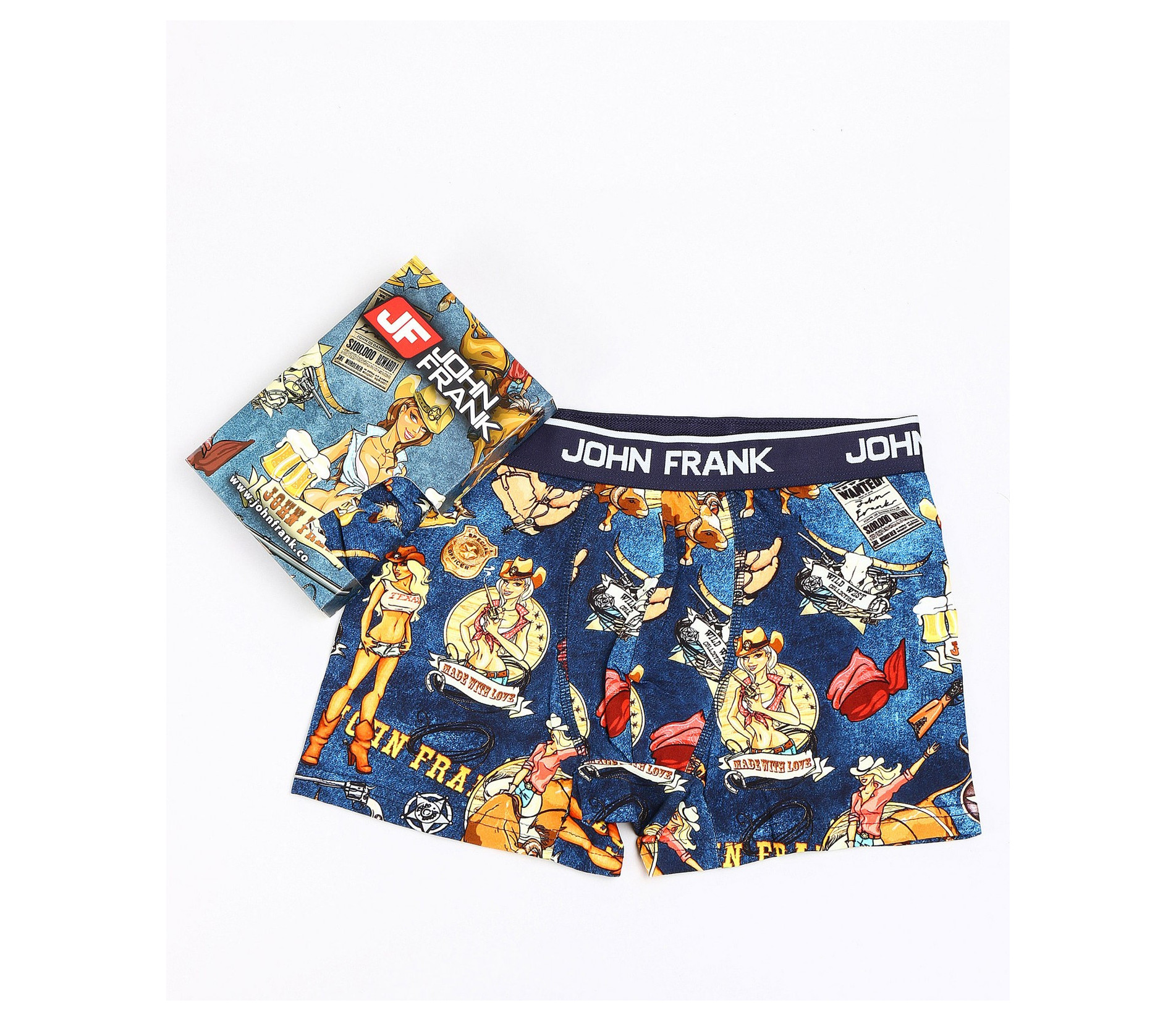 Описание на продукта: Свеж модел мъжки боксерки, изпъстрени в модерните цветове за сезона. Апликацията на моделът е поставена върху изчистен черен десен, който създава перфектен контраст. В принта са вплетени различни щампи изобразяващи каубойски мотиви. В областта на кръста е разположен широк черен ластик, декориран с надпис JOHN FRANK, който Ви създава гарантиран комфорт. Заложете на стилното бельо, като не правите комрпомис с качеството му.