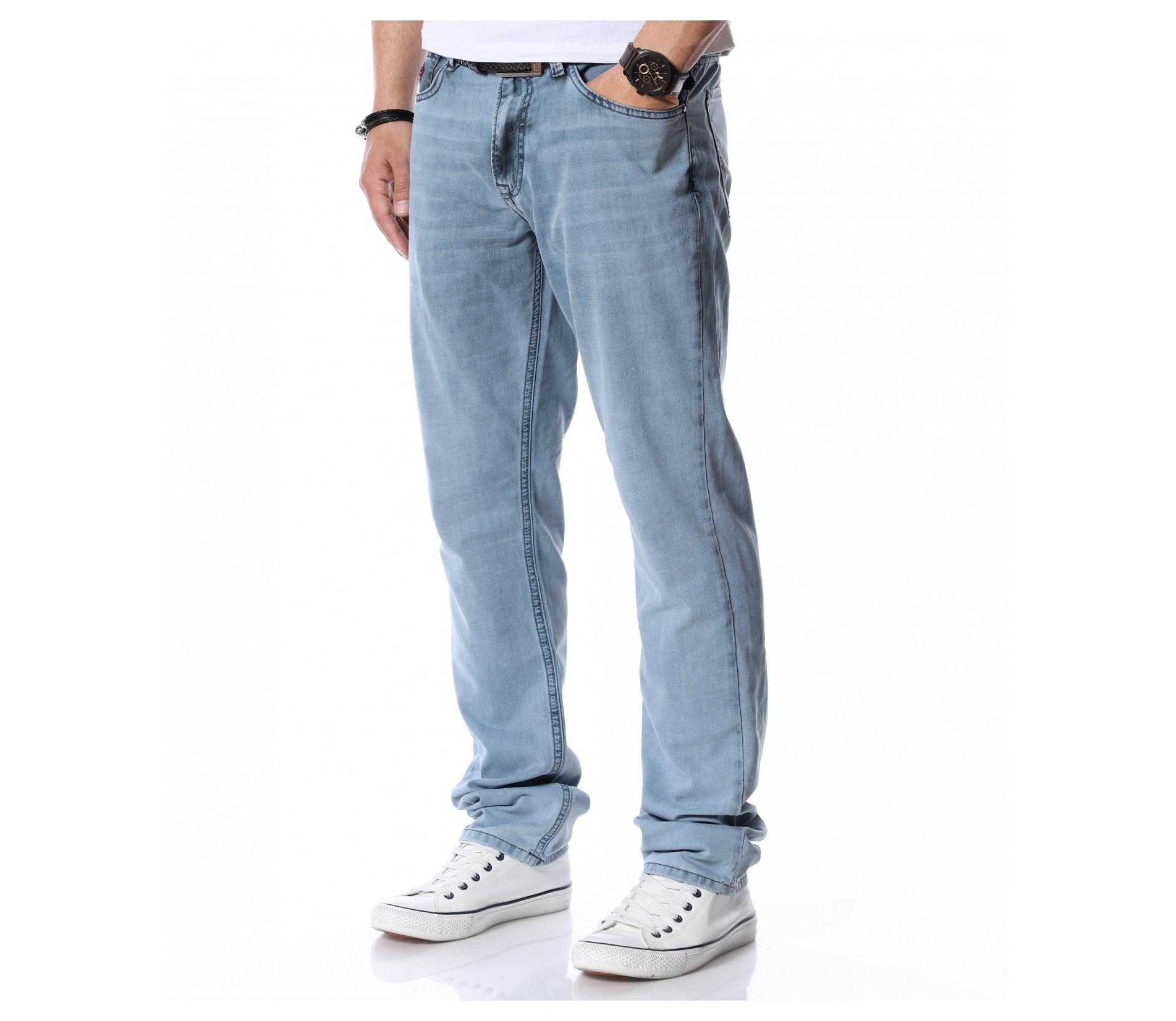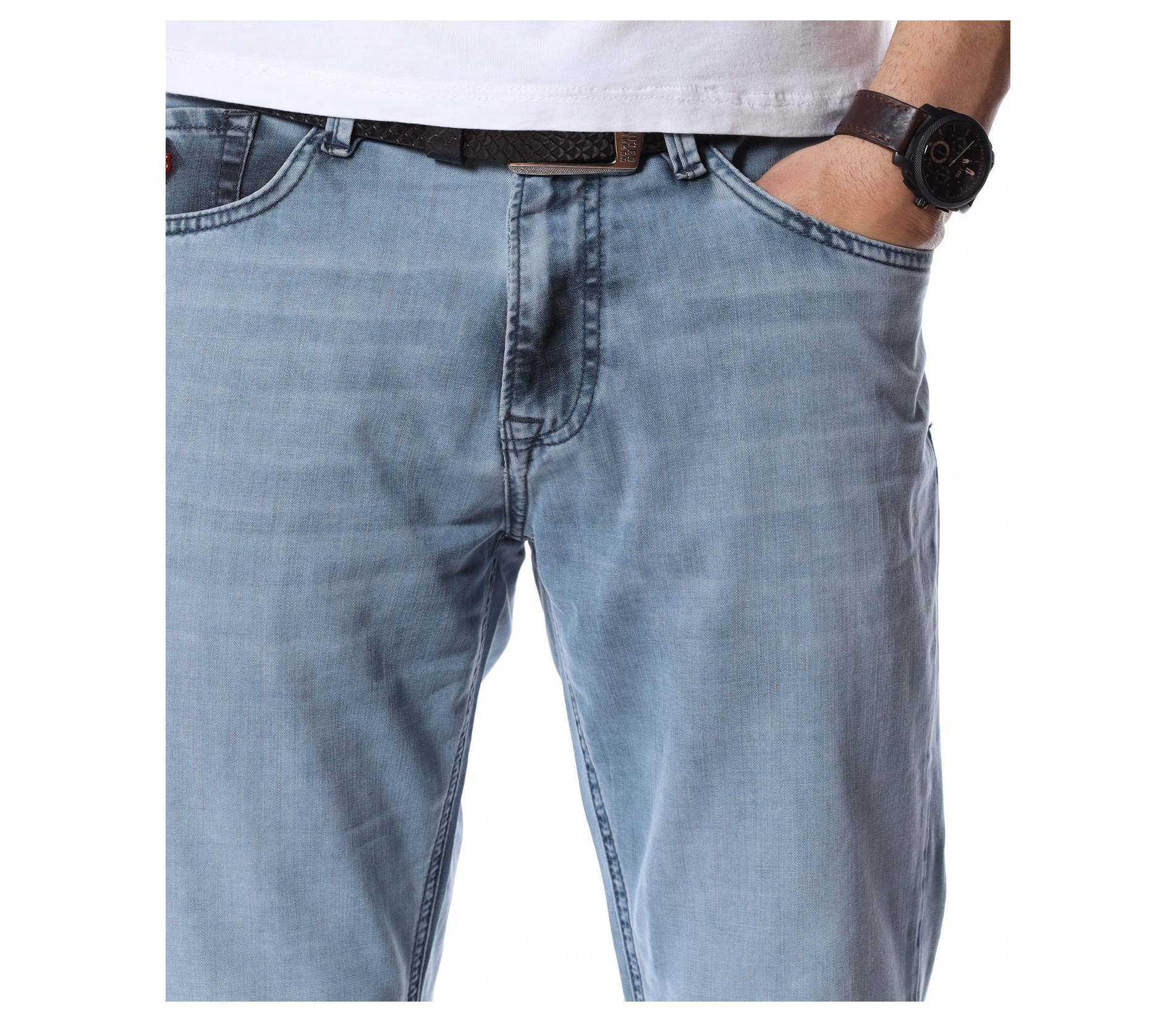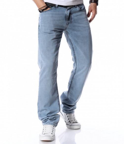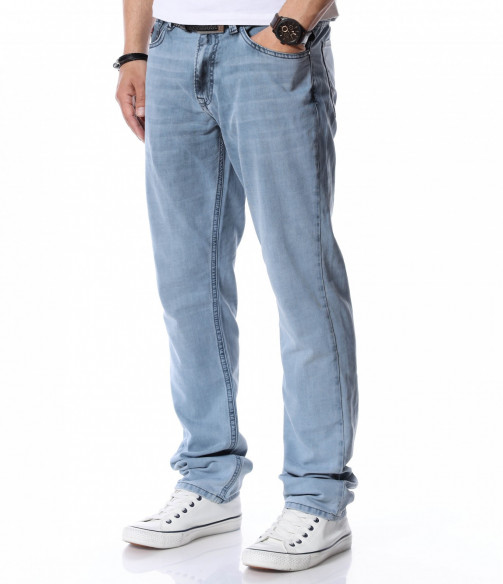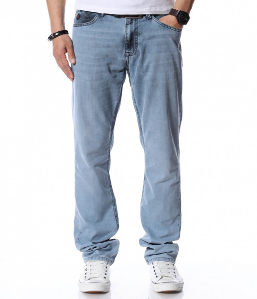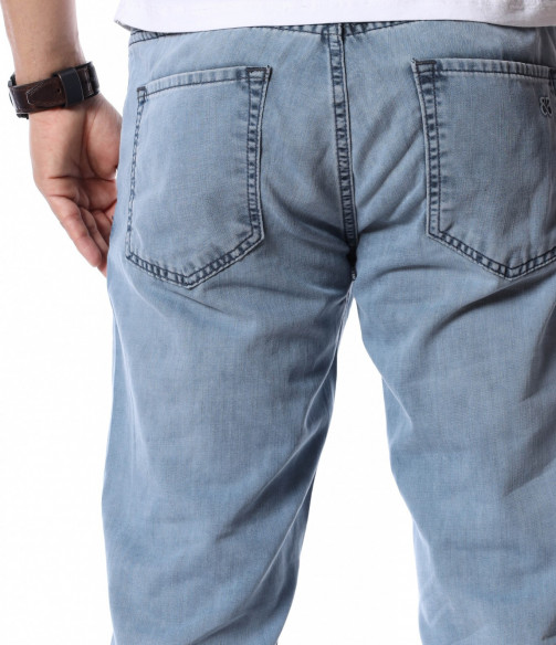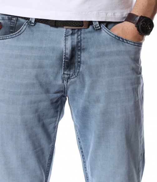 Най-предпочитани за съвременния моден стил са дънките, а сега може да се възползвате от най-новото ни предложение - Мъжки, летни дънки със свободна кройка, от тънка материя, които ще предоставят комфорт на тялото ви и лекота на движение. Моделът е изчистен от декорации, само отпред е поставена миниатюрна емблема. В предната част са разположени два, стандартни джоба и в допълнение, като декорация един малък. На талията е поставен колан, а закопчаването се състои в цип и копче. Изградете непринудена ежедневна визия като комбинирате с тениска, кецове или обувки по ваш избор.