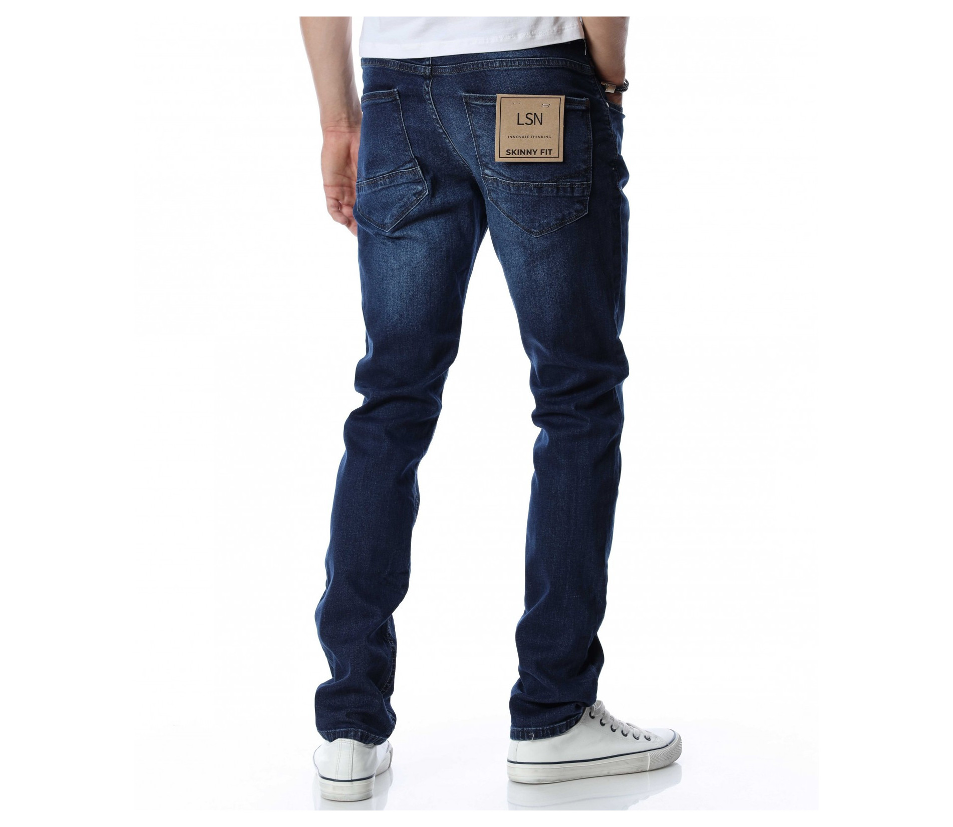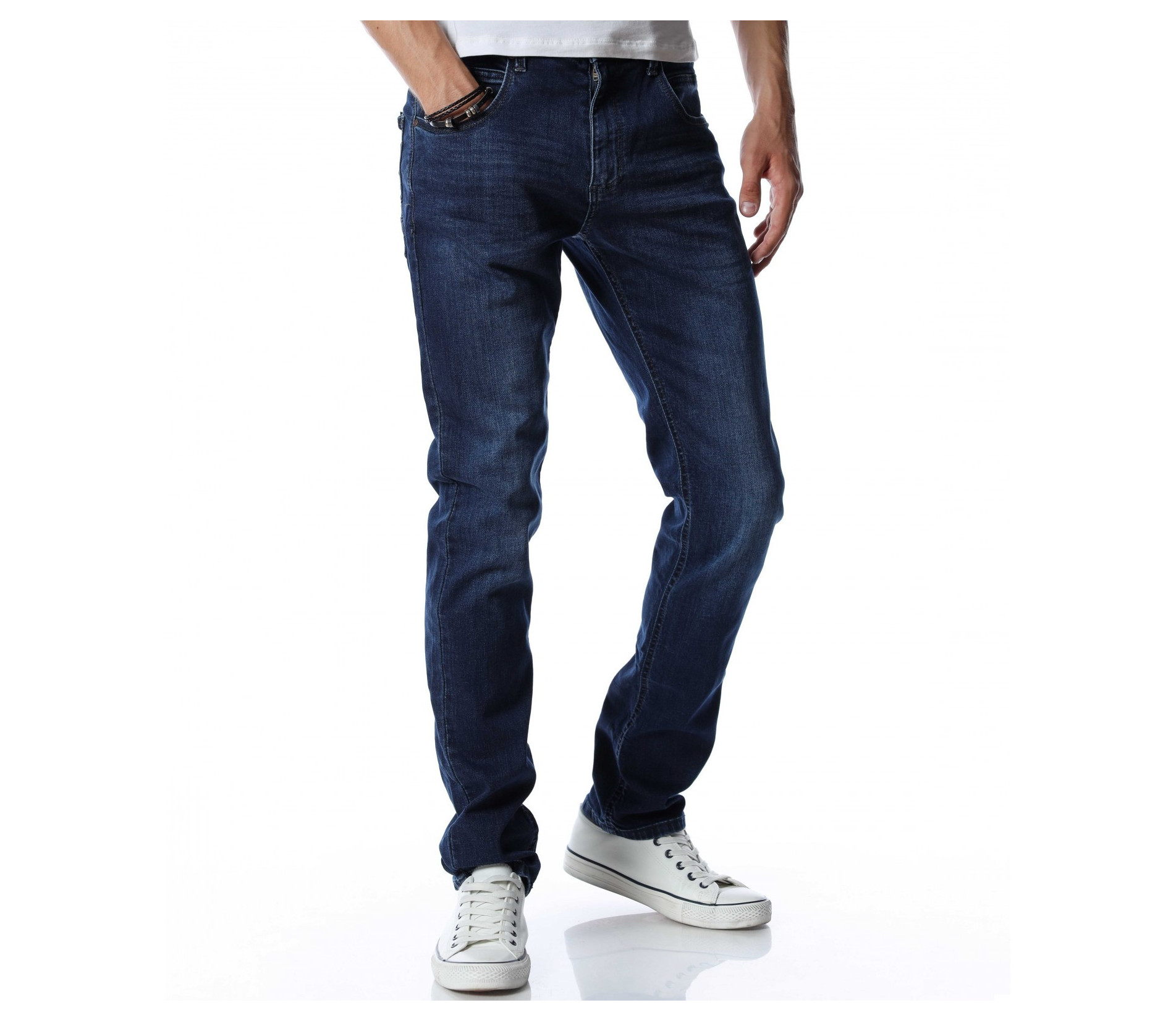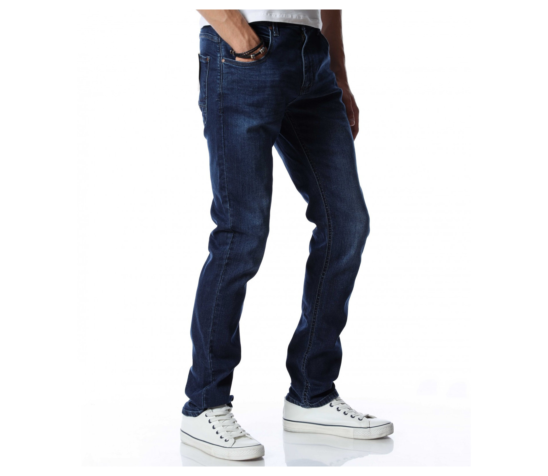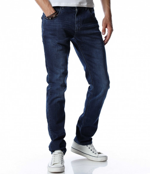 Дълъг, мъжки, класически дънков панталон. Моделът е напълно изчистен от декорации и накъсани елементи. В предната и задната част са разположени стандартни джобове, характерни за всеки модел. Кройката е удобна, подчертаваща фигурата. Изработен от памук и еластант за максимален комфорт на тялото. Комбинирайте с тениска, блуза, кецове, маратонки и любим аксесоар.