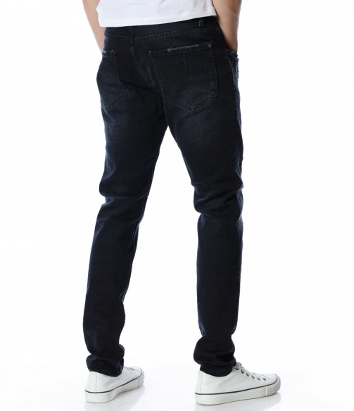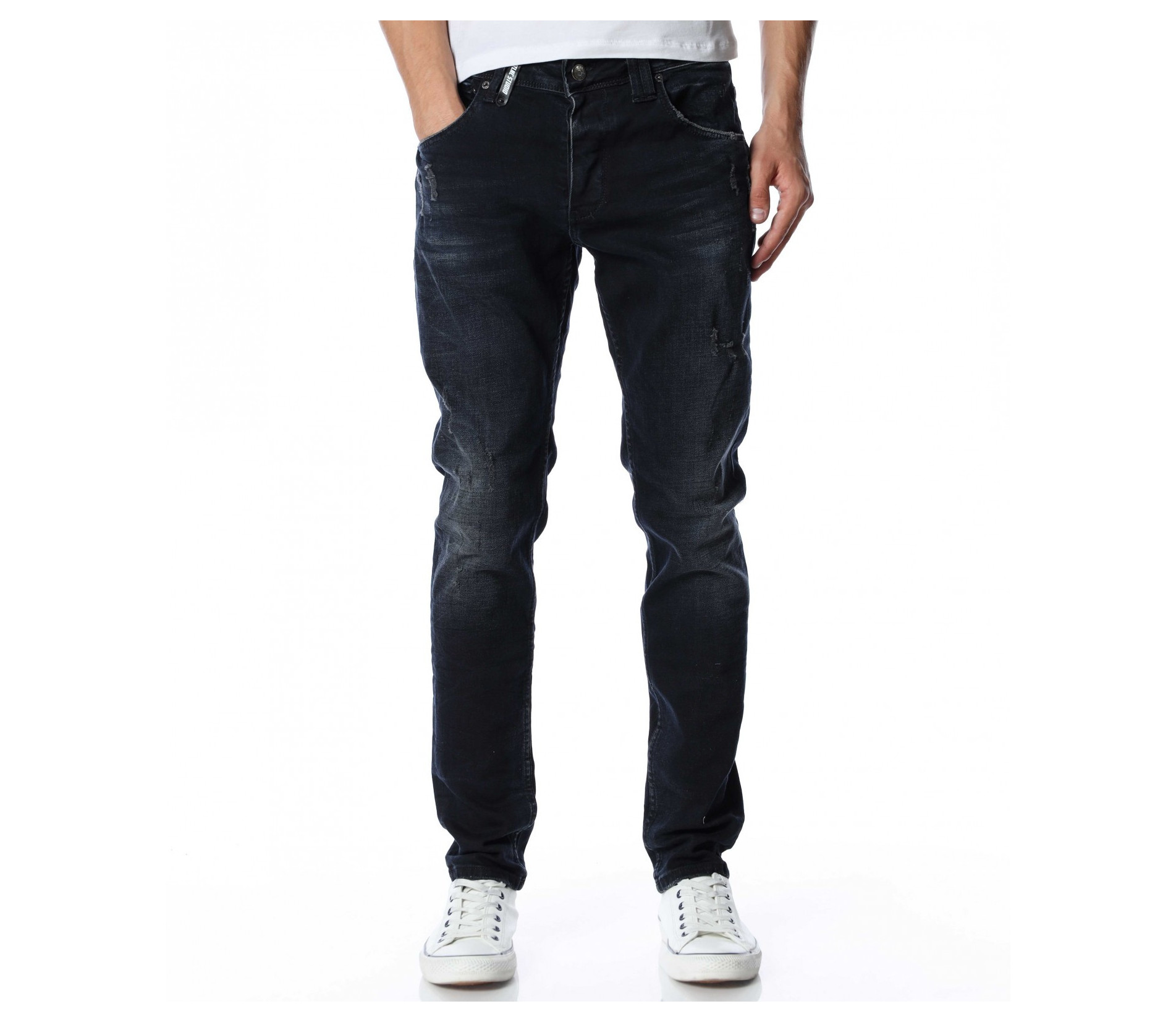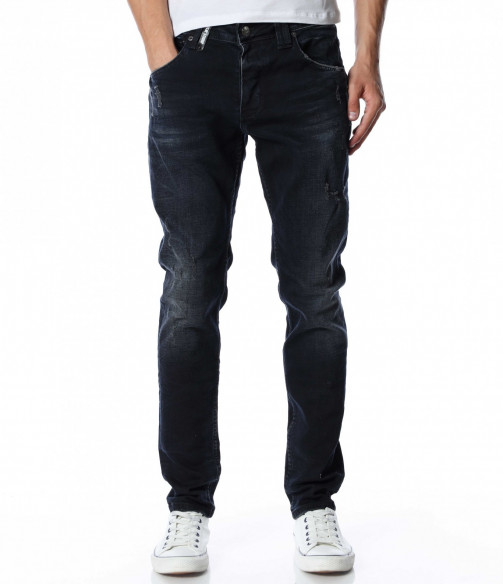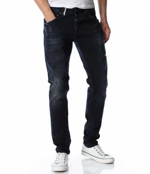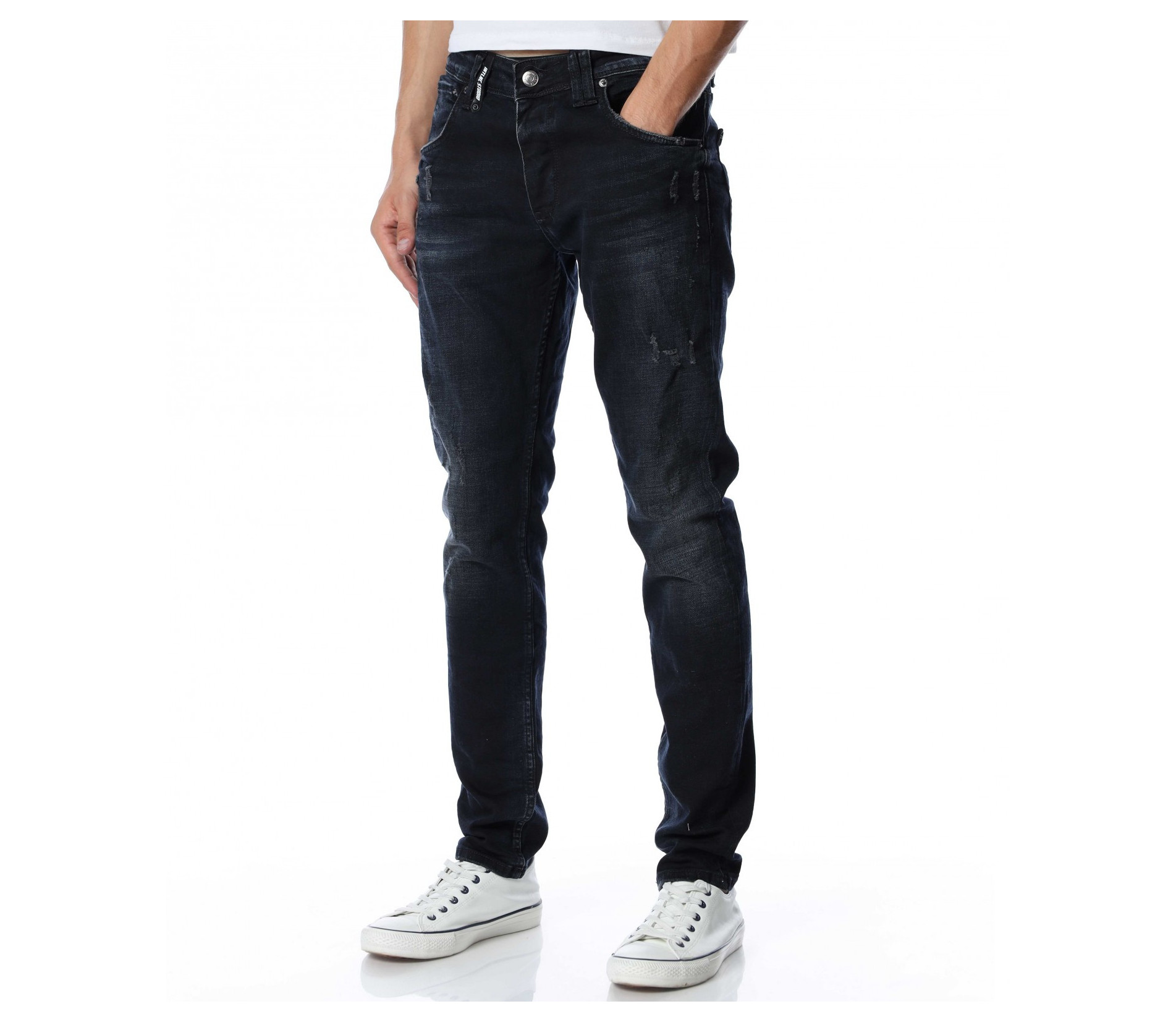 Мъжки тъмносин дънков панталон. Моделът е в изчистен вариант, само на места забелязваме небрежно надрани елементи. На талията са поставени гайки за колан, а закопчаването е с копчета. Кройката е удобна и с достатъчна собода на движение. Комбинирайте с блуза или тениска.