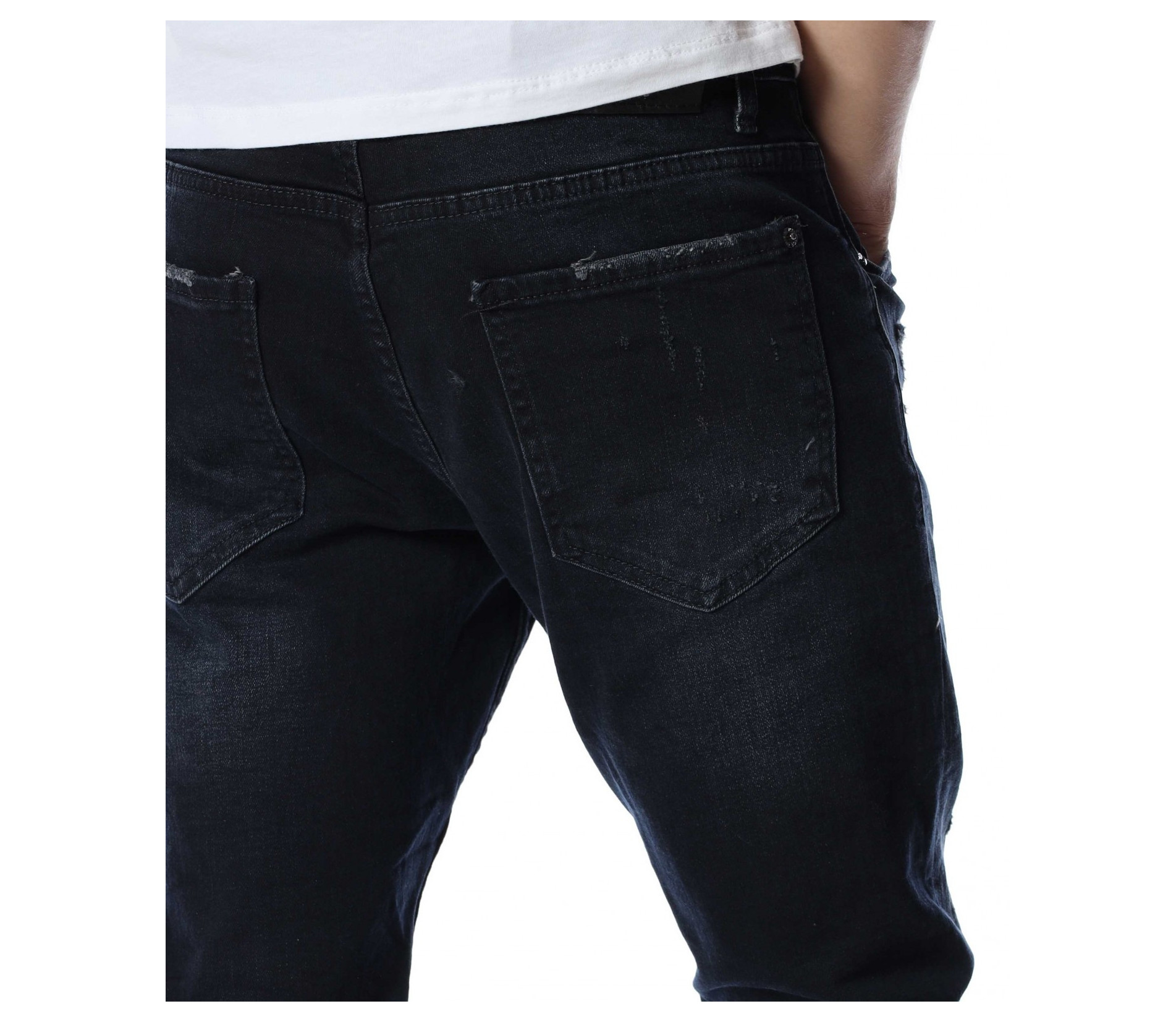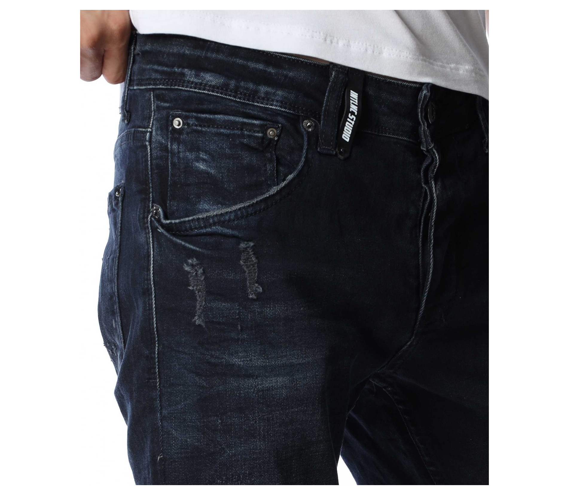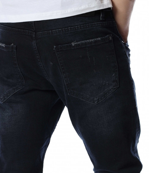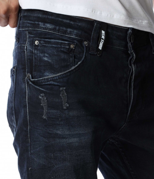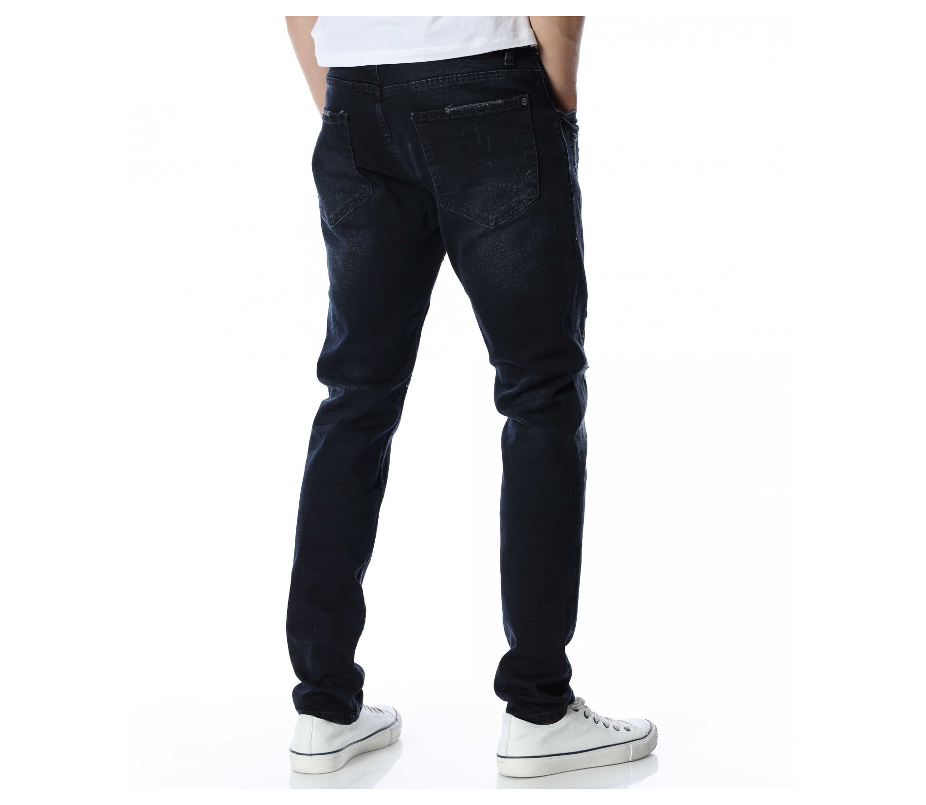Мъжки тъмносин дънков панталон. Моделът е в изчистен вариант, само на места забелязваме небрежно надрани елементи. На талията са поставени гайки за колан, а закопчаването е с копчета. Кройката е удобна и с достатъчна собода на движение. Комбинирайте с блуза или тениска.