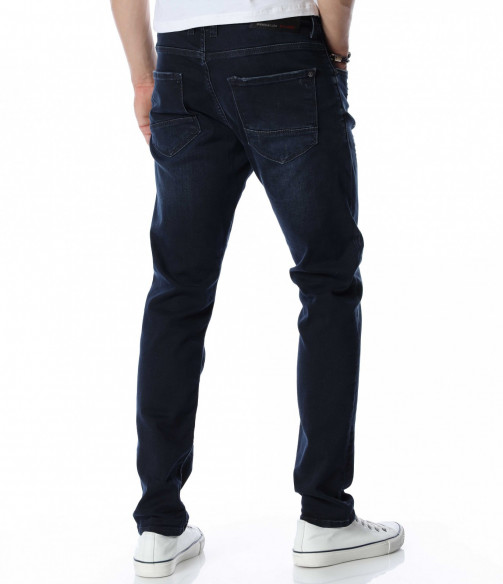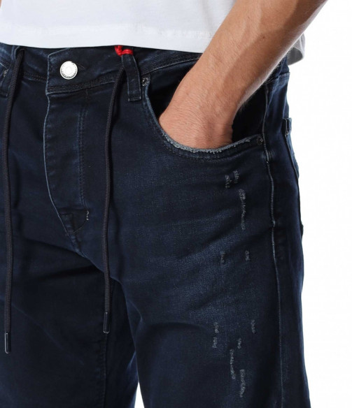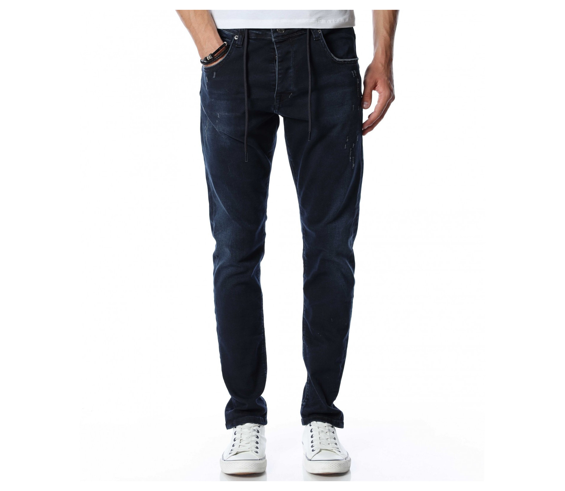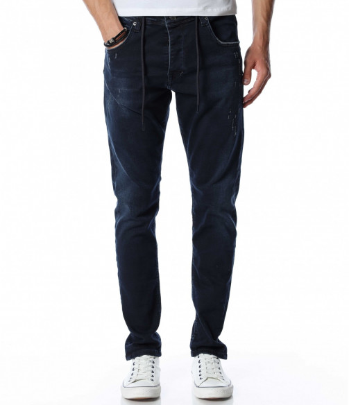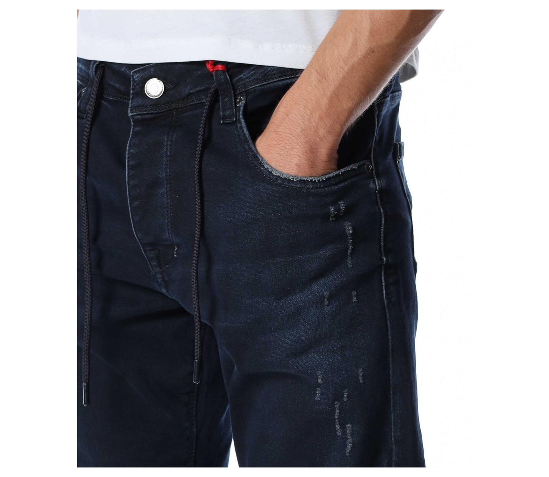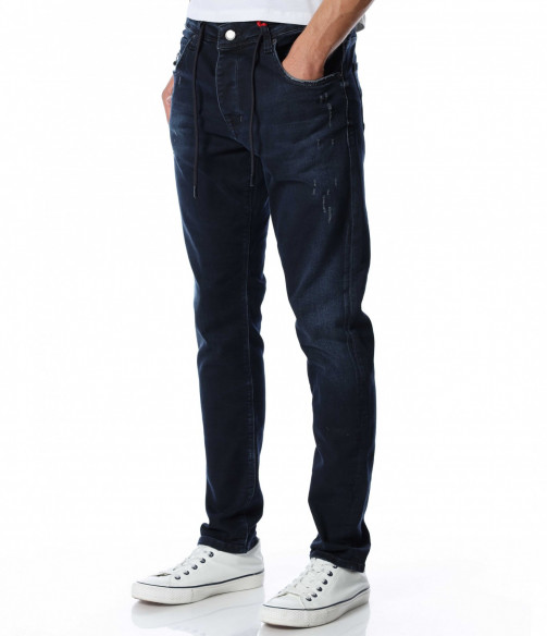 Мъжки, тъмносини дънки. Моделът е изчистен от натрапчиви декорации, само в предната част разполага с небрежно и ситно накъсани елементи. На талията са поставени връзки за регулиране на ширината. Джобовете са стандартни. Кройката следва линиите на тялото. Изработен от памучна материя и ликра. Подходящ за ежедневието и може да комбинирате с тениска, кецове и любим аксесоар.