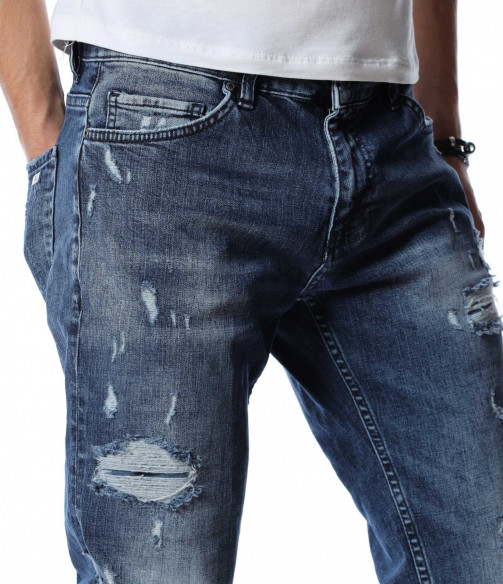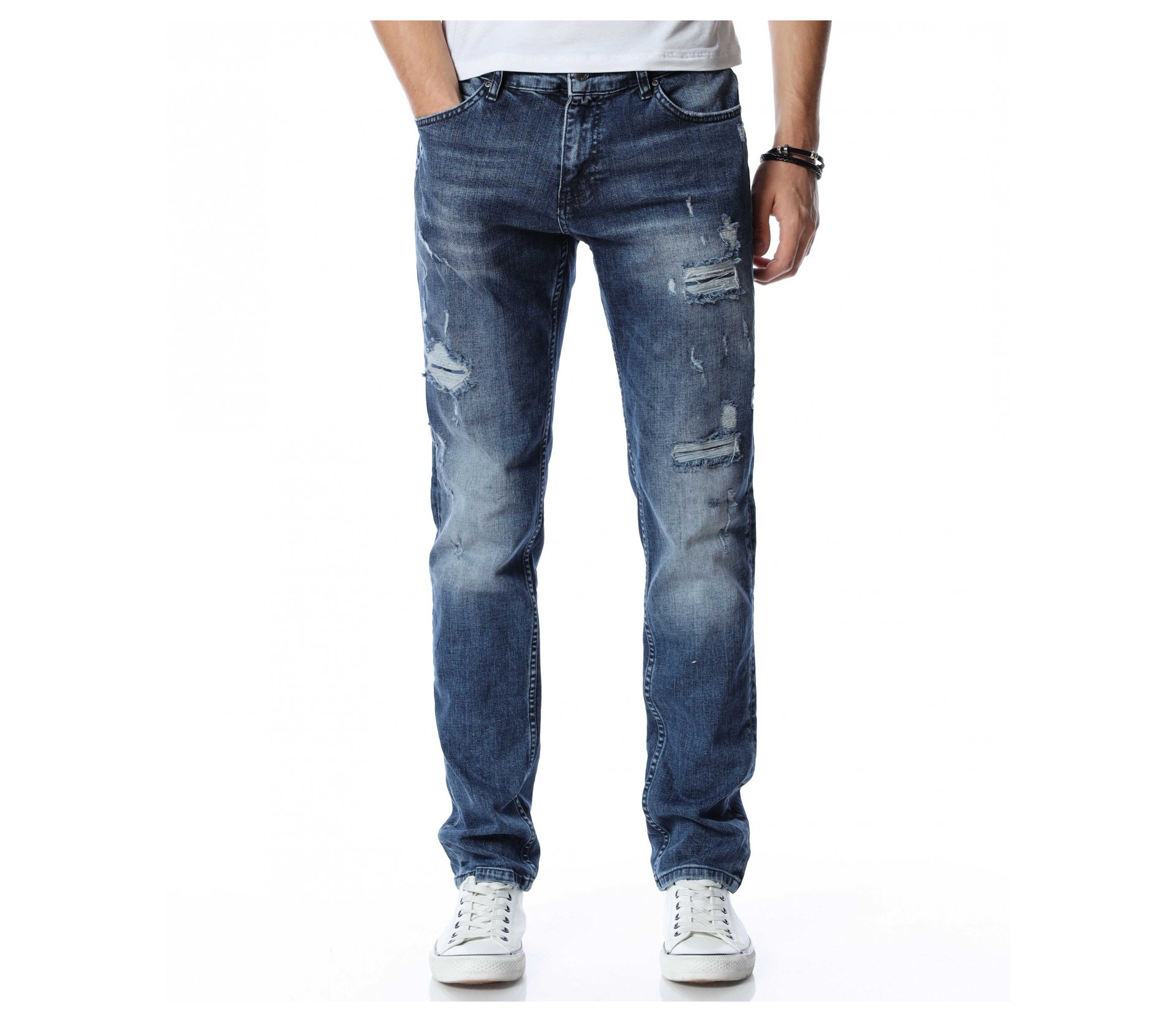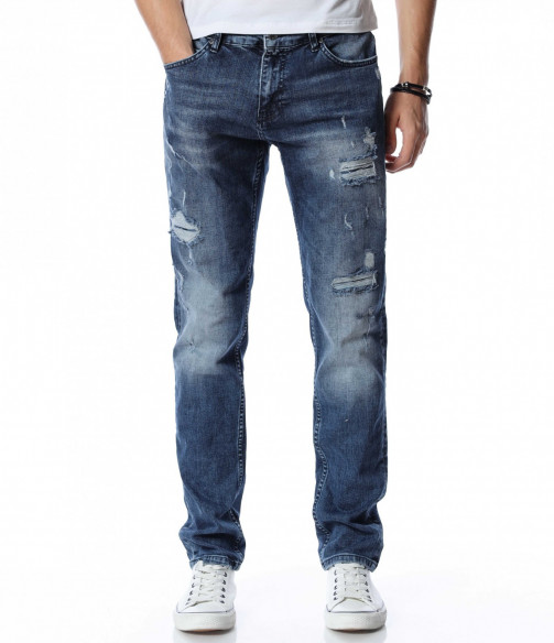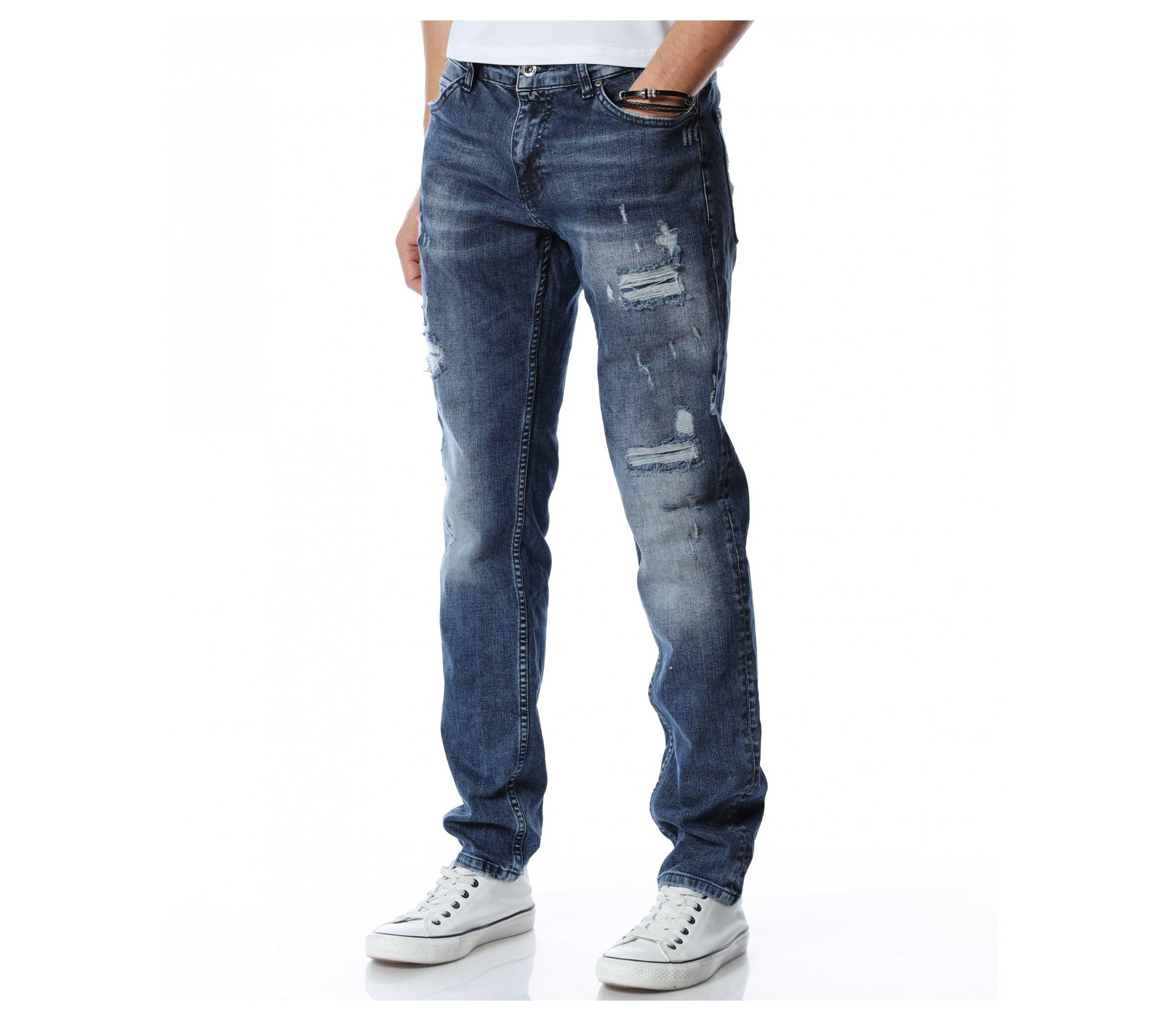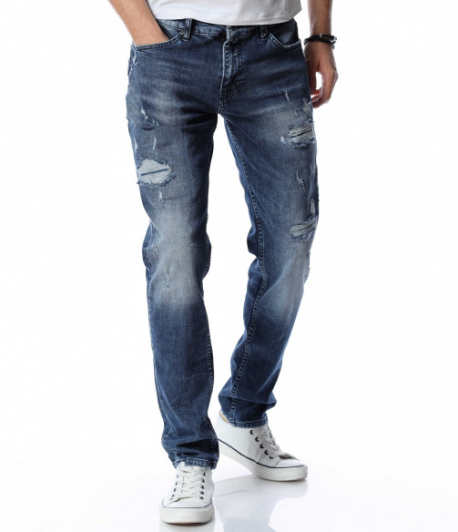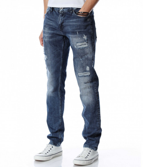 Мъжки, дълъг, син дънков панталон с кройка във вариант regular fit, който същевременно осигурява достатъчна свобода на движение. Моделът акцентира с контрастни, изсветлени елементи и големи кръпки с бели нишки в допълнение с надрани мотиви. Забелязваме стандартните, отворени джобове, както в предната, така и в задната част. Закопчаването се състои в цип и копче, а на талията са разположени гайки, към които може да добавите колан. Комбинирайте с блуза и кецове.