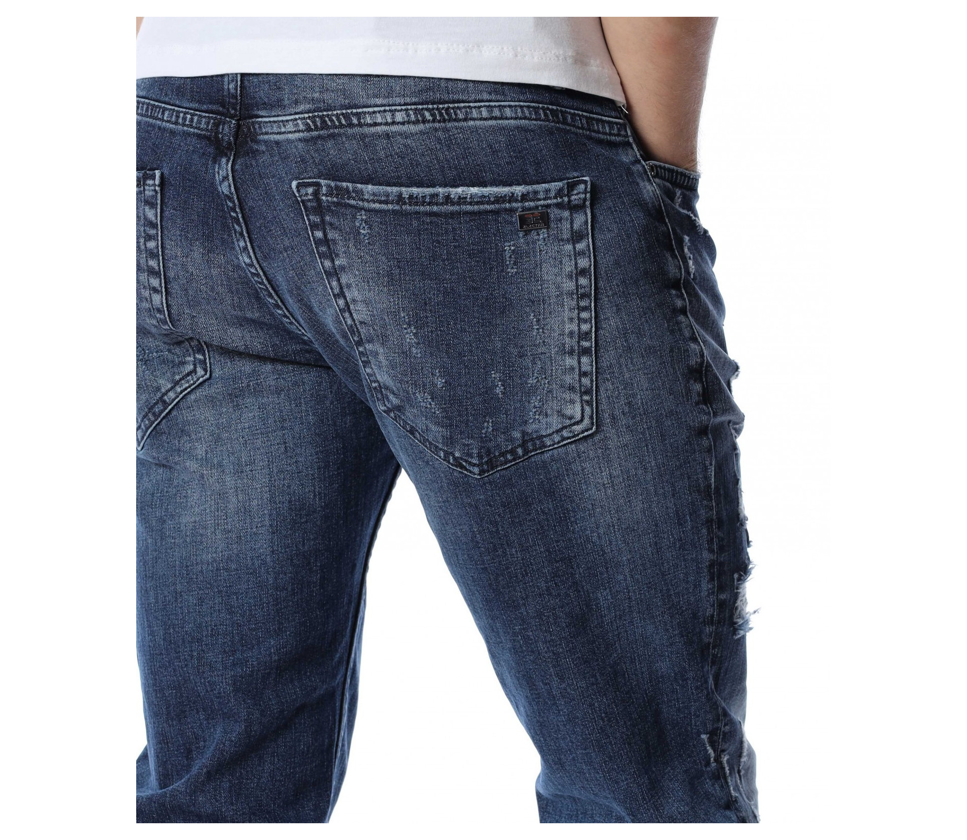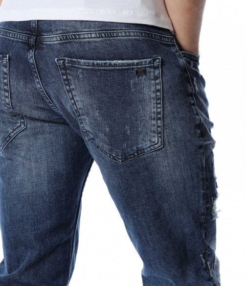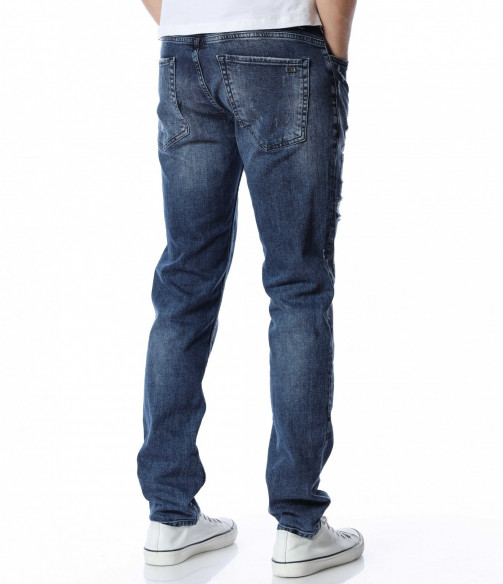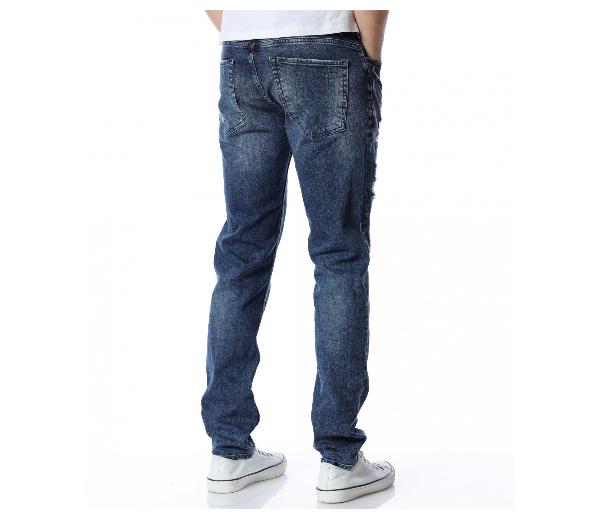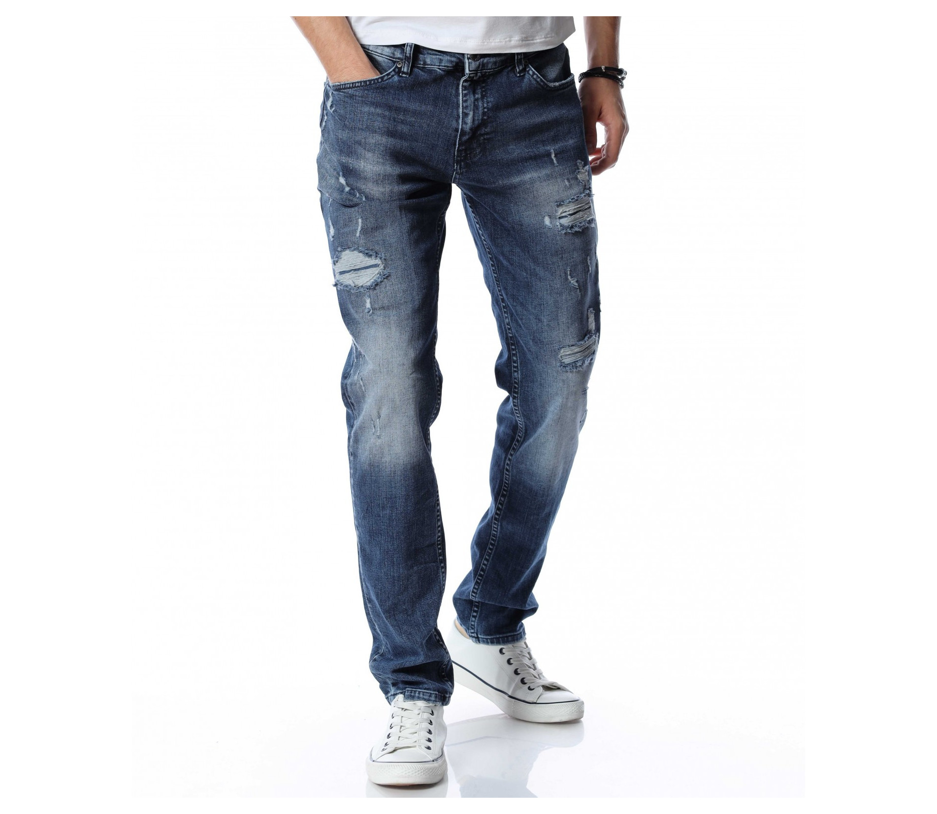 Мъжки, дълъг, син дънков панталон с кройка във вариант regular fit, който същевременно осигурява достатъчна свобода на движение. Моделът акцентира с контрастни, изсветлени елементи и големи кръпки с бели нишки в допълнение с надрани мотиви. Забелязваме стандартните, отворени джобове, както в предната, така и в задната част. Закопчаването се състои в цип и копче, а на талията са разположени гайки, към които може да добавите колан. Комбинирайте с блуза и кецове.