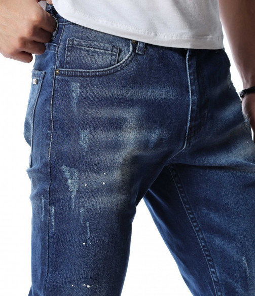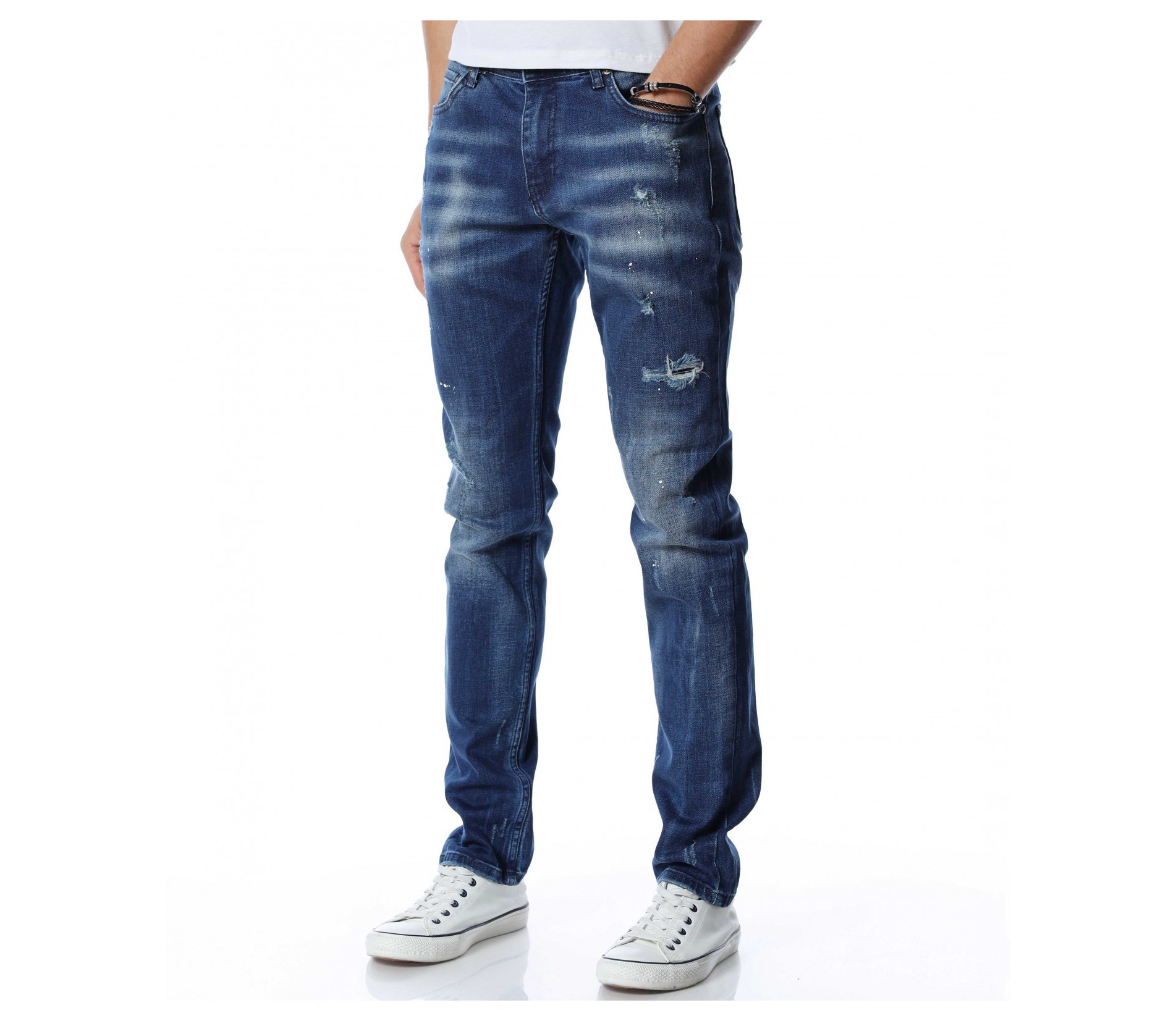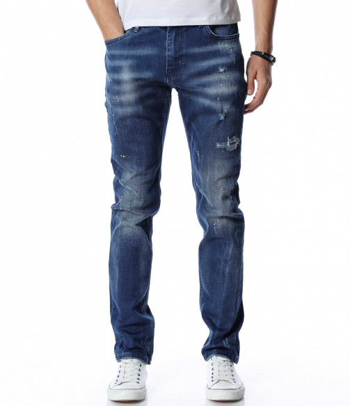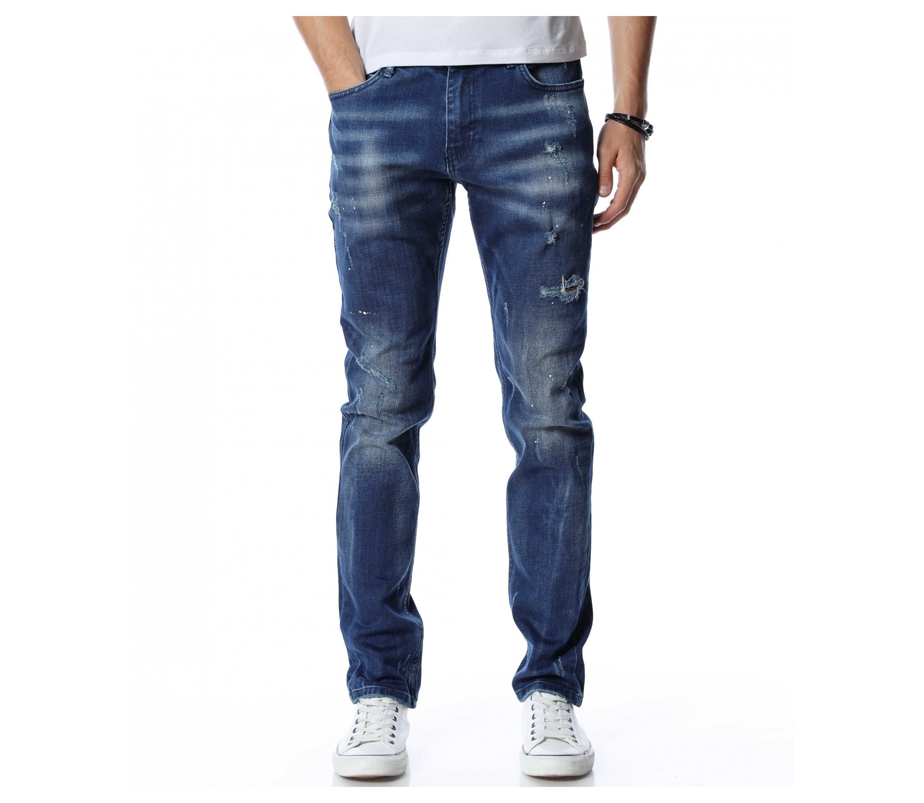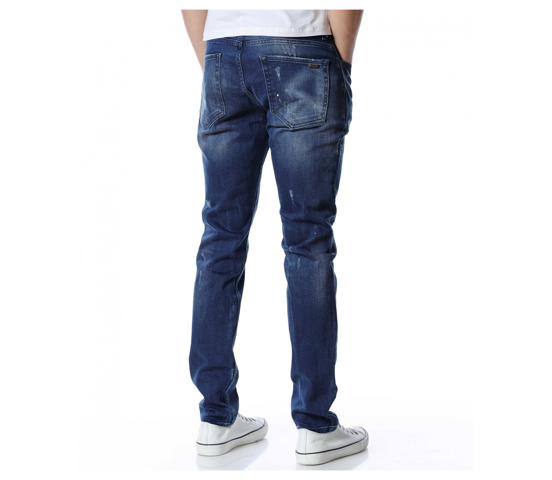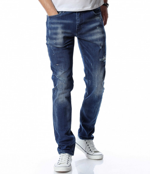 Мъжки, дълъг, син дънков панталон с кройка във вариант slim fit, който следва линиите на тялото и същевременно осигурява достатъчна свобода на движение. Закопчаването се състои в цип и копче, а на талията са разположени гайки, към които може да добавите колан. Моделът акцентира с контрастни, изсветлени елементи и леко надрани и протрити на места детайли с бели нишки. Забелязваме стандартните, отворени джобове, както в предната, така и в задната част.  Комбинирайте с блуза и кецове.