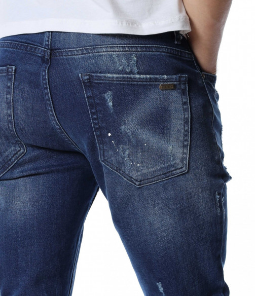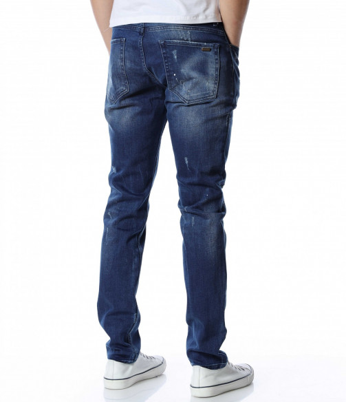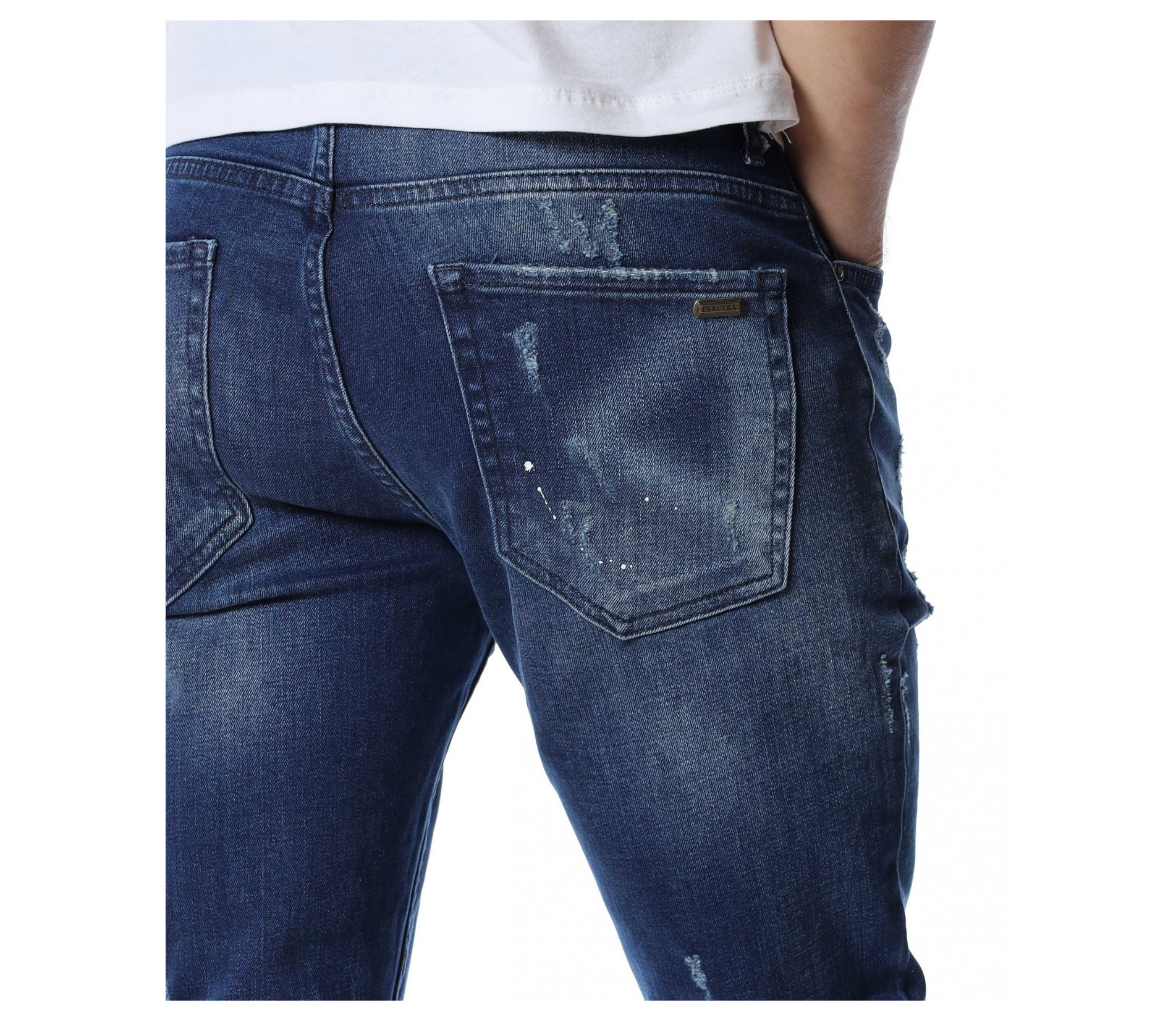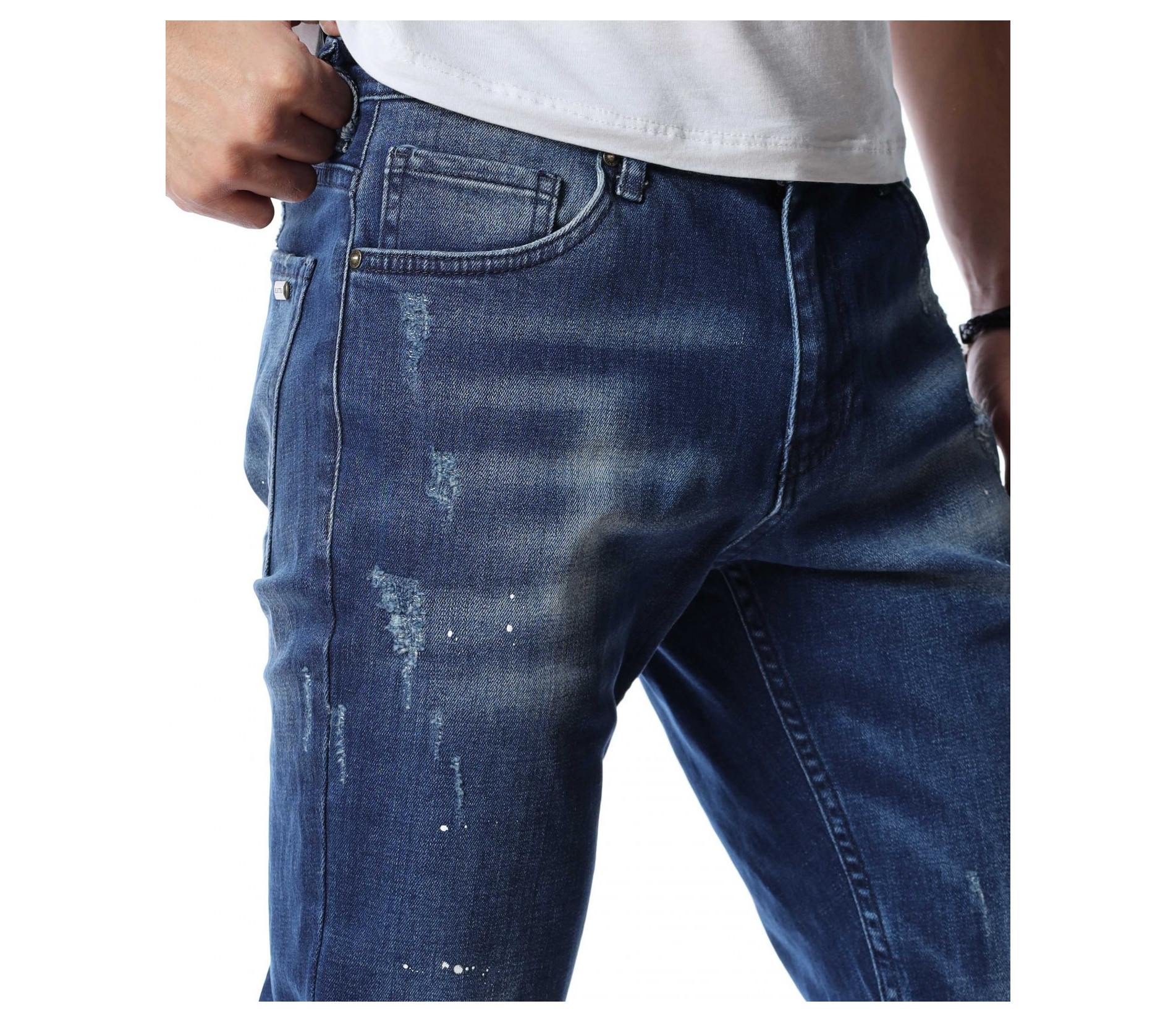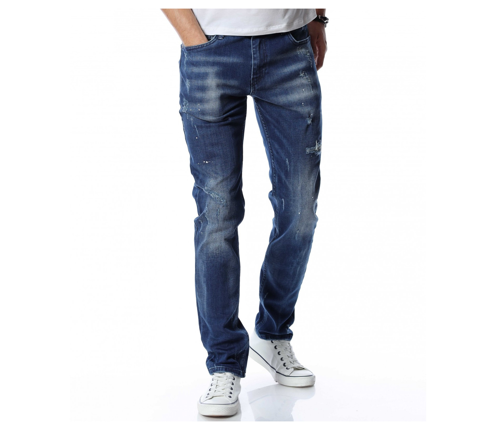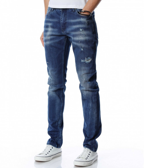 Мъжки, дълъг, син дънков панталон с кройка във вариант slim fit, който следва линиите на тялото и същевременно осигурява достатъчна свобода на движение. Закопчаването се състои в цип и копче, а на талията са разположени гайки, към които може да добавите колан. Моделът акцентира с контрастни, изсветлени елементи и леко надрани и протрити на места детайли с бели нишки. Забелязваме стандартните, отворени джобове, както в предната, така и в задната част.  Комбинирайте с блуза и кецове.