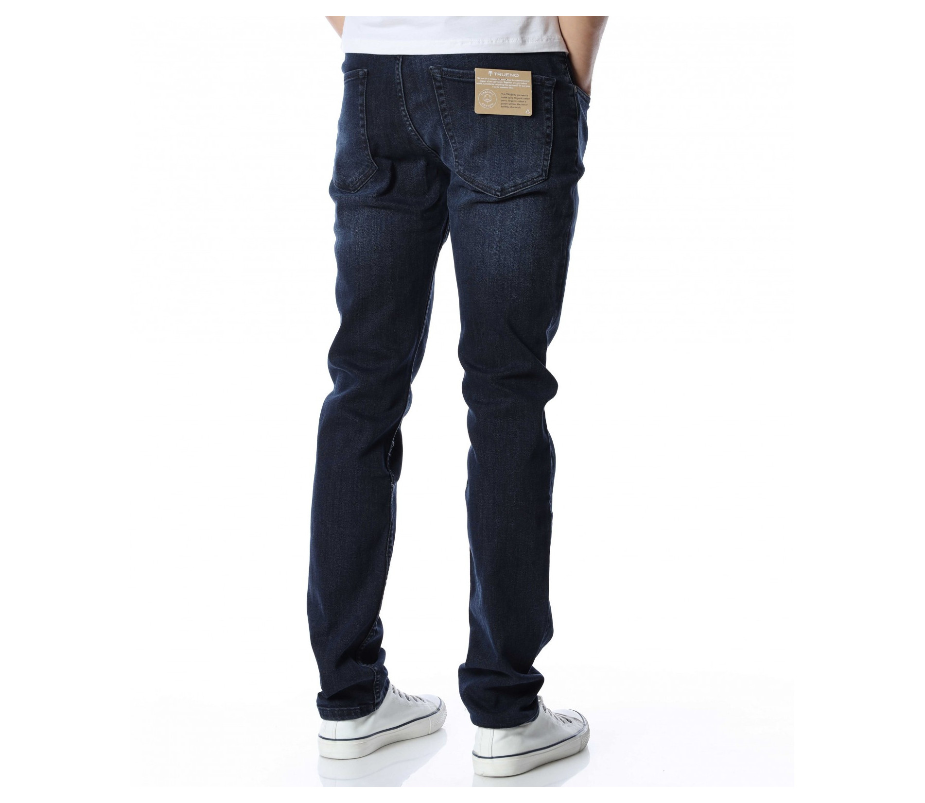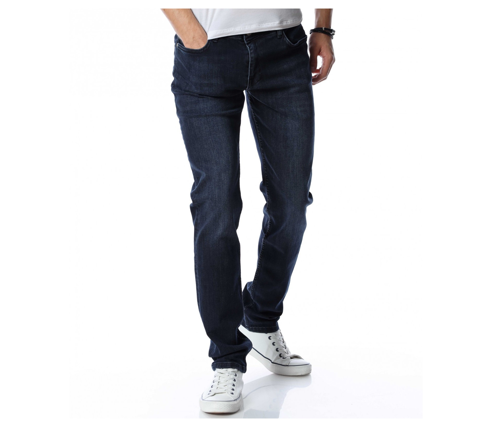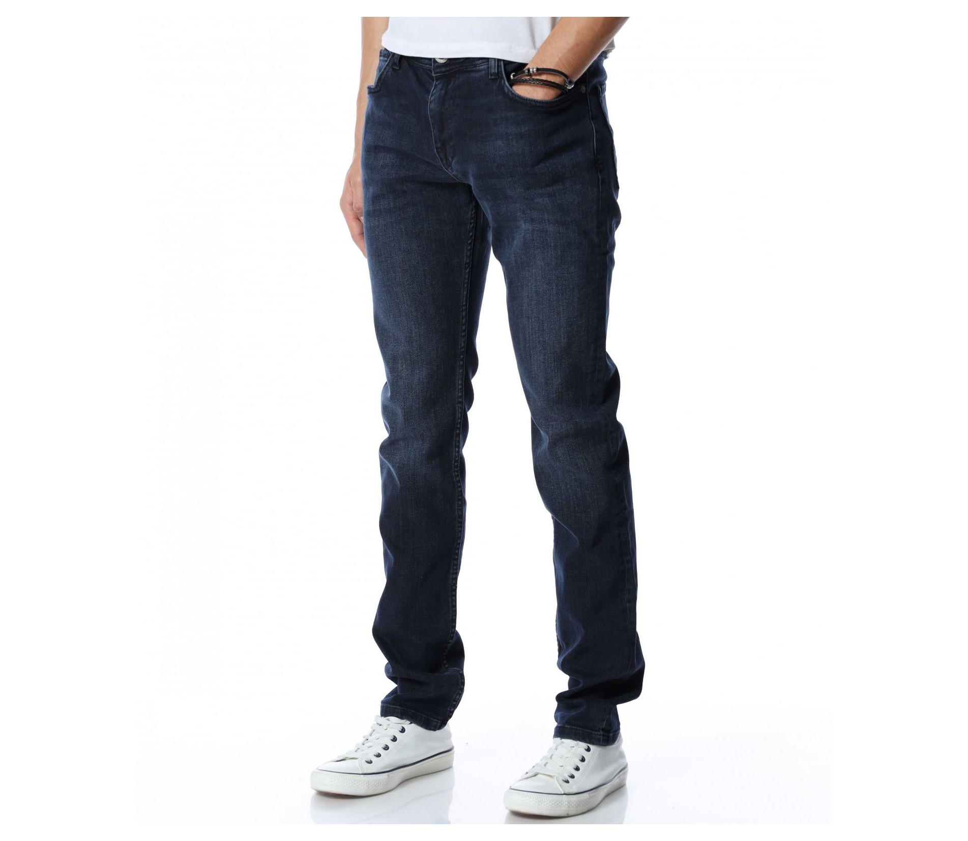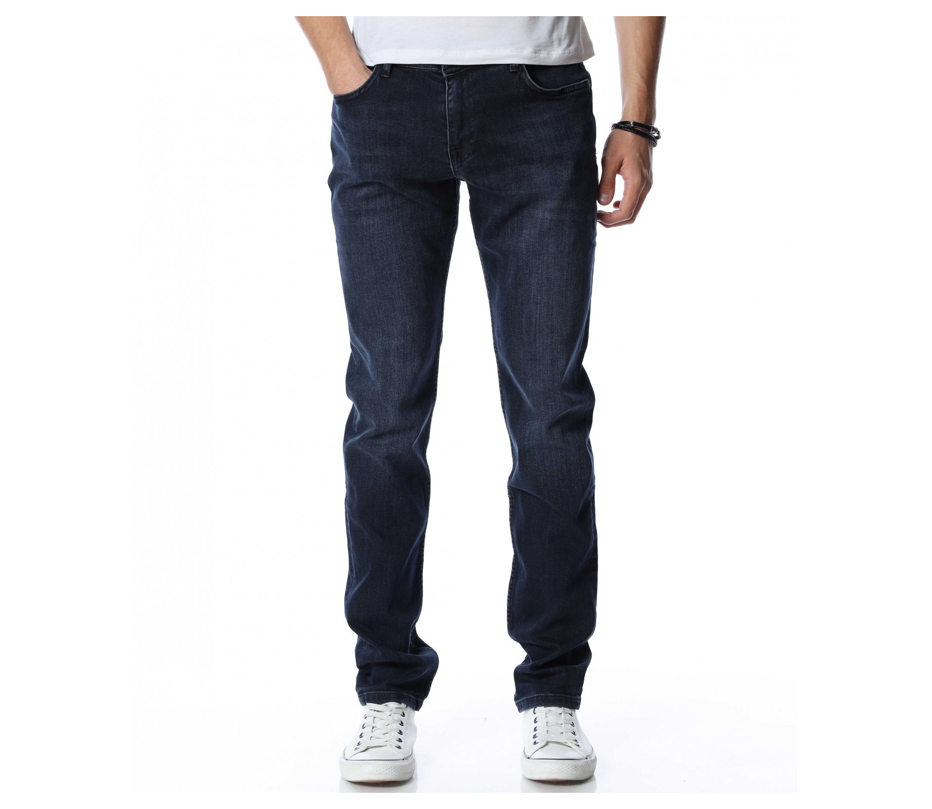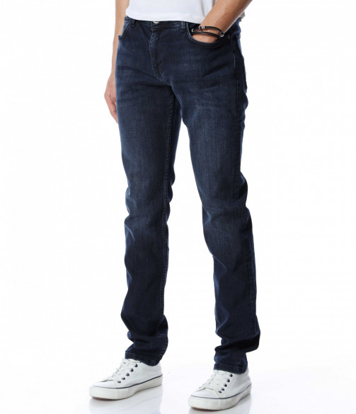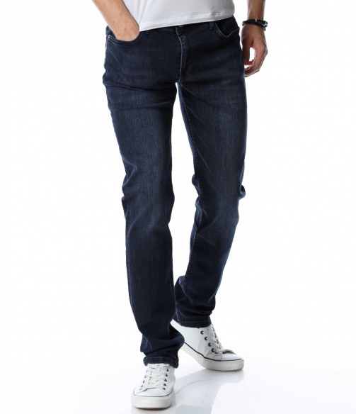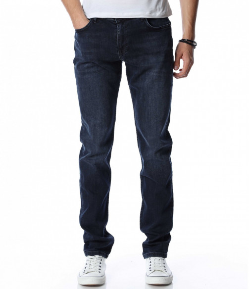 Мъжки, дълъг, тъмносин дънков панталон с кройка във вариант regular fit, който осигурява достатъчна свобода на движение и комфорт на тялото. Моделът е в класически и напълно изчистен вариант, без декорации и елементи. Забелязваме стандартните, отворени джобове, както в предната, така и в задната част. Закопчаването се състои в цип и копче, а на талията са разположени гайки, към които може да добавите колан. Комбинирайте с блуза и кецове.