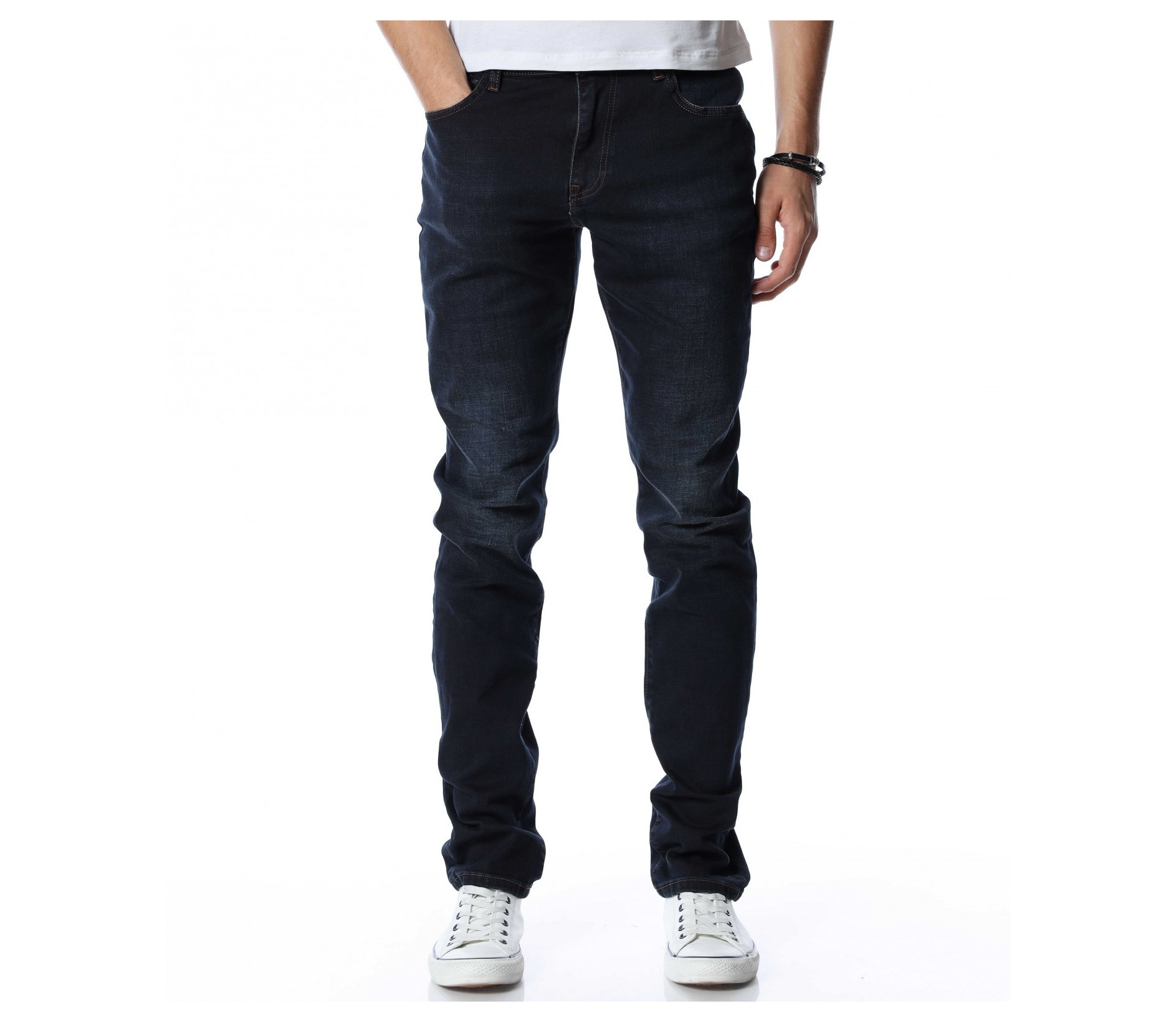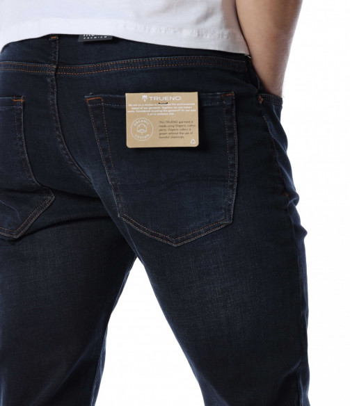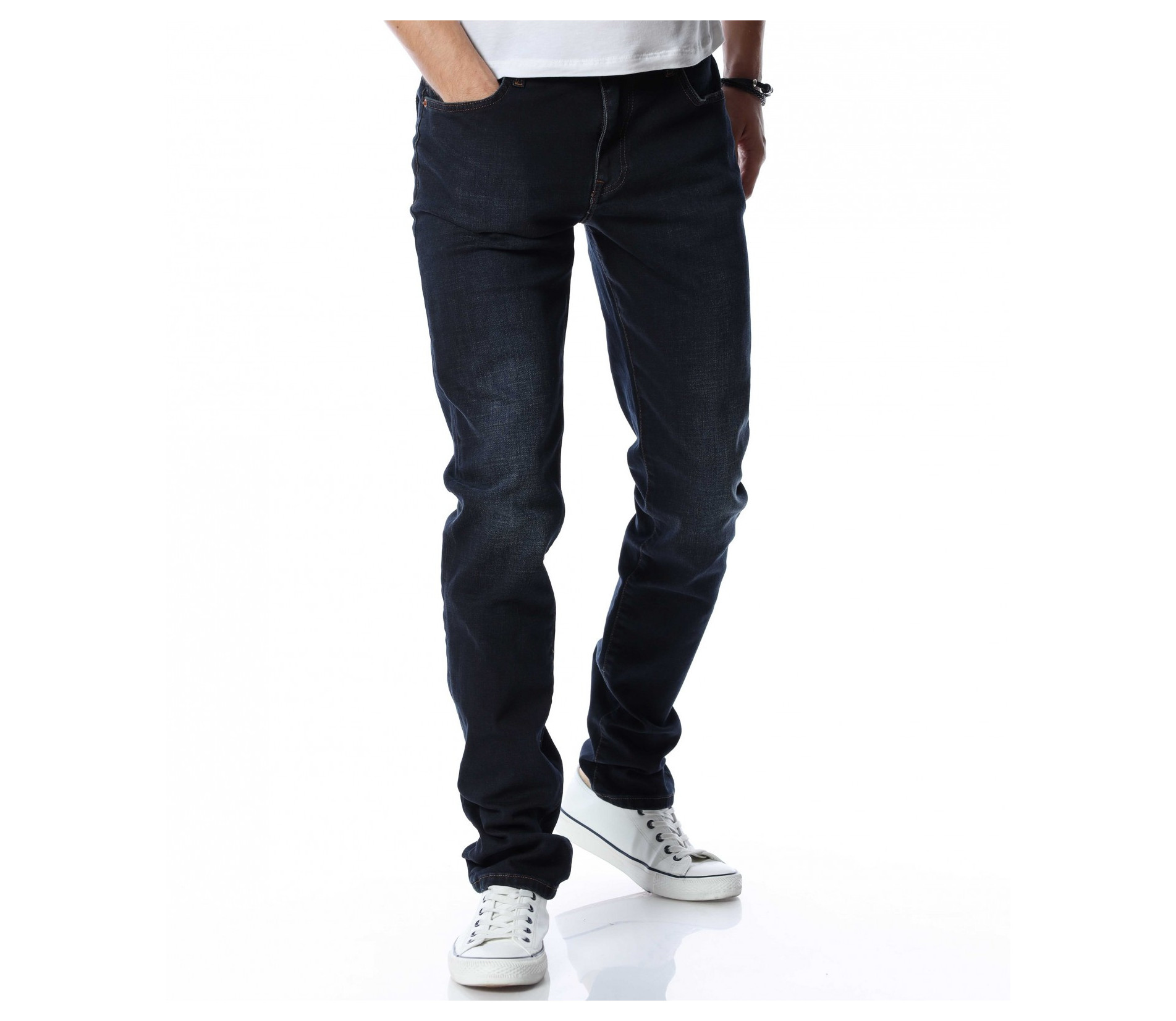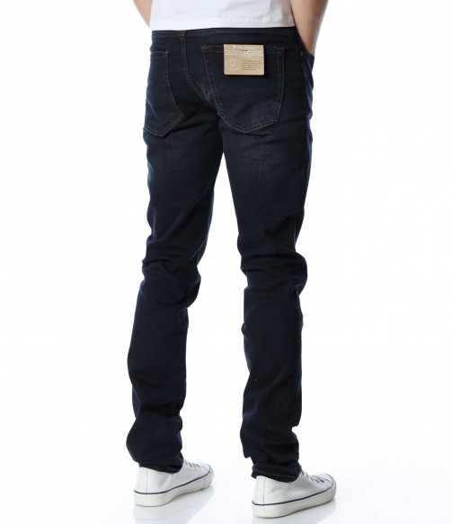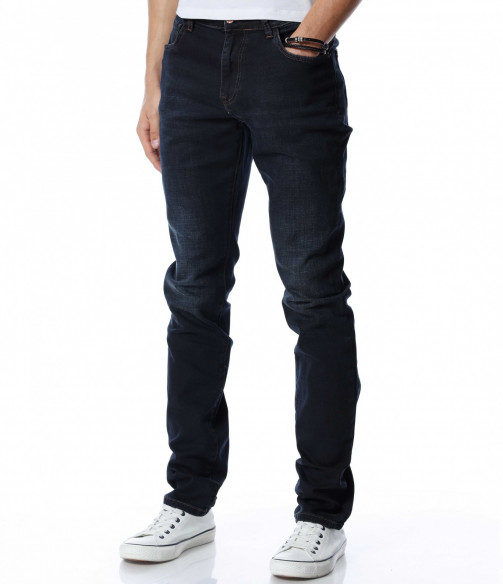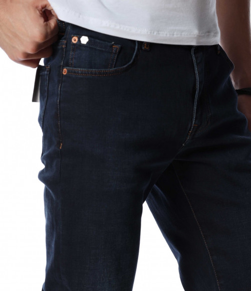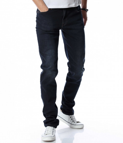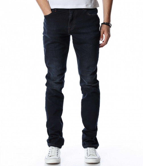 Мъжки, дълъг, черен дънков панталон с кройка във вариант classic fit, който следва линиите на тялото и същевременно осигурява достатъчна свобода на движение. Моделът е в напълно изчистен вариант, без декорации и допълнителни елементи. Забелязваме стандартните, отворени джобове, както в предната, така и в задната част. Закопчаването се състои в цип и копче, а на талията са разположени гайки, към които може да добавите колан. Комбинирайте с блуза и кецове.