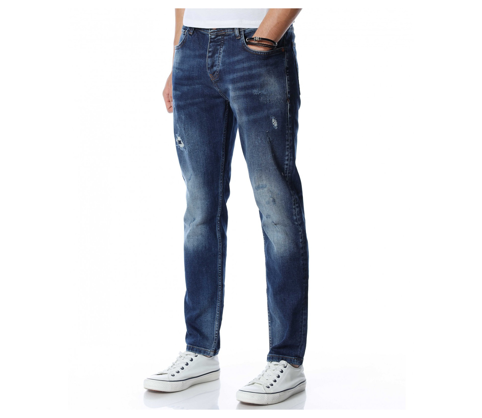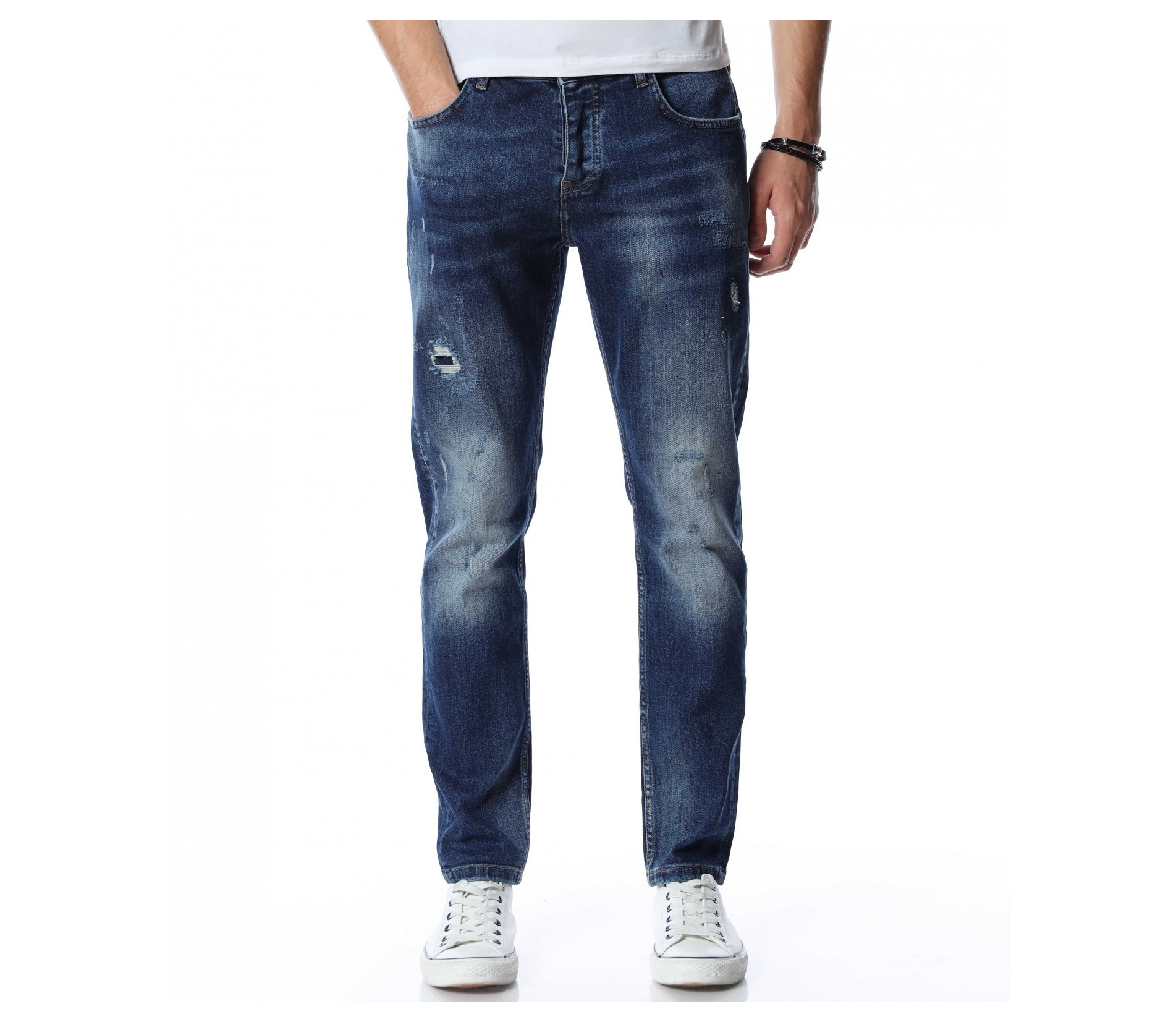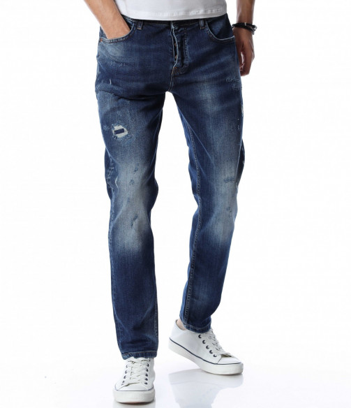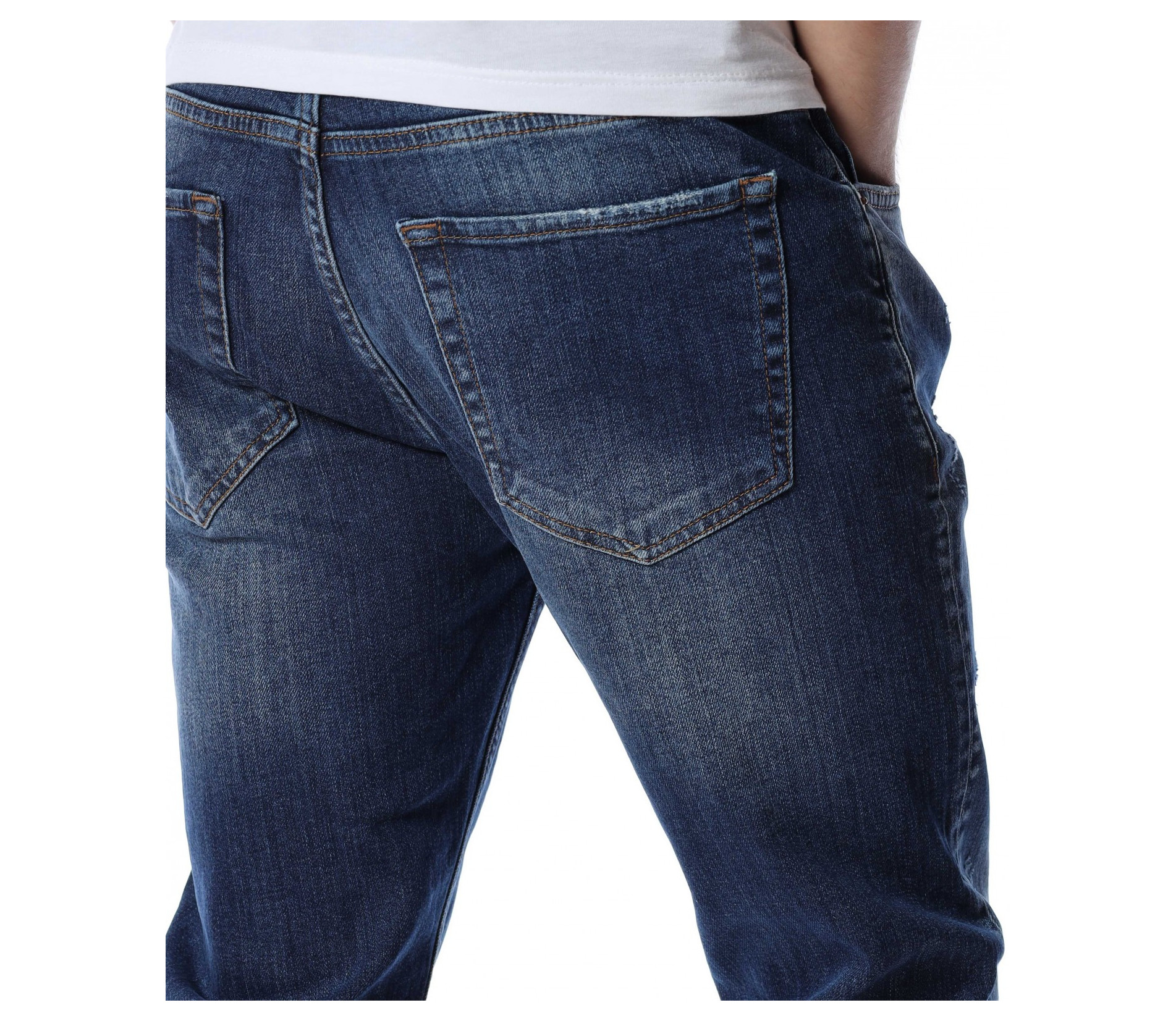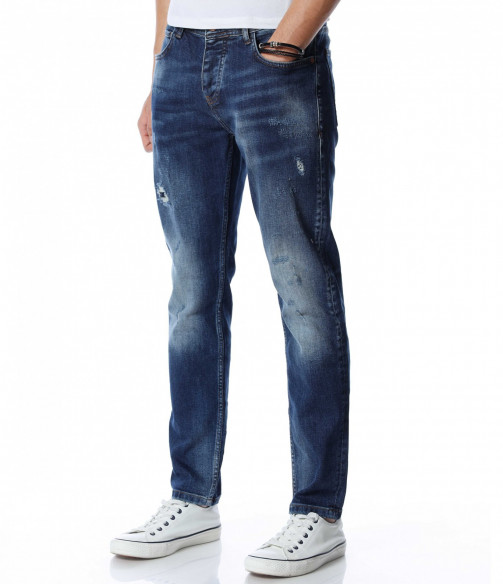 Мъжки, дълъг, син дънков панталон с кройка във вариант regularfit, който следва линиите на тялото. Моделът акцентира с контрастни, изсветлени елементи и леко надрани и протрити на места детайли. Забелязваме стандартните, отворени джобове, както в предната, така и в задната част. Закопчаването се състои в цип и копче, а на талията са разположени гайки, към които може да добавите колан. Комбинирайте с блуза и кецове.