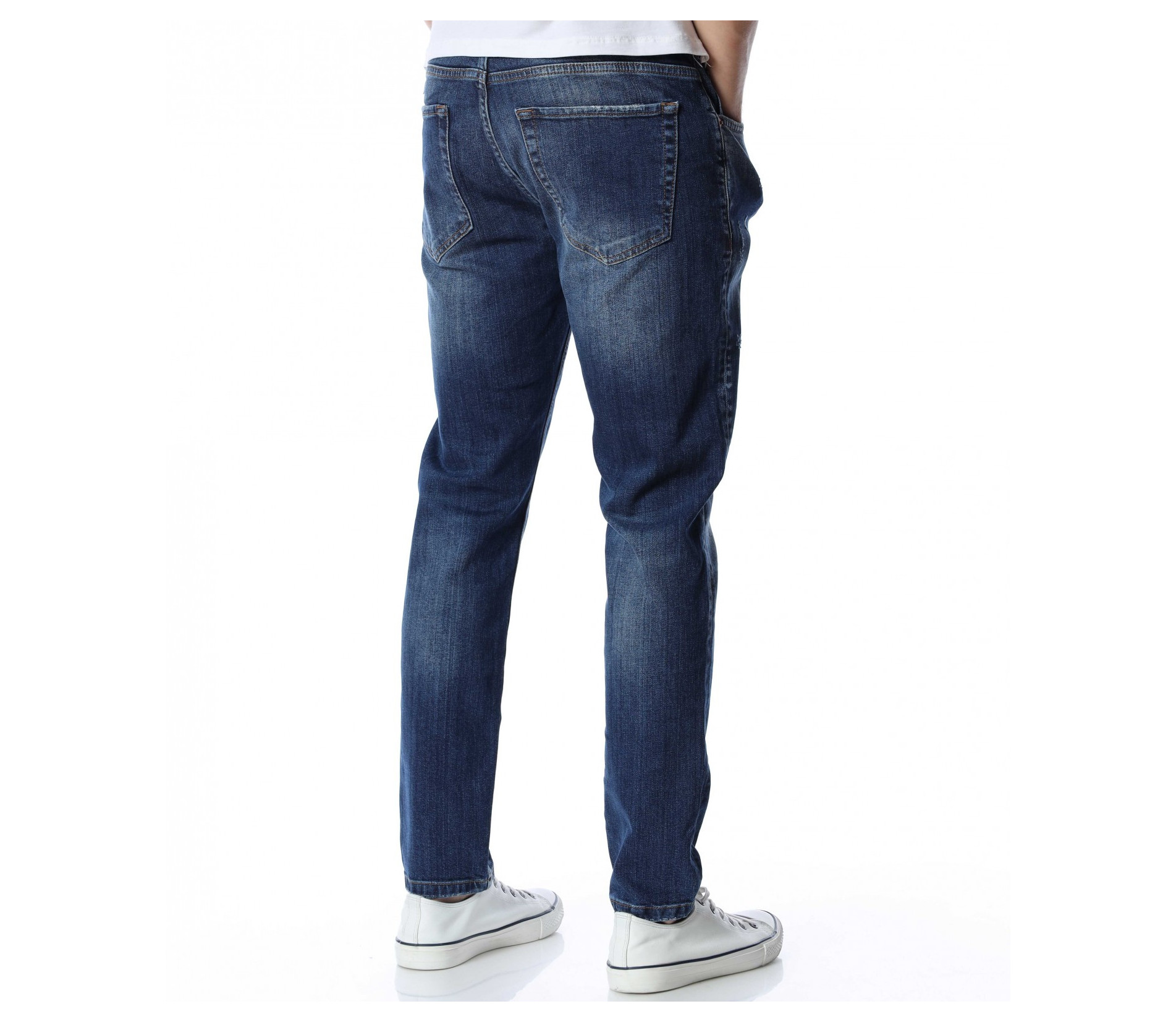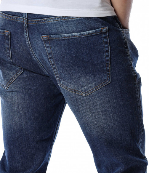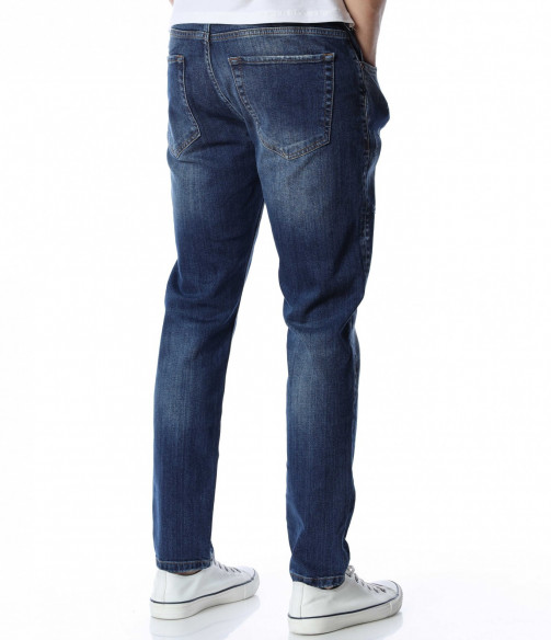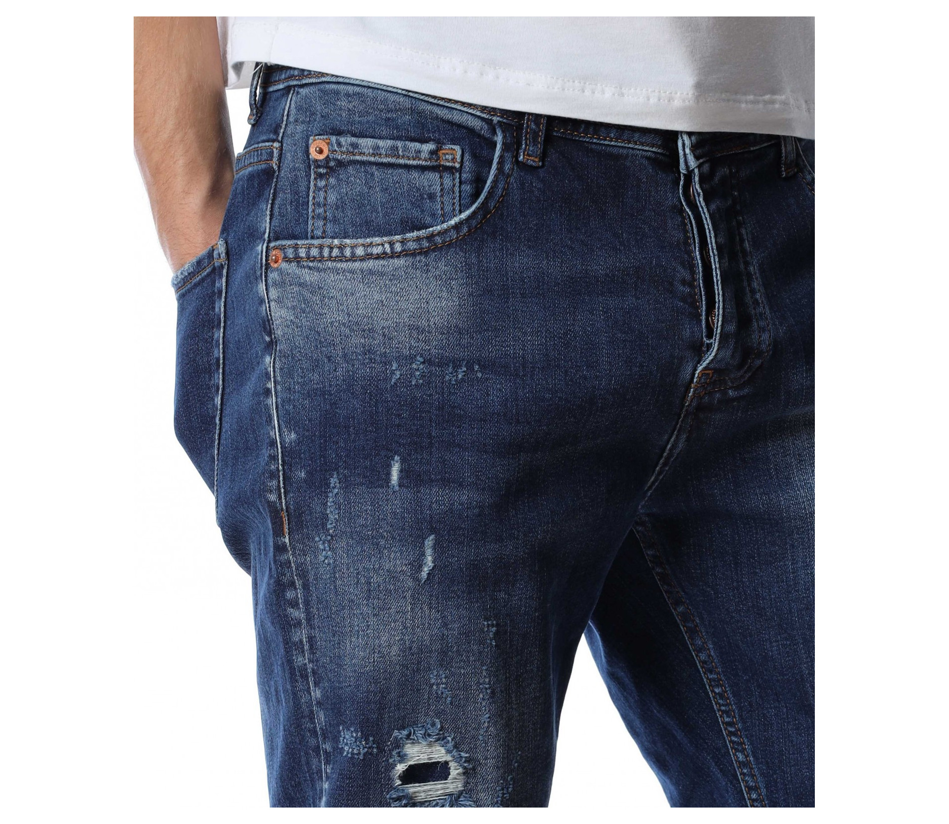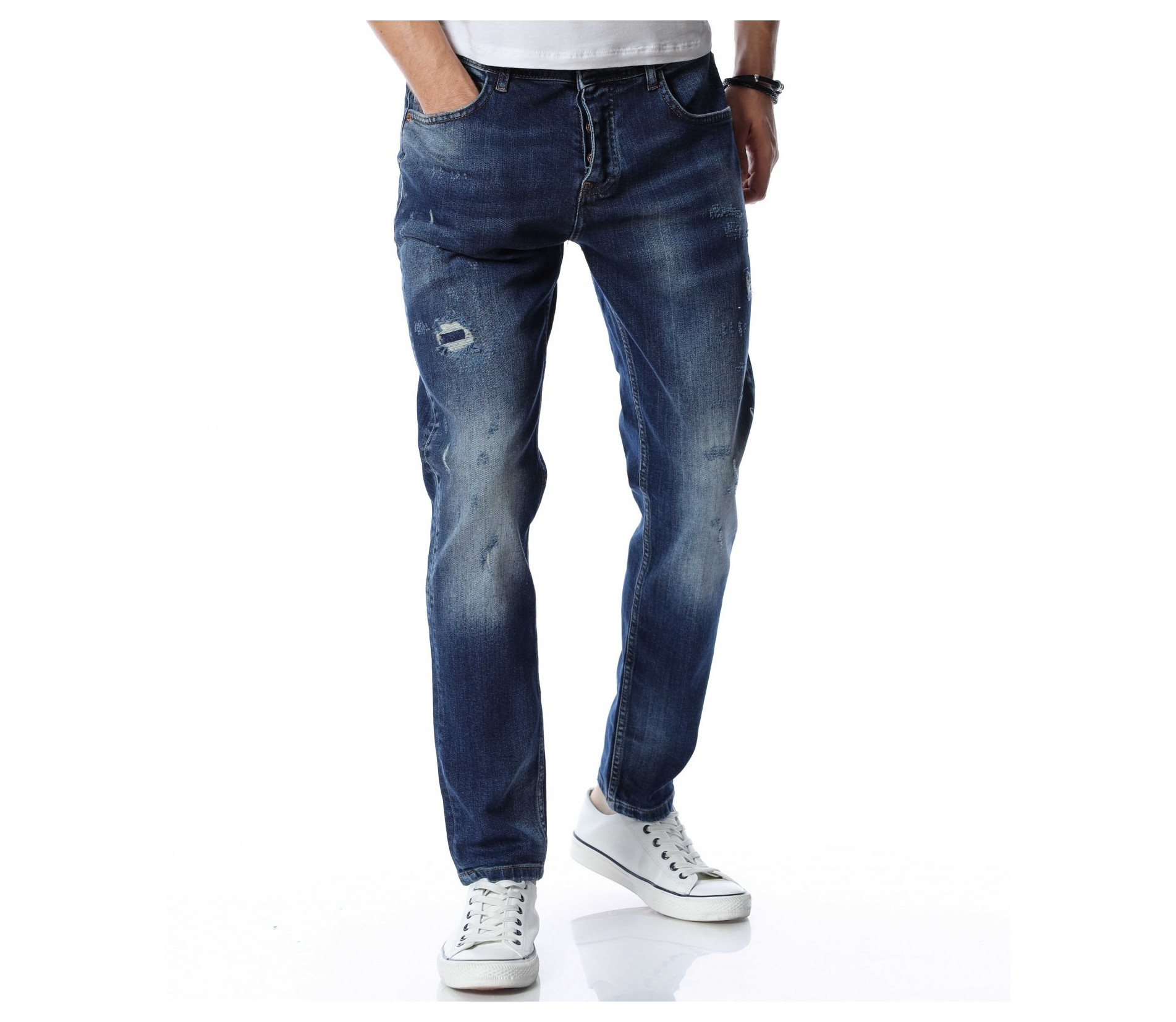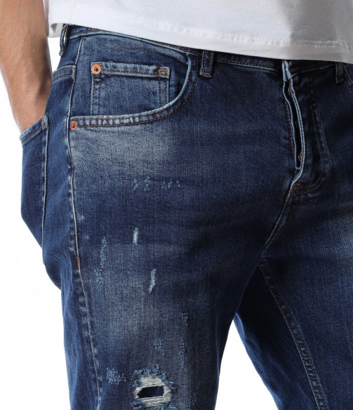 Мъжки, дълъг, син дънков панталон с кройка във вариант regularfit, който следва линиите на тялото. Моделът акцентира с контрастни, изсветлени елементи и леко надрани и протрити на места детайли. Забелязваме стандартните, отворени джобове, както в предната, така и в задната част. Закопчаването се състои в цип и копче, а на талията са разположени гайки, към които може да добавите колан. Комбинирайте с блуза и кецове.