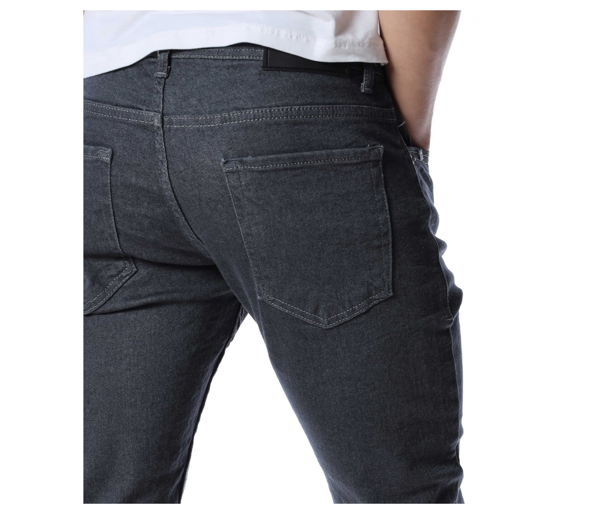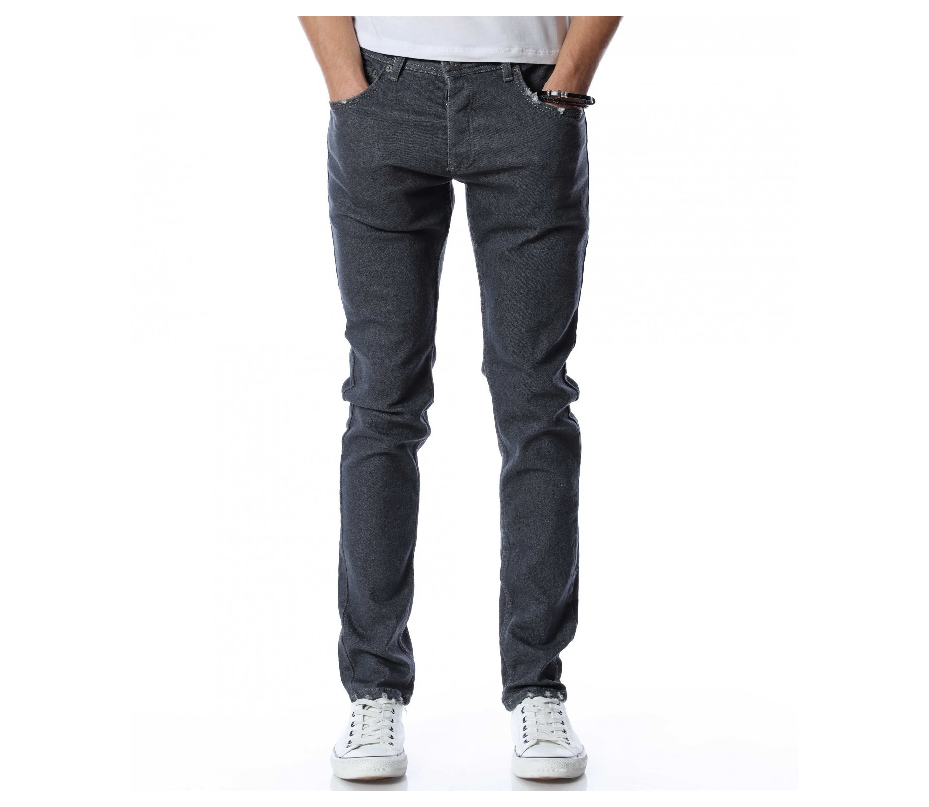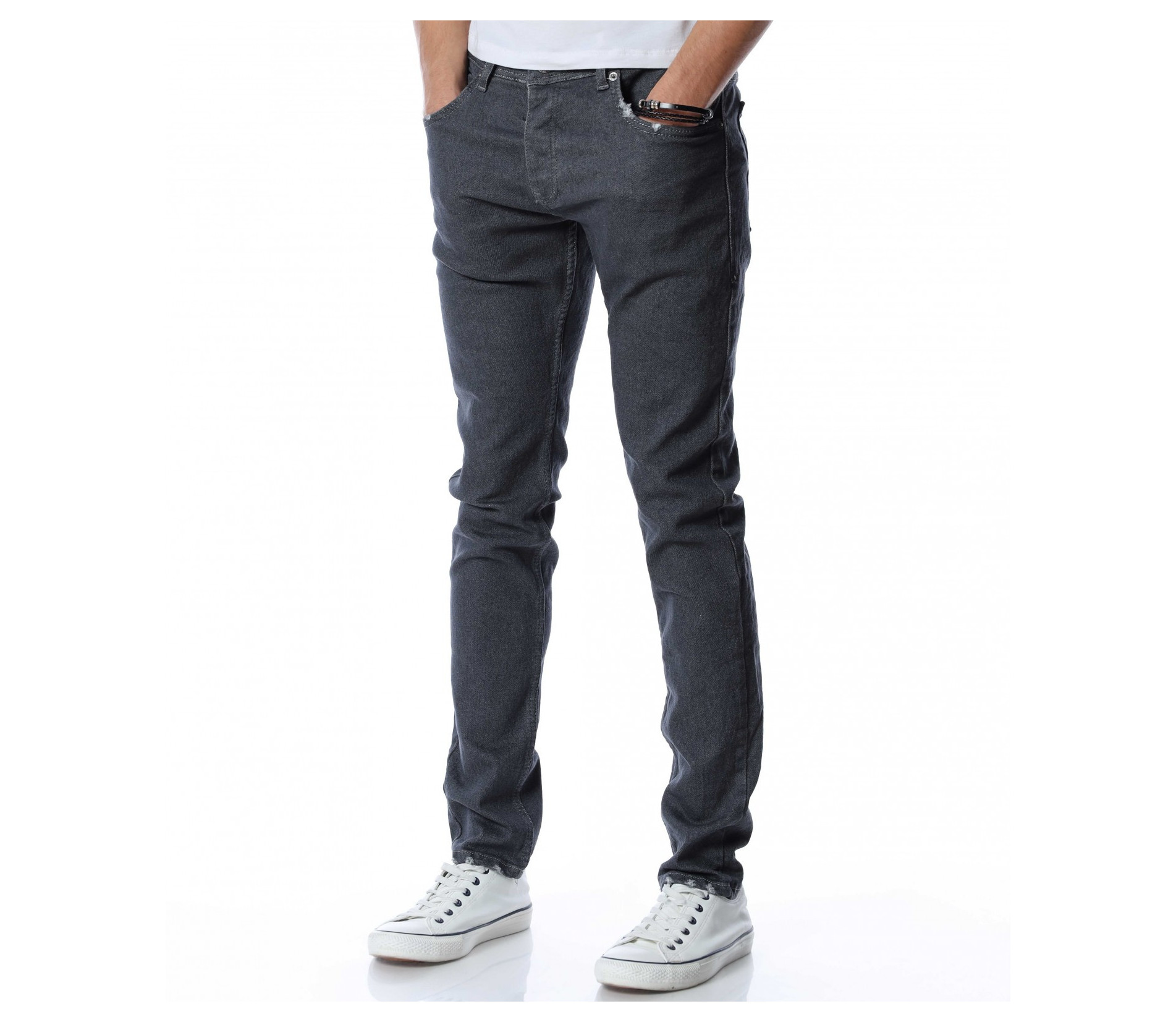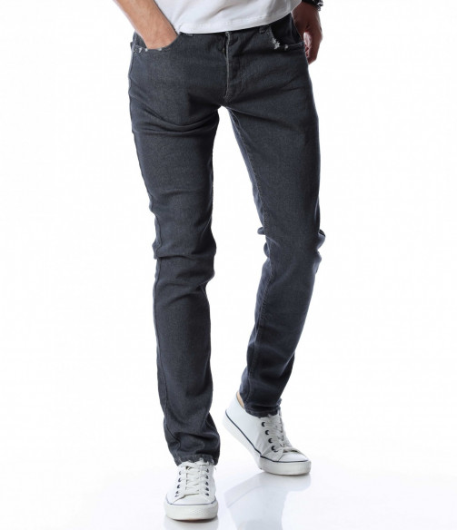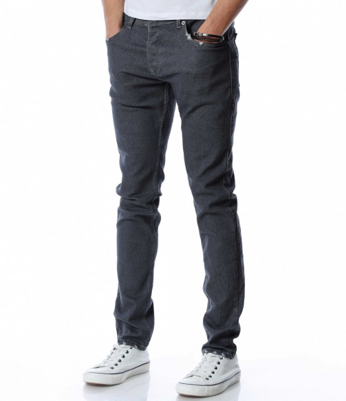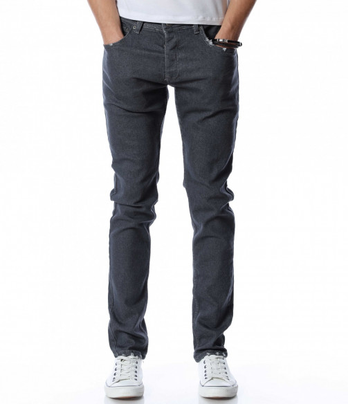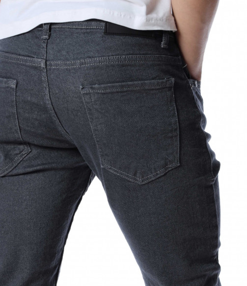 Мъжки, дълъг, сив дънков панталон с кройка във вариант slimfit, който следва линиите на тялото и същевременно осигурява достатъчна свобода на движение. Моделът е в напълно изчистен, класически вариант. Забелязваме стандартните, отворени джобове, както в предната, така и в задната част. Материята придава на тялото комфорт и лекота. Закопчаването се състои в цип и копче, а на талията са разположени гайки, към които може да добавите колан. Комбинирайте с блуза и кецове.