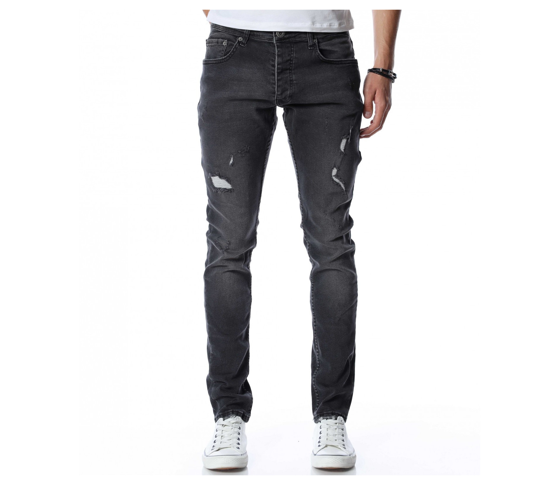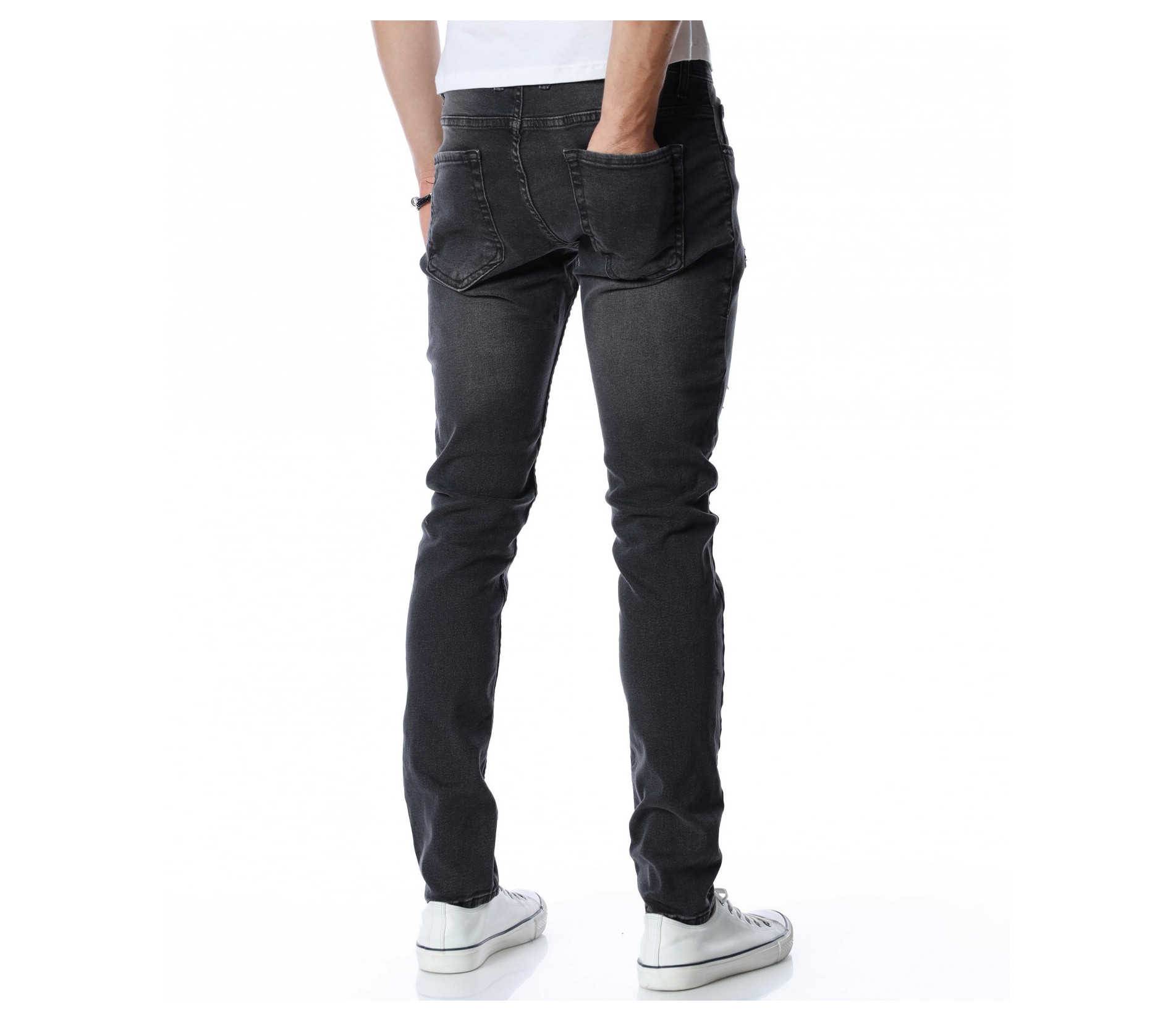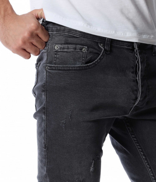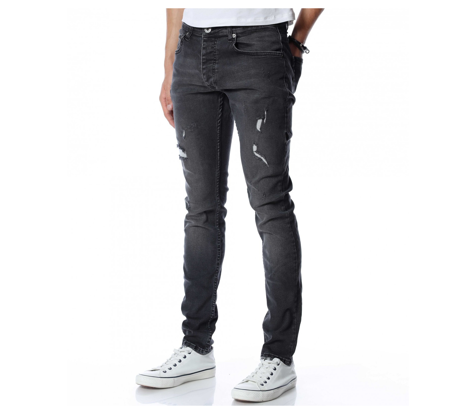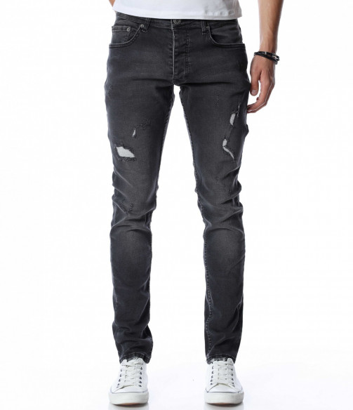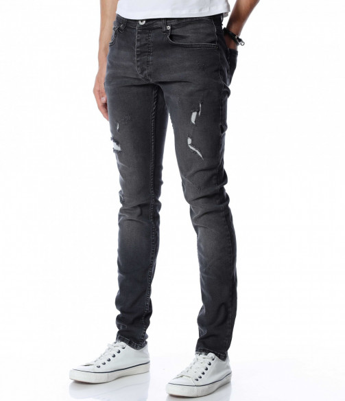 Мъжки, дълъг, сив дънков панталон с кройка във вариант slimfit, който следва линиите на тялото. Моделът акцентира с кръпки с бели нишки по цялата част и леко надрани ефекти. Забелязваме стандартните, отворени джобове, както в предната, така и в задната част. Закопчаването се състои в цип и копче, а на талията са разположени гайки, към които може да добавите колан. Комбинирайте с блуза и кецове.